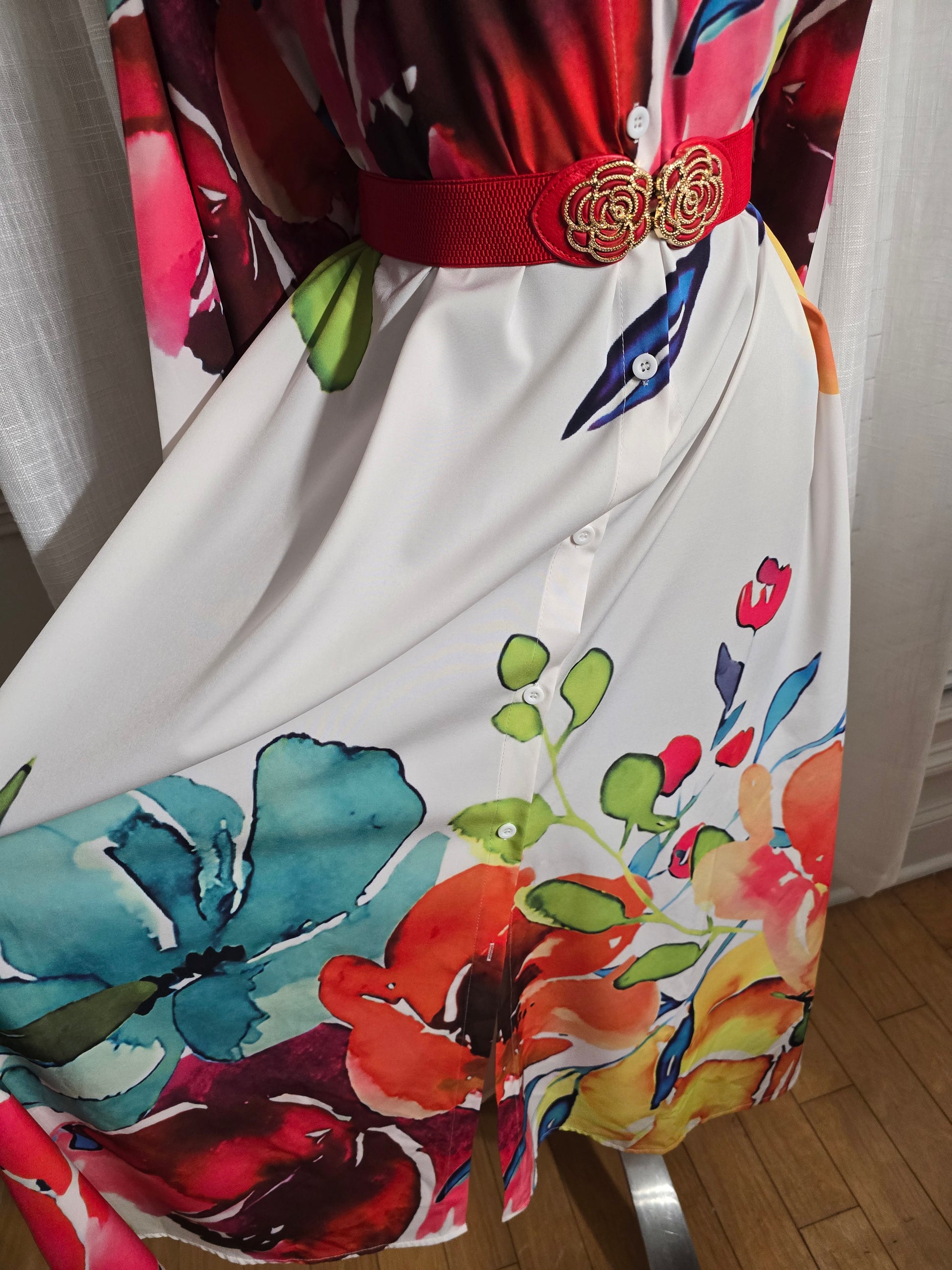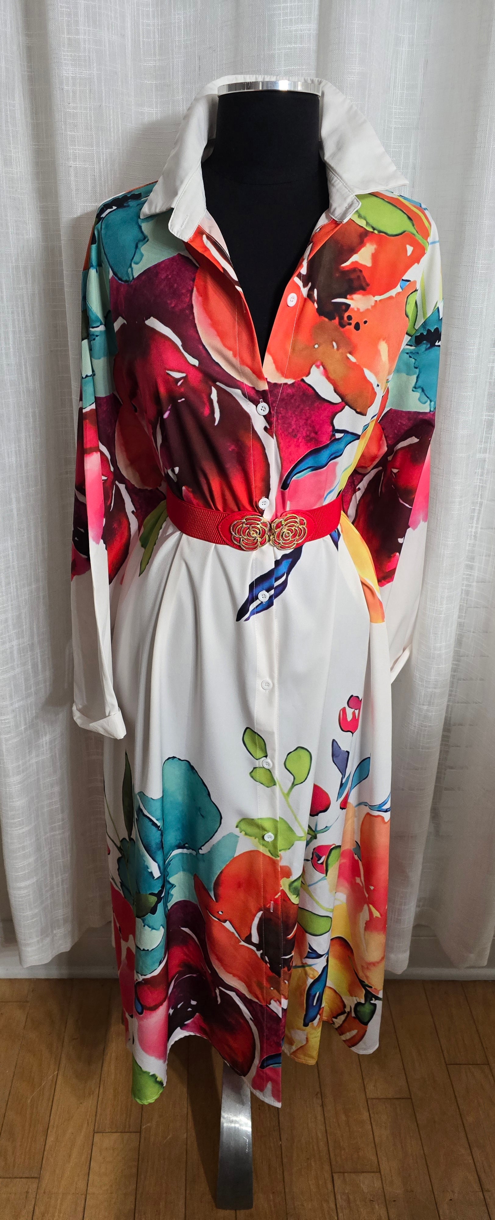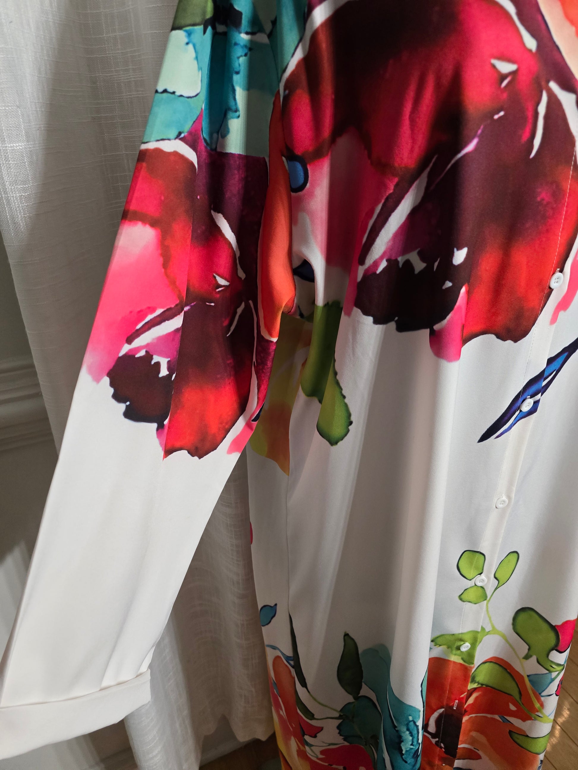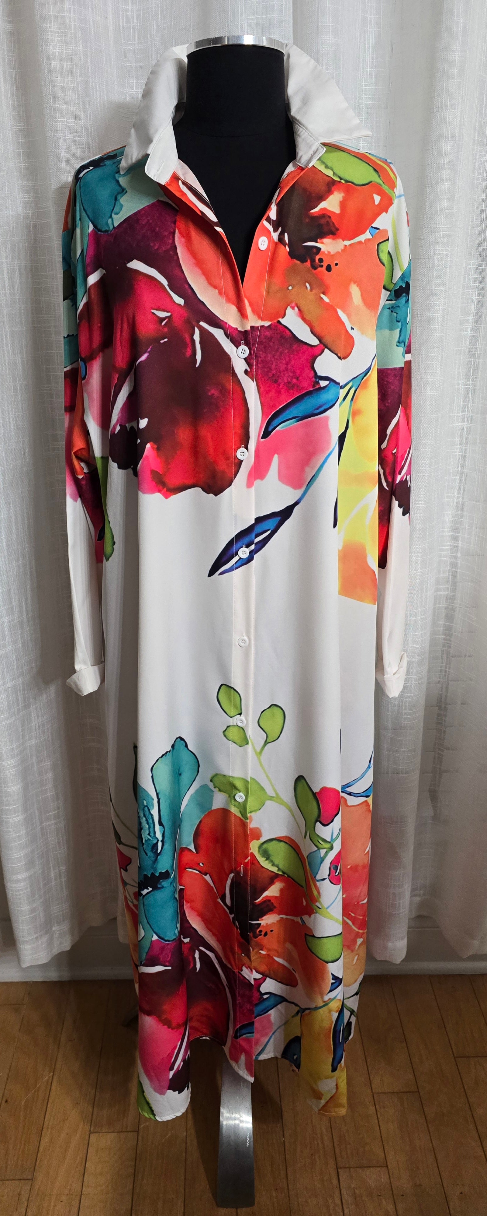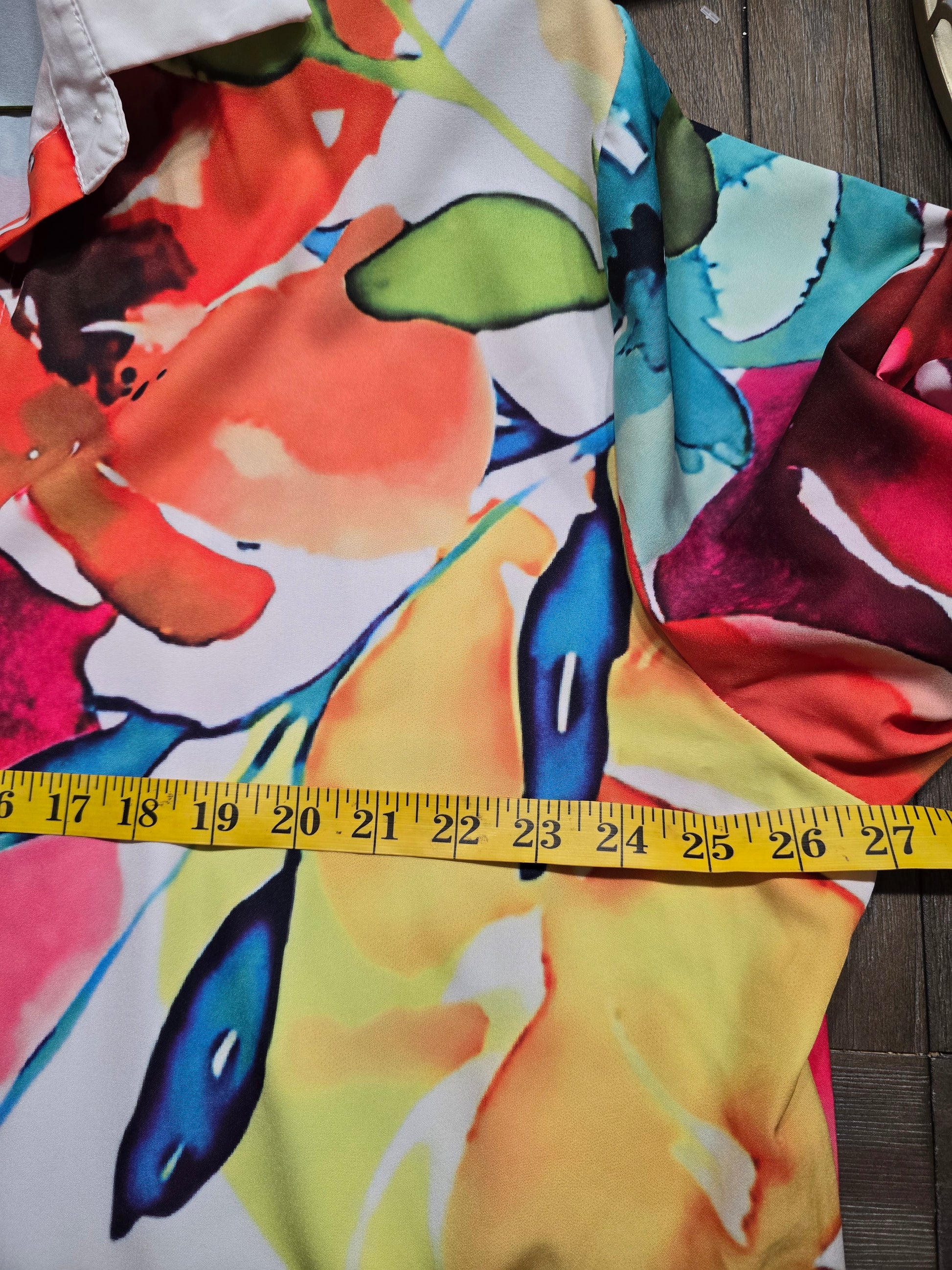 Abstract Dress/Tunic in Size 3X. Multicolored elegance with a hint of stretch, this versatile piece can be worn as a dress, duster, or tunic. Effortlessly elevate your wardrobe with this chic beauty. PTP 27".