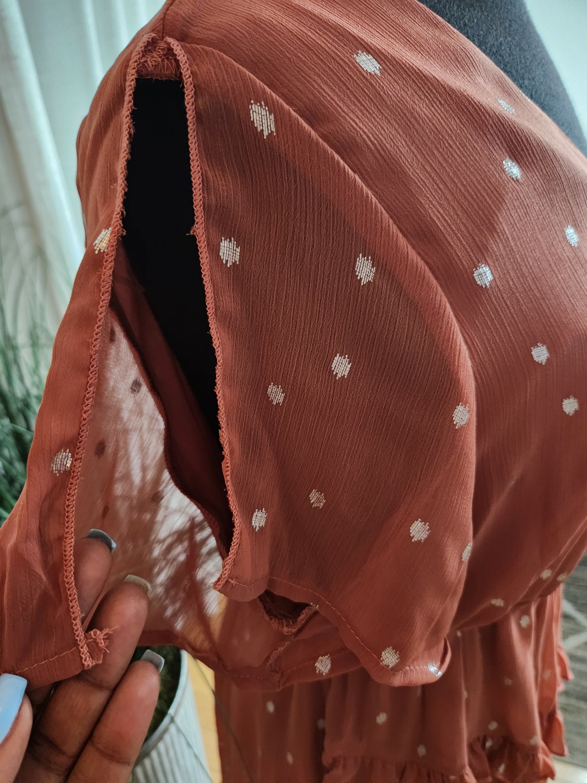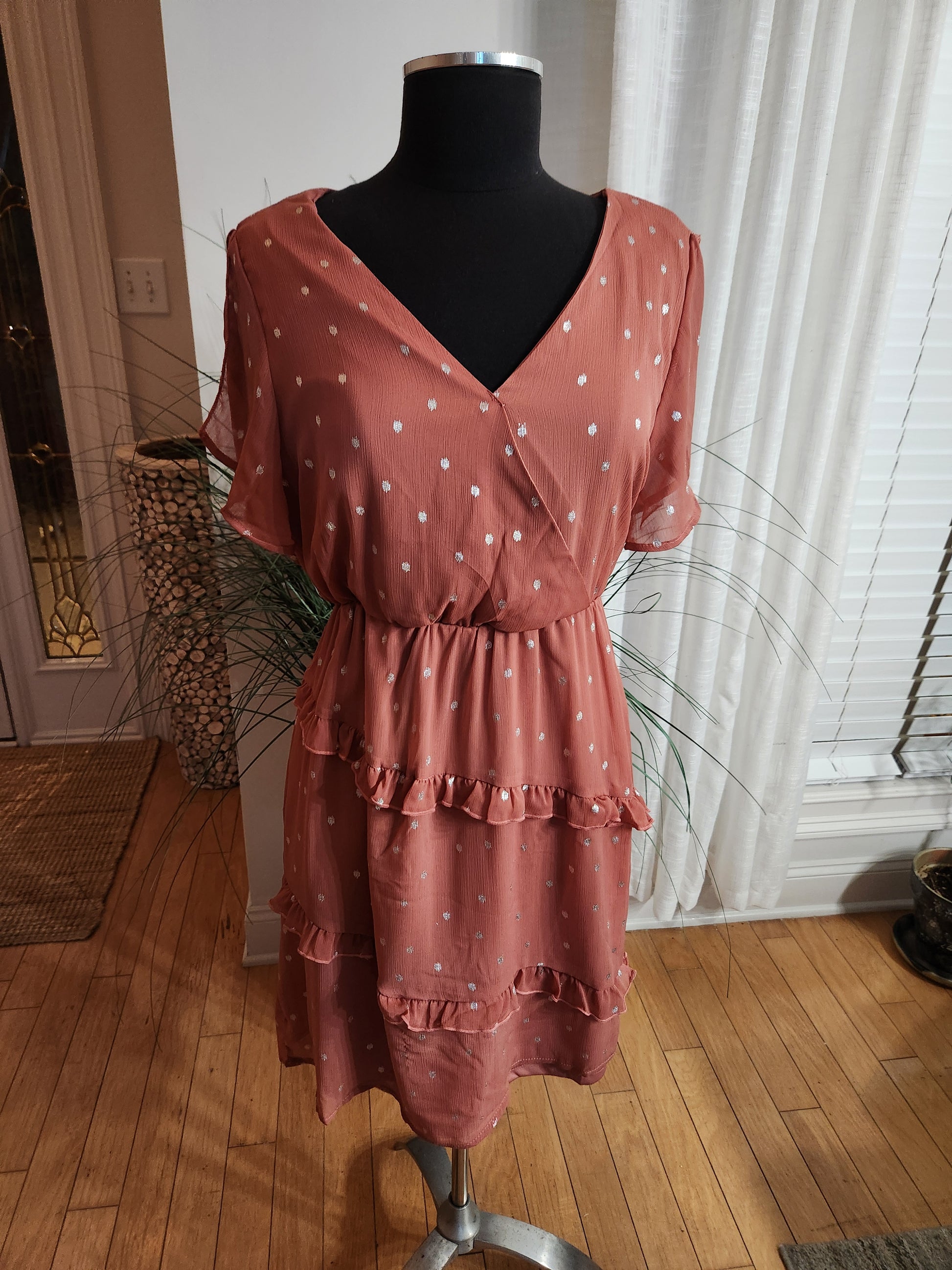 Adrienne Vitadini Dress in size XL. This stunning piece boasts a ruffle tiered design, split sleeves, and elastic waist, making it perfect for your next dressy occasion. Has silver polka dot accents. Brand new with tags and fully lined, this dress will make you feel elegant and exclusive. Upgrade your wardrobe with this must-have piece.