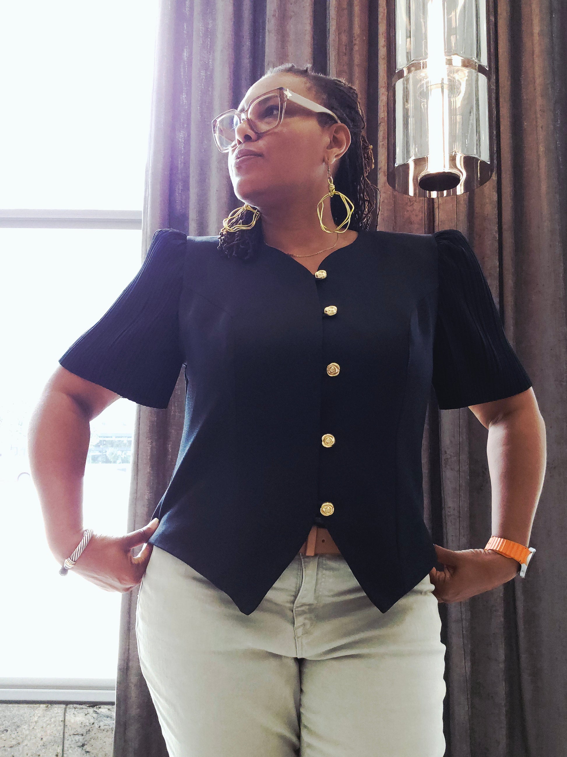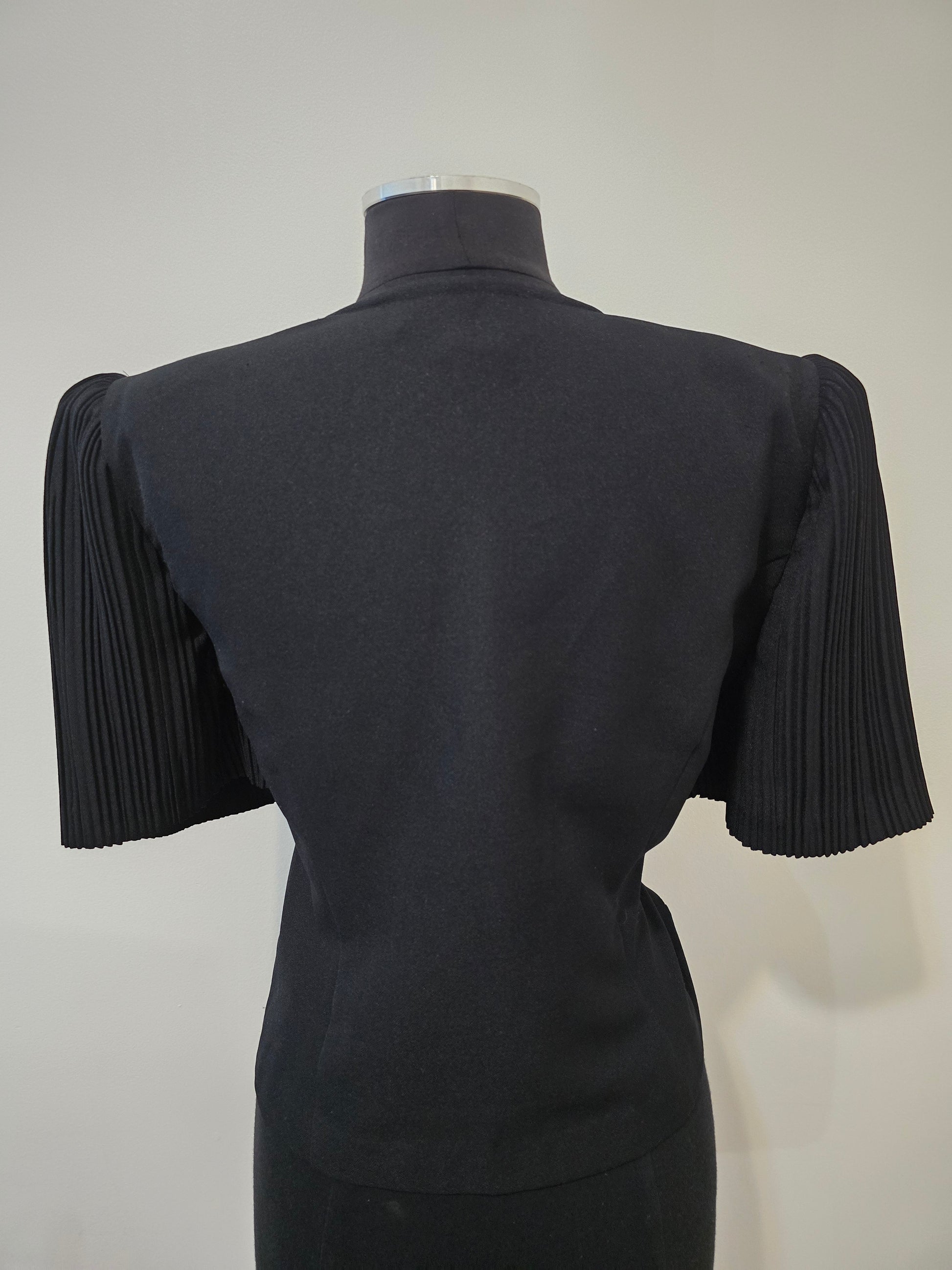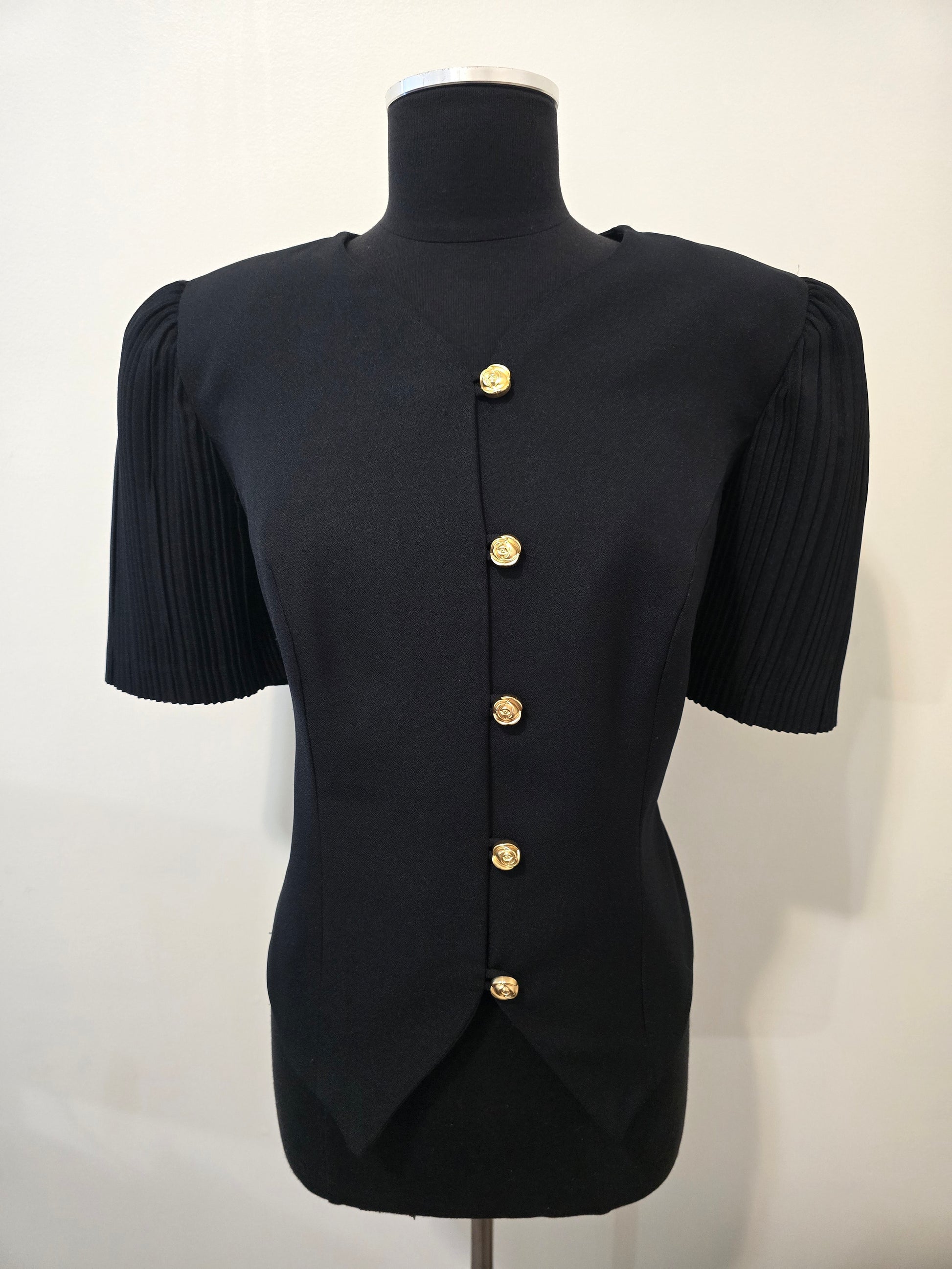 Effortlessly elevate your wardrobe with the Amato Vintage Blazer/Blouse. This stunning piece features short pleated sleeves and vintage gold rose buttons for a touch of elegance. Perfect for a vintage-inspired look that is both timeless and chic. Available in size 12/14. PTP 23" flat. Fabric polyester, no stretch.