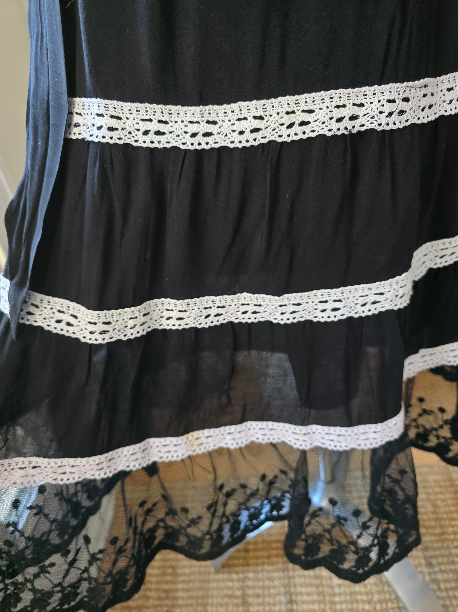 Steylish Angie Black & White Dress Sz S! This pre-loved dress is lined, has elastic back, laced hem, and adjustable straps for a comfortable and customizable fit. With a feminine and fun design, this dress is perfect for any occasion.