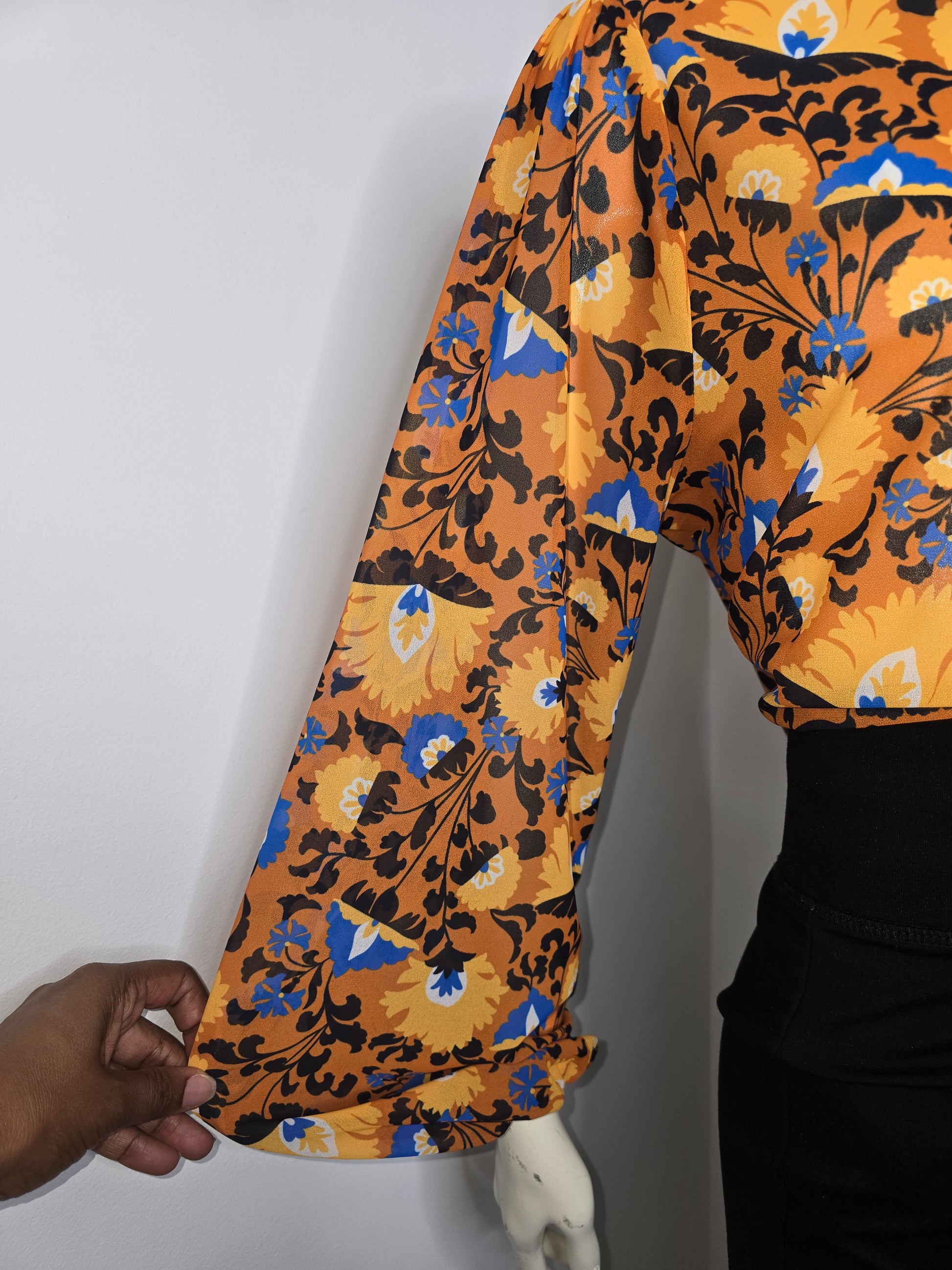 Autumn Scene Blouse in size L. The sophisticated ruffle neckline and balloon sleeves exude luxury. The earthtone print and keyhole closure add a touch of elegance. Made from high-quality polyester fabric, this blouse is a must-have for any fashion-forward woman. NWT. PTP 22".