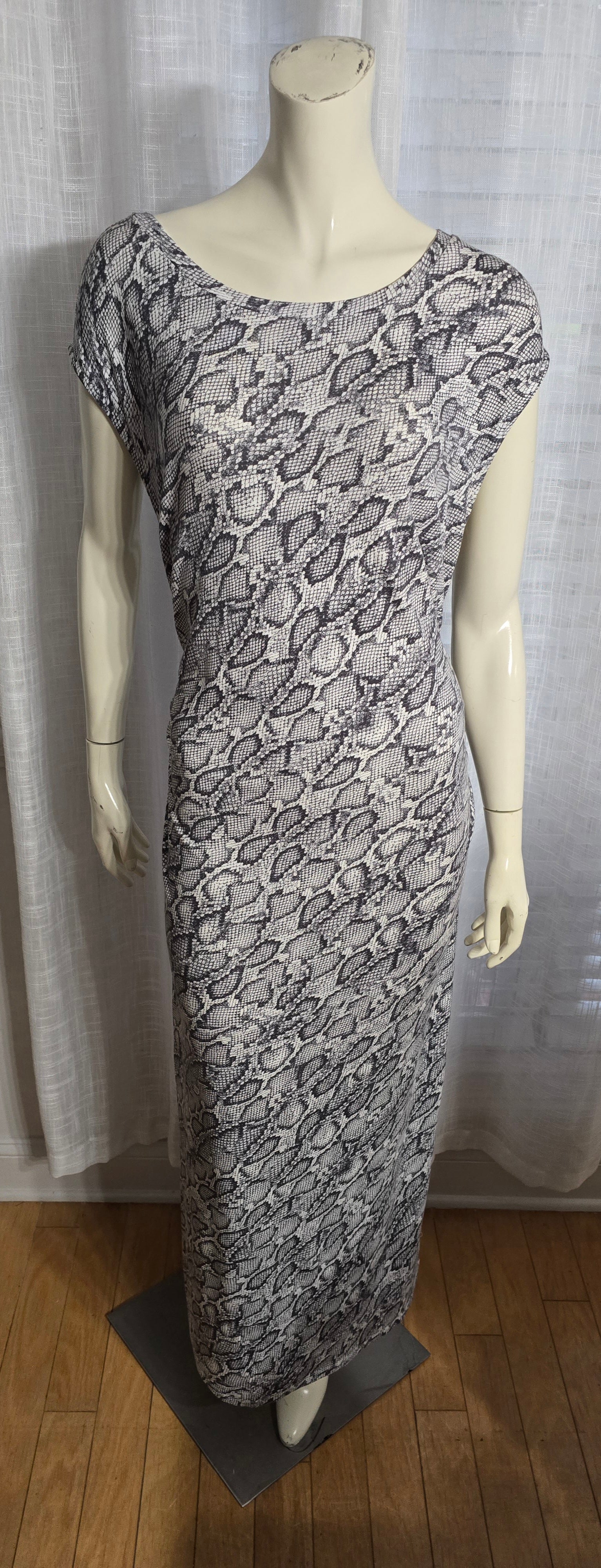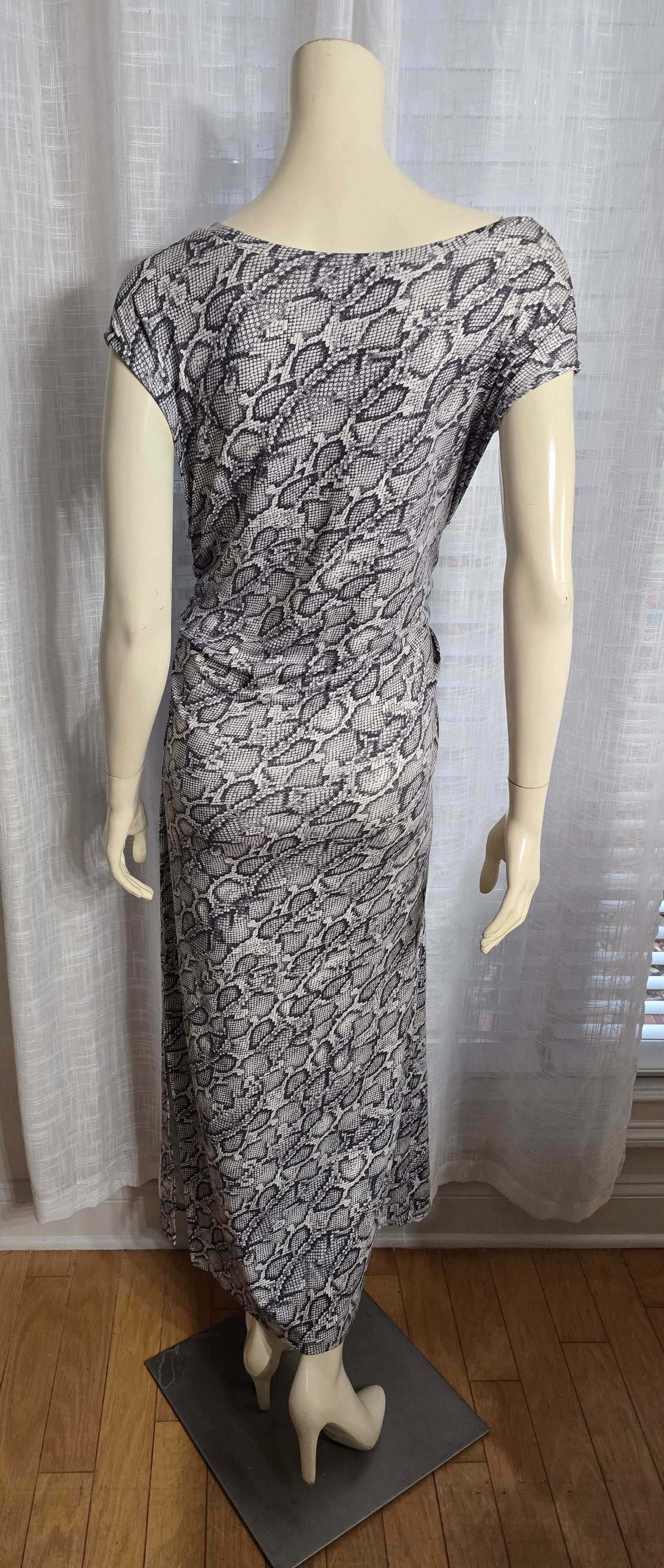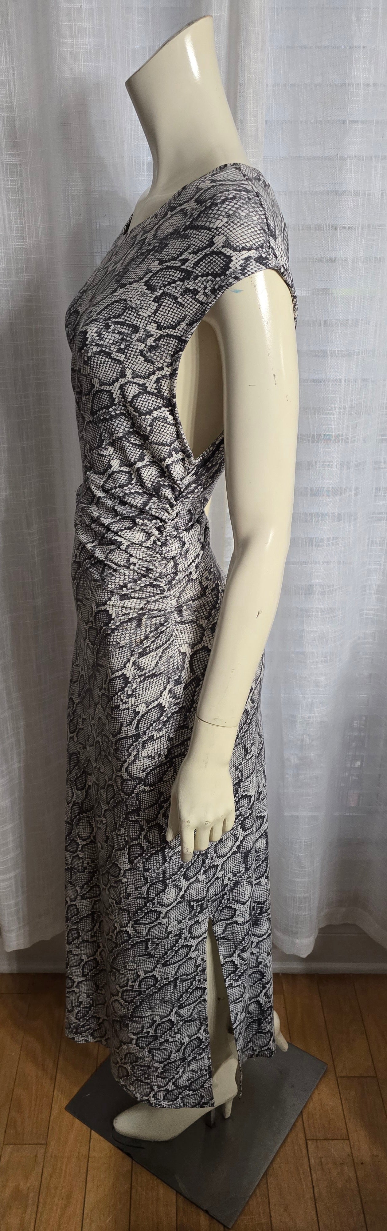 The bar III Snake Print Ruched Dress. With ruching on each side and a sultry split detail, this dress is designed to accentuate your curves. Crafted from a blend of rayon and spandex, it offers both comfort and stretch for a perfect fit. Elevate your style with this sophisticated and exclusive dress. Pre-loved, in excellent condition. PTP 24".