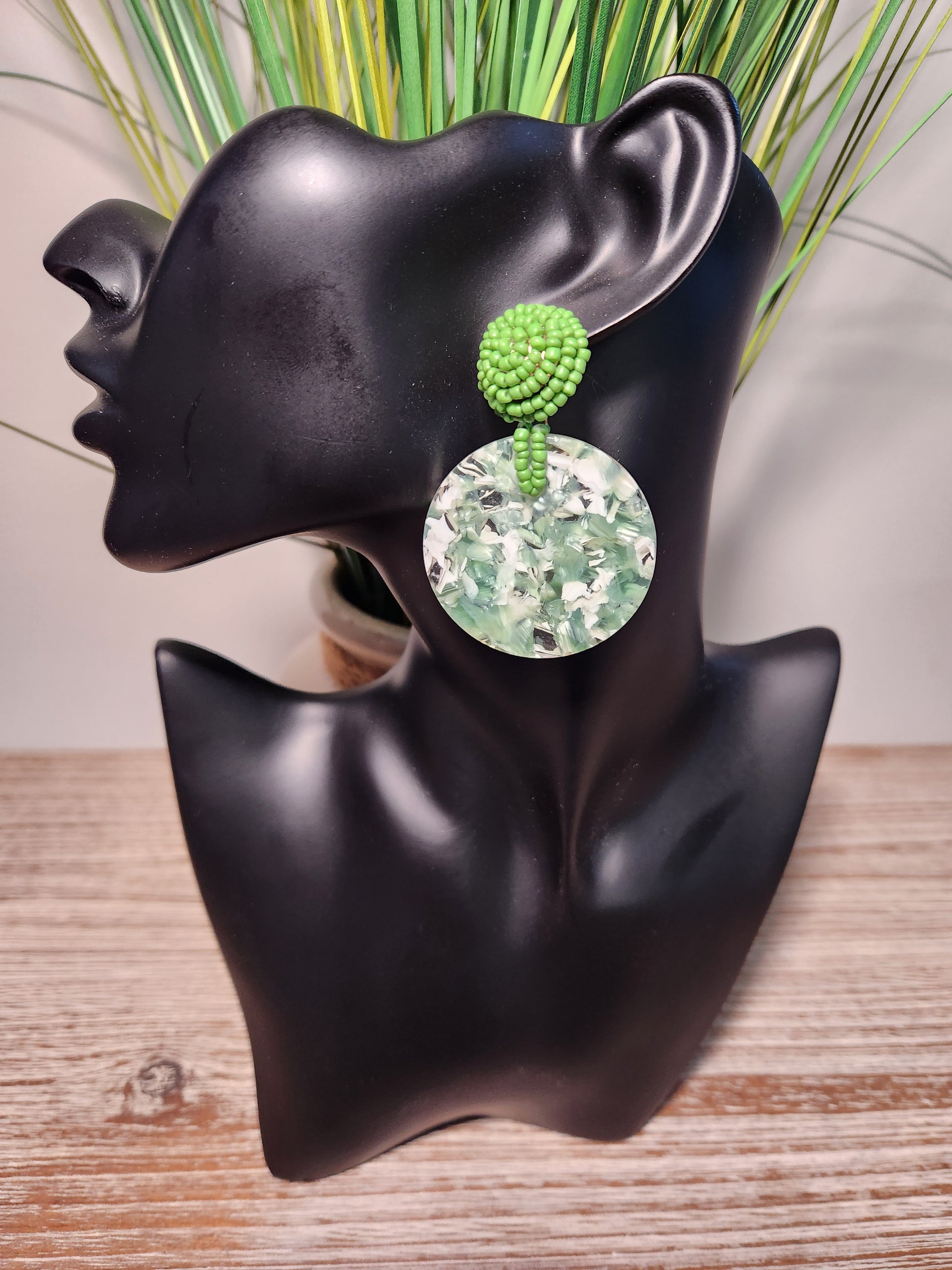 Elevate your style with our Beaded Green Disk Earrings. These medium weight earrings are crafted with intricate beadwork and acrylic, adding a touch of sophistication to any outfit. Lightweight and comfortable, these earrings are perfect for a night out or a day at the office. Length 3".