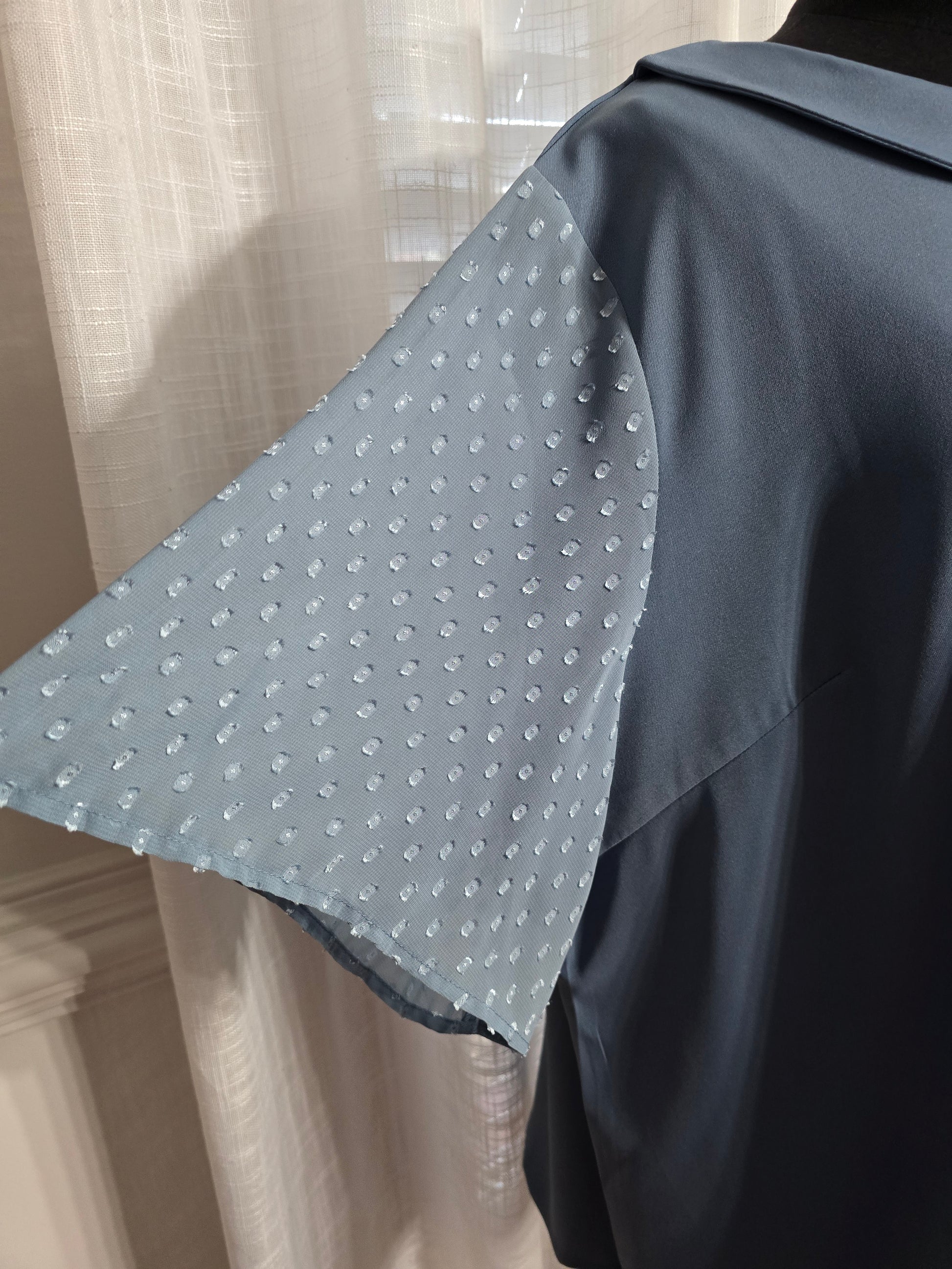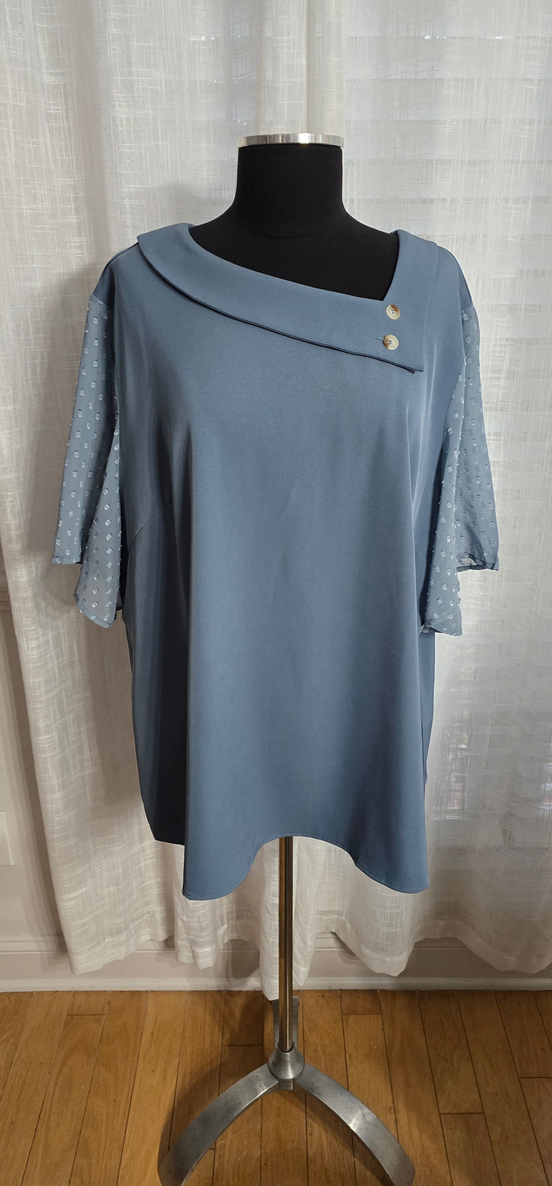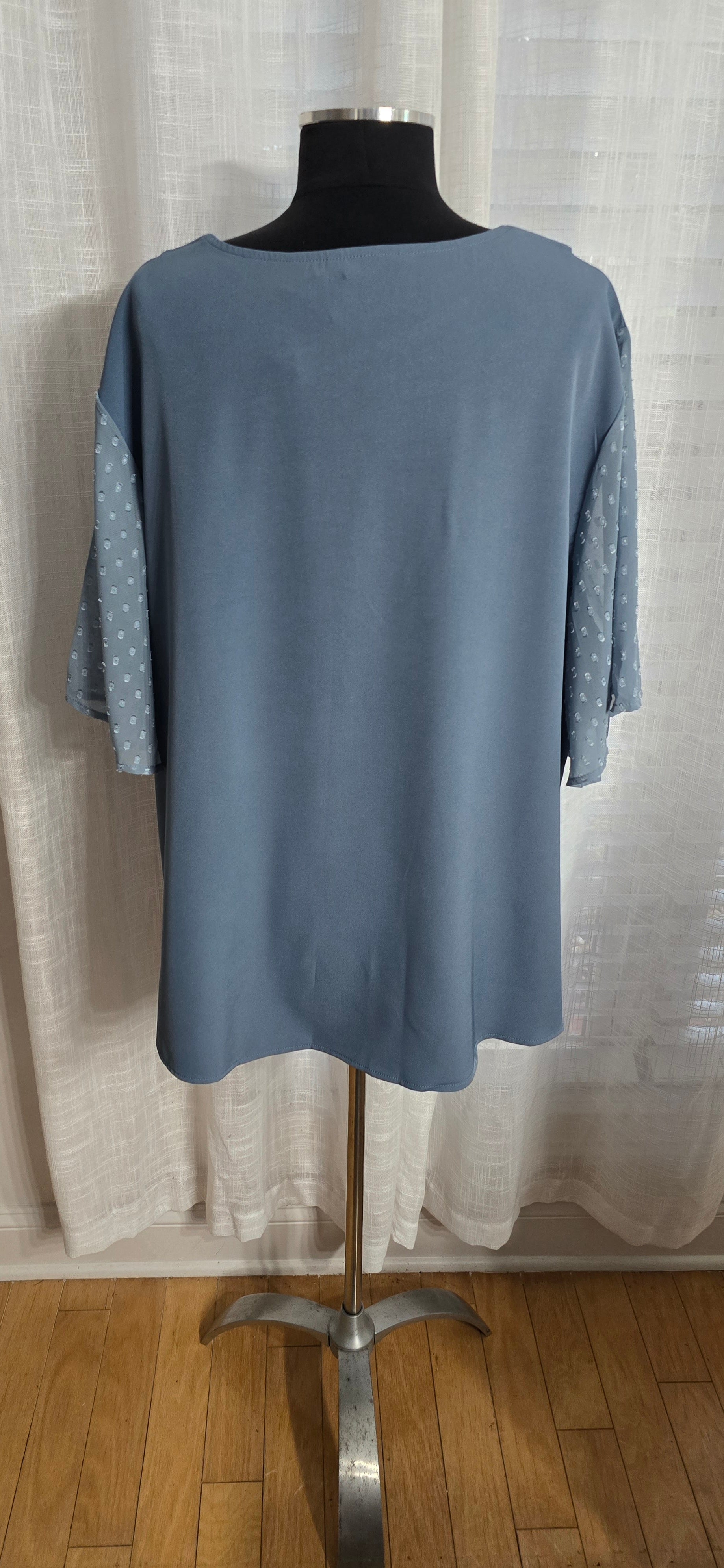Indulge in luxury with this NWT Bloomchic Blue Top. Crafted in smooth polyester and spandex fabric, this dressy blouse exudes elegance. Sheer Swiss Dot sleeves add a touch of sophistication. Perfect for sizes 22-24. Make a statement in style. PTP 27".