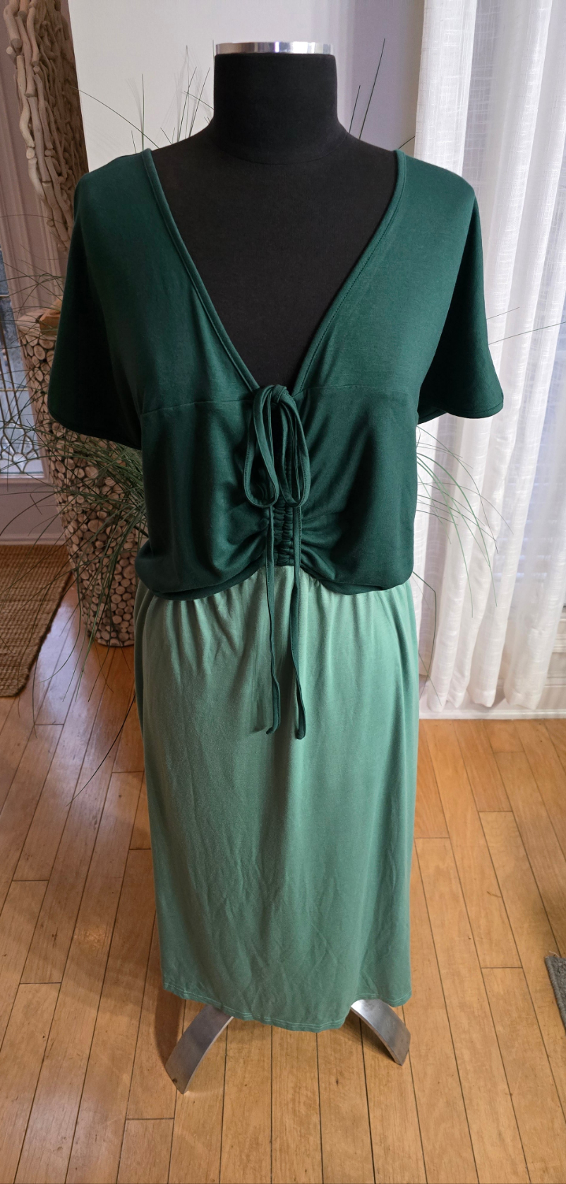 The BloomChic Green Two Tone Dress is a size 26 and features new with tags condition. It is made with stretch material, offering a comfortable fit and has an elastic waist for added comfort. With the addition of pockets, this dress combines style and practicality, making it a must-have for any wardrobe.