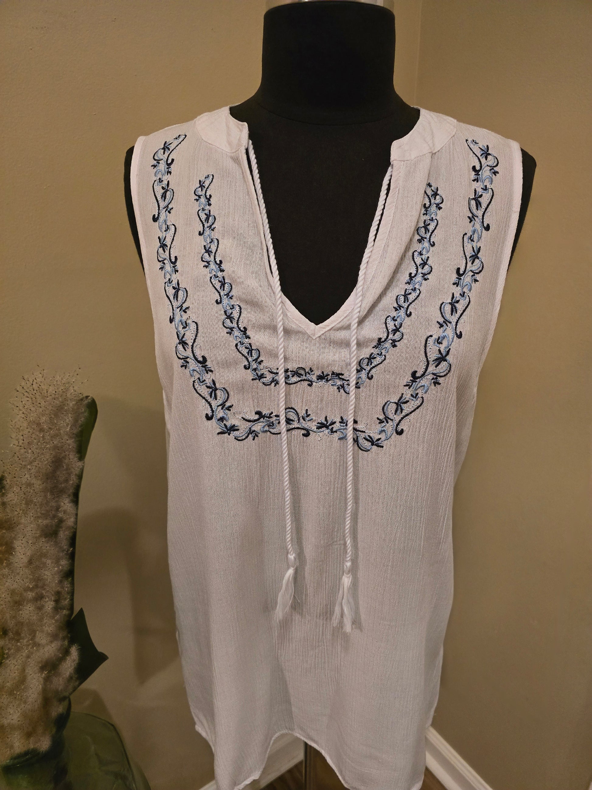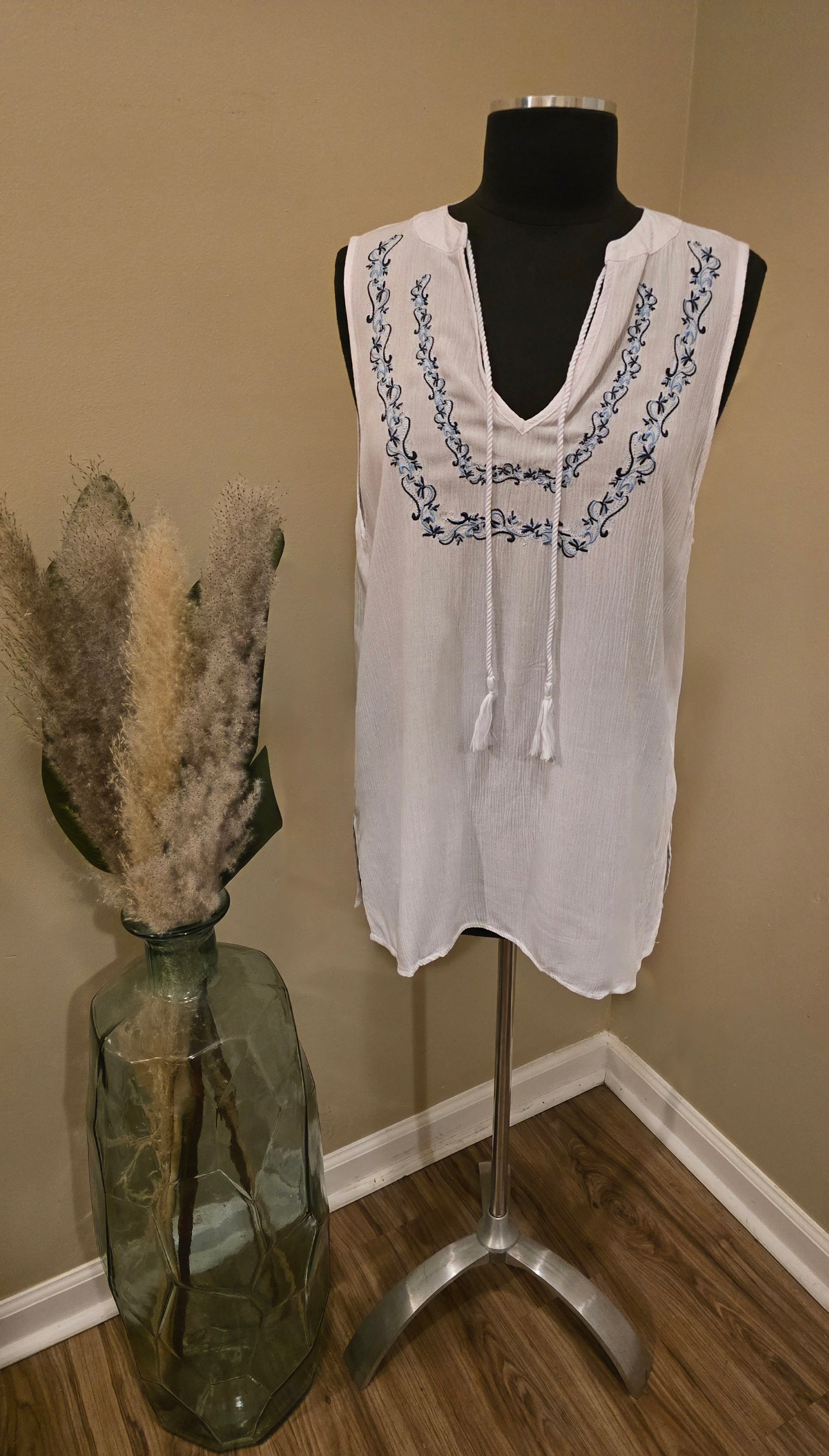 This By Design White Sleeveless Embroidered Tank is the perfect addition to any boho wardrobe. Its tassel detailing and side splits add a touch of flair, while its oversized cut ensures a comfortable fit for sizes medium and large. Stay stylish and cool this summer with this charming top. NWT.