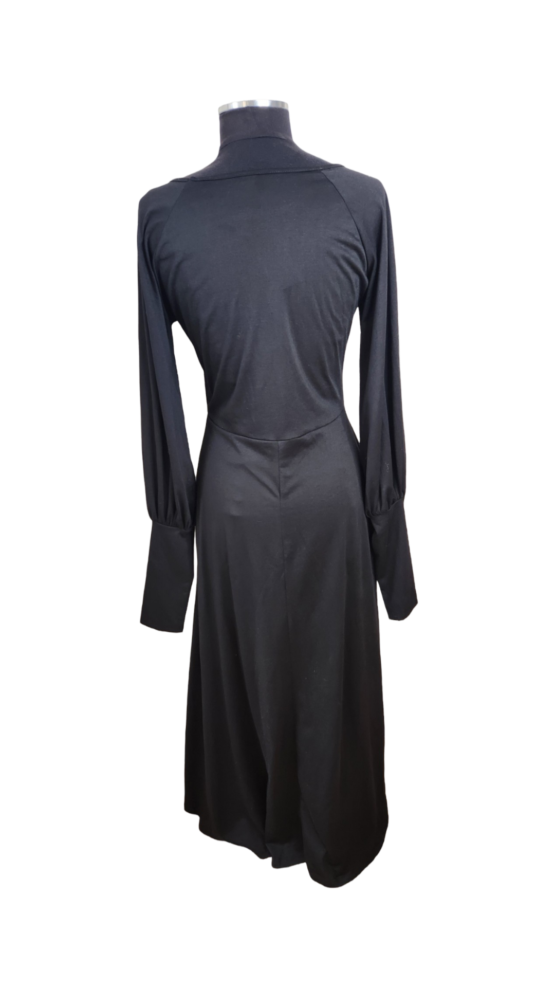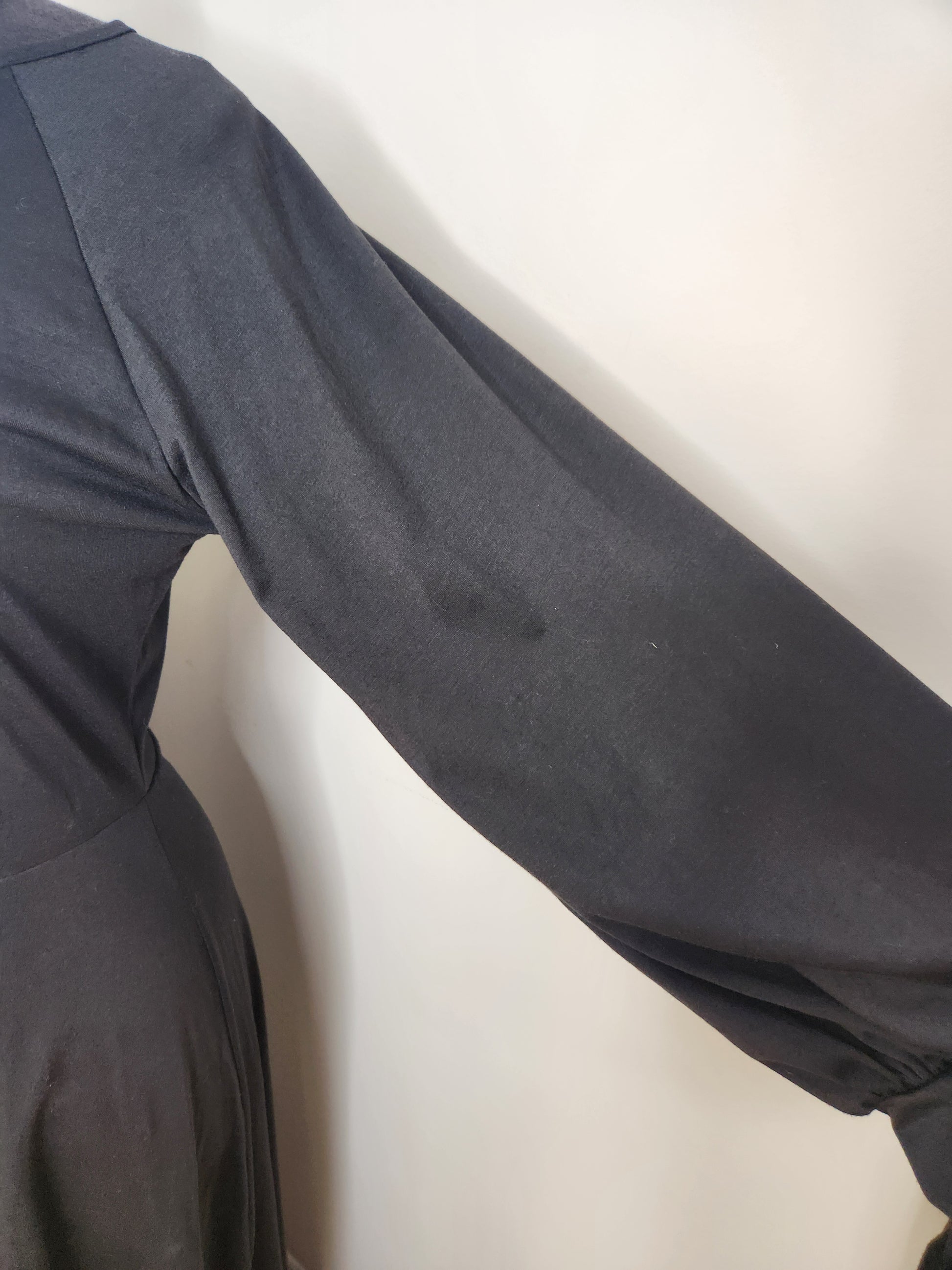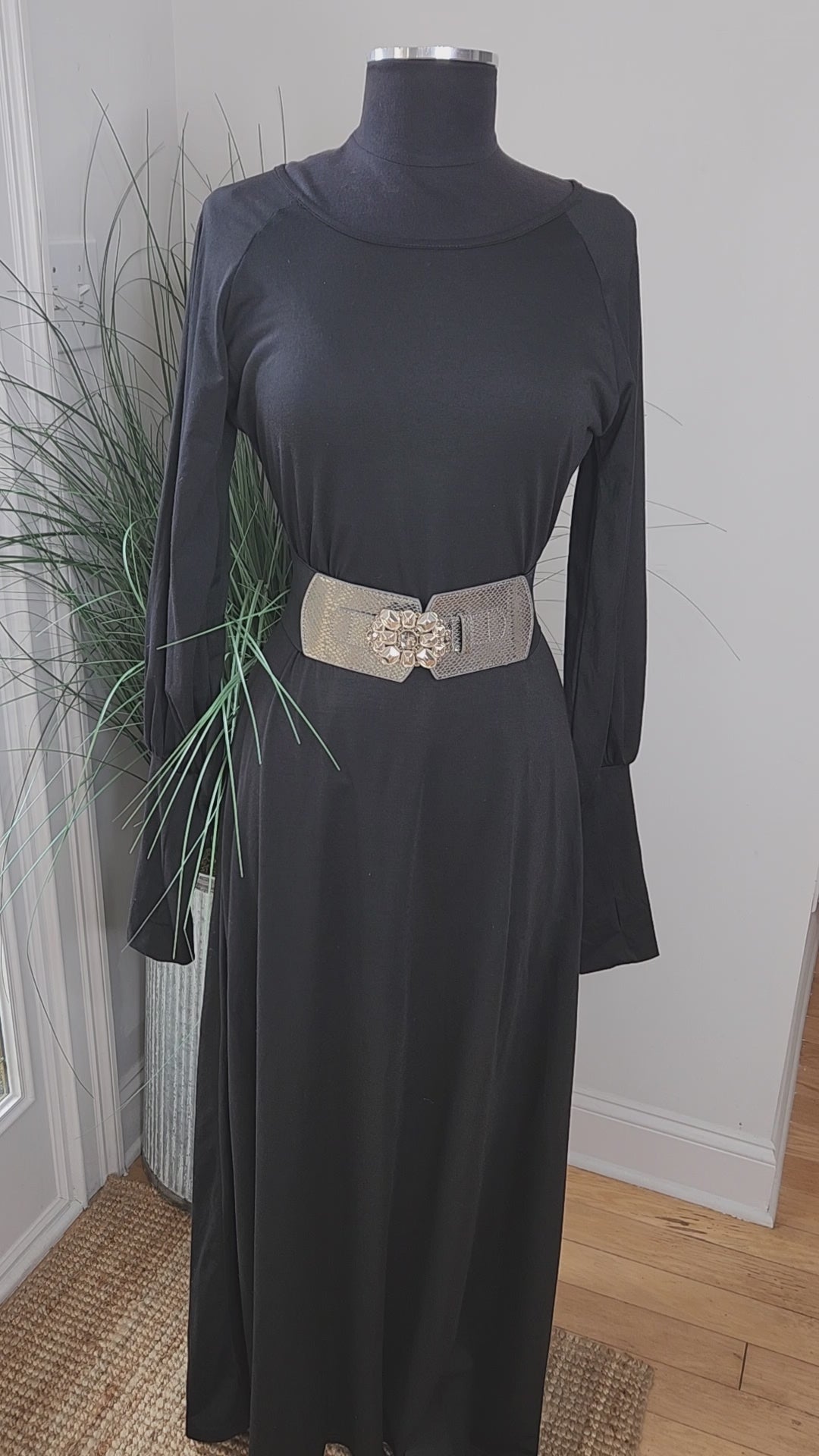 Meet the Carmen maxi dress. Elegant, yet simple with a boat neckline and balloon sleeves. Belt not included. Tag shows a size large, but this is a size medium. Fabric is 95% polyester and 5% spandex.
