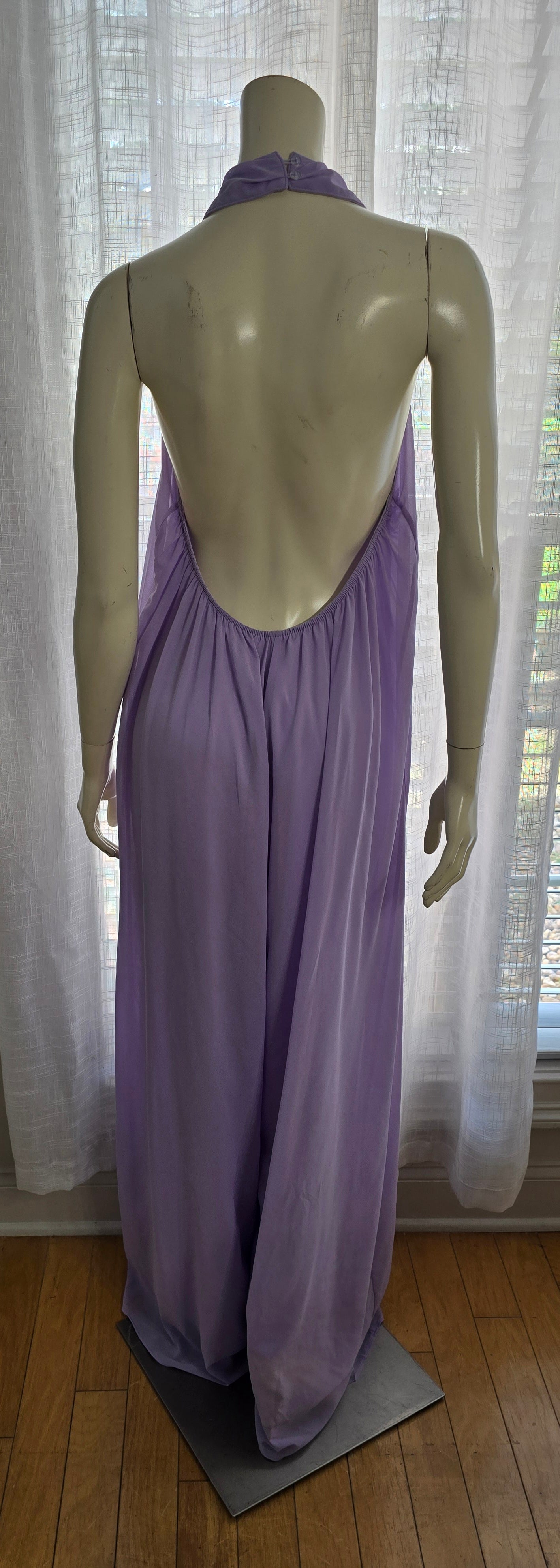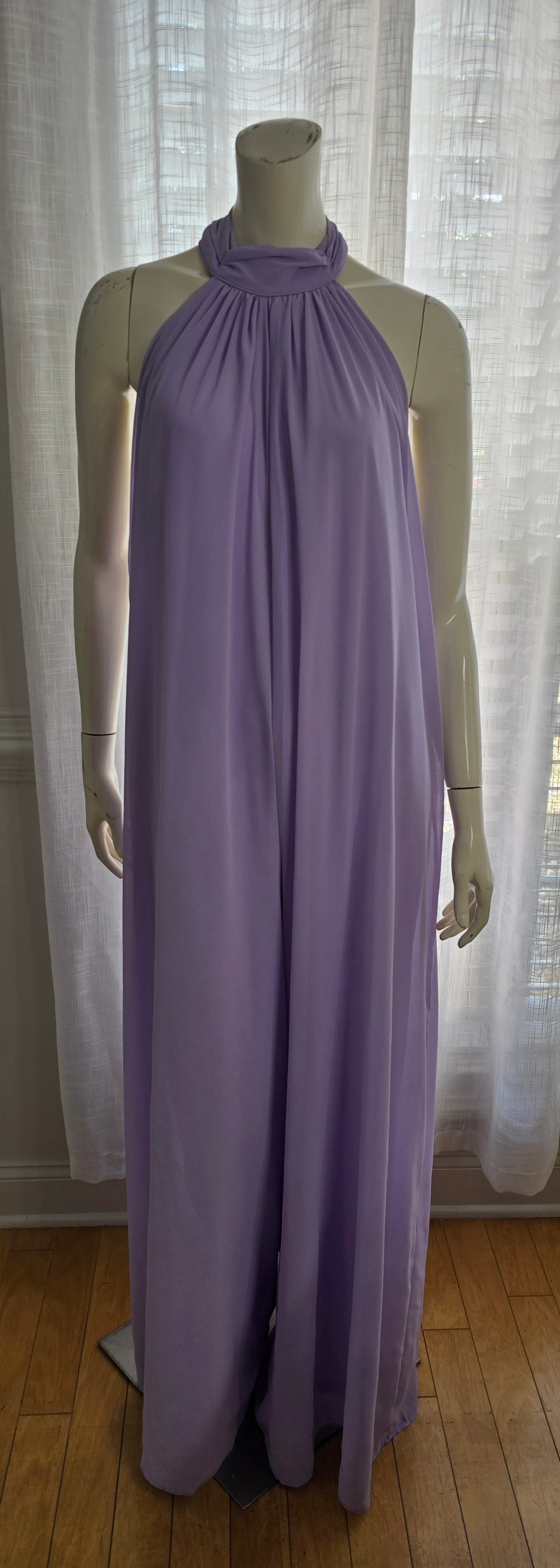 Elegant halter jumpsuit. Lined for a comfortable fit, this chiffon jumpsuit features a flattering wide leg design and beautiful light purple color. With elastic in the back and a button closure at the neck, it's both stylish and practical. Available in size L/XL. Great for a tall woman. Inseam 32.5"