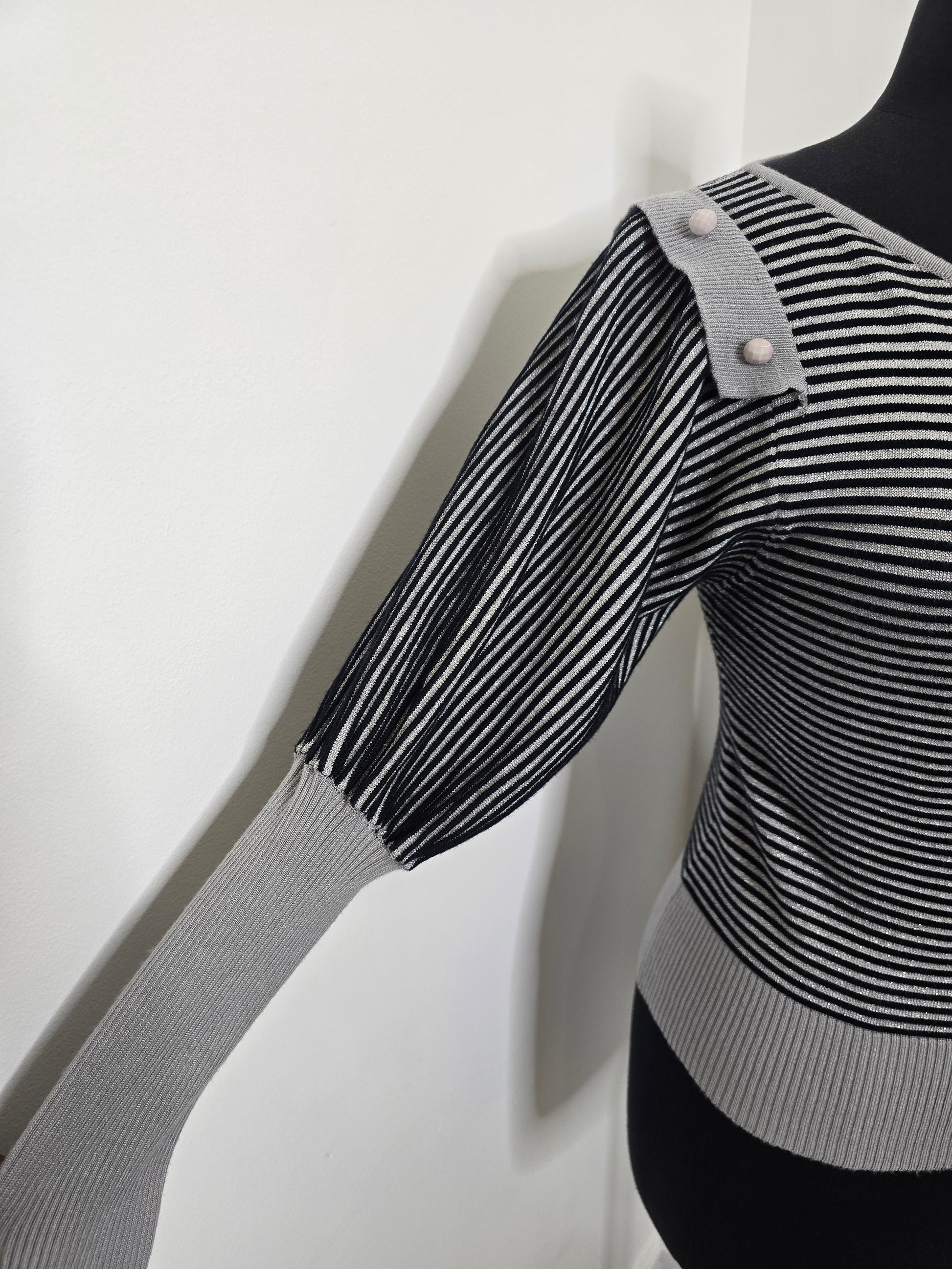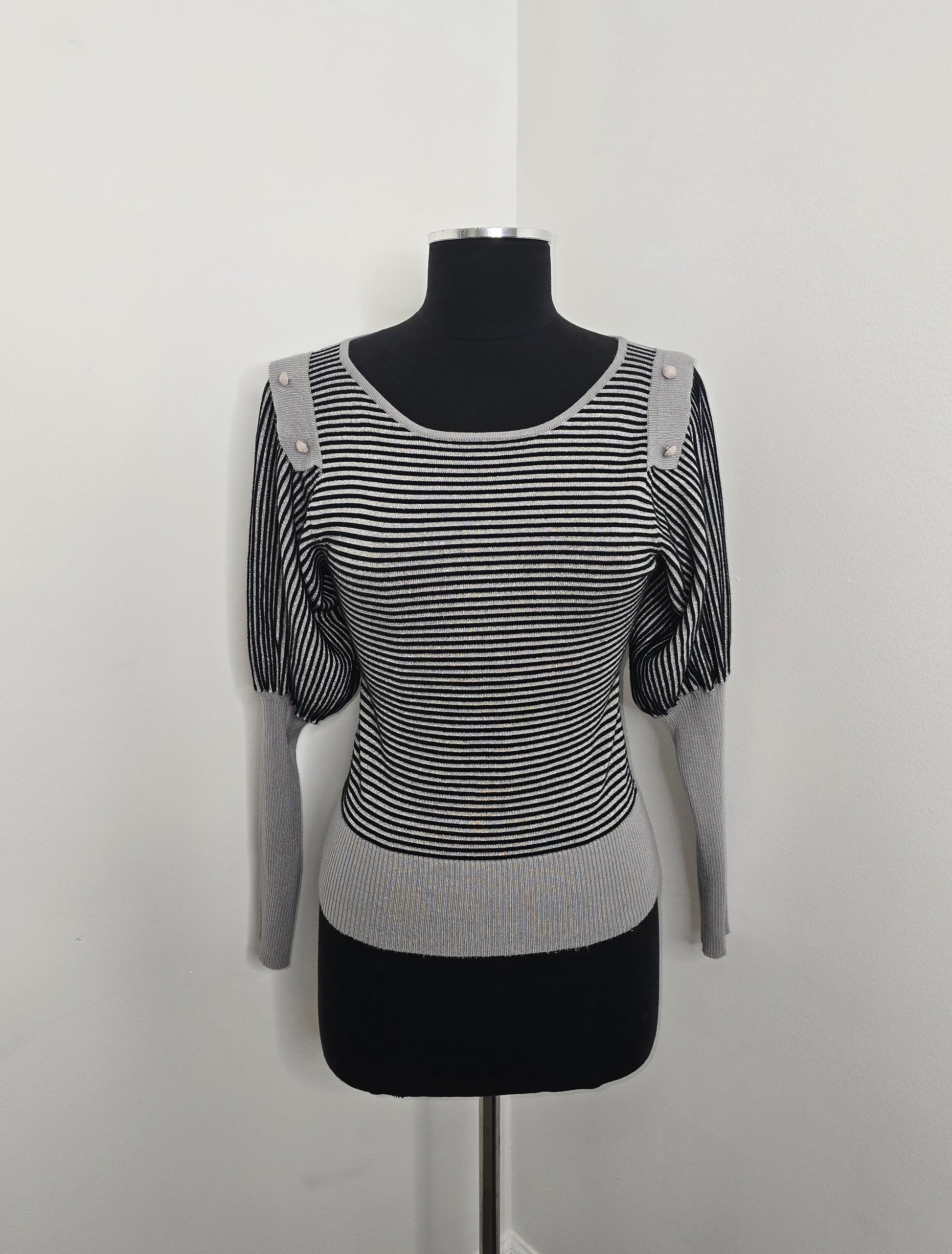 Add vintage vibes with this cute Color Cnaba Striped Ballon Sleeve Sweater. Featuring black, grey, and silver stripes and charming button accents, this sweater is both fashionable and functional with its stretchy material. Stay cozy and stylish this season with this must-have addition to your wardrobe.