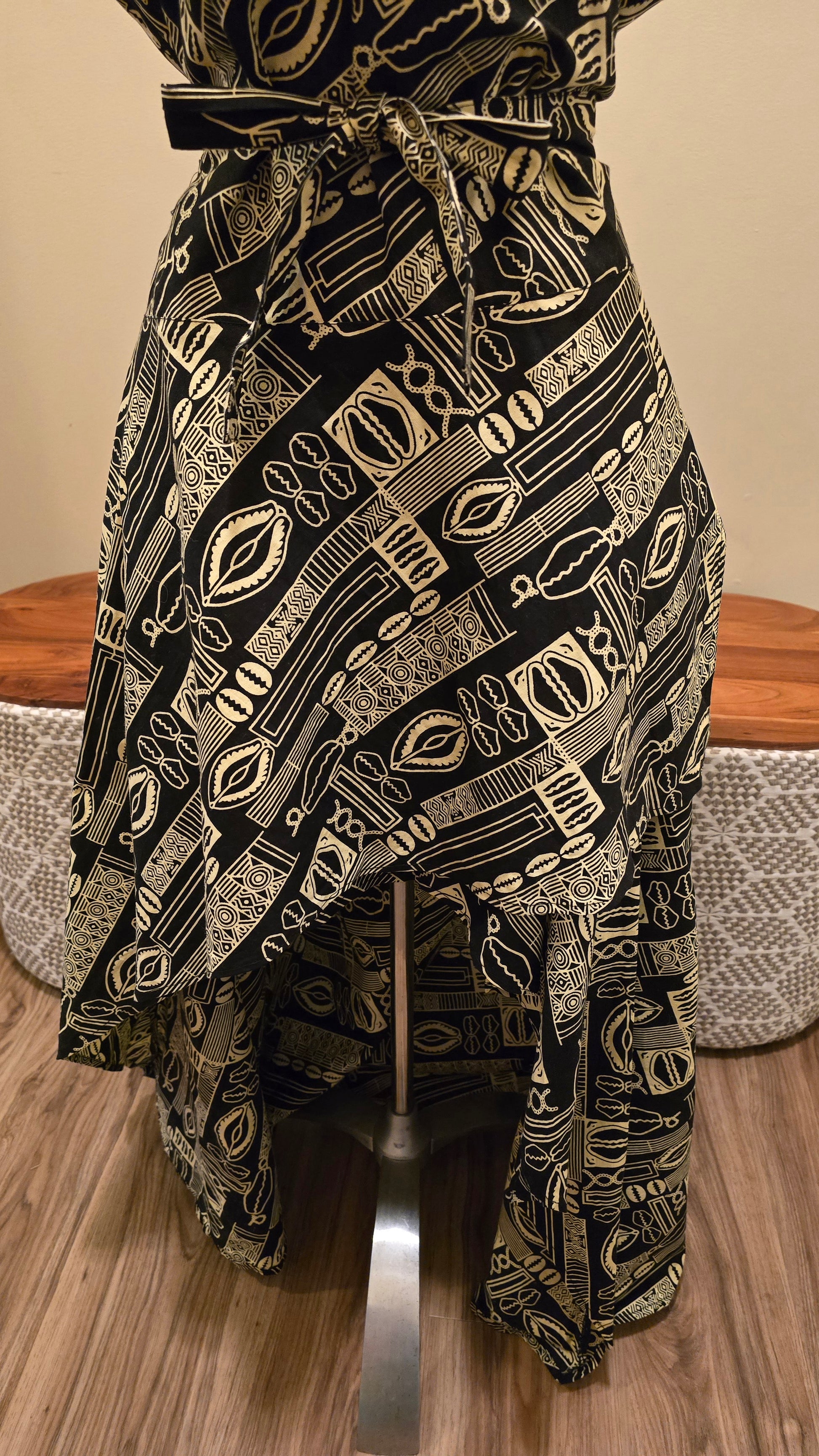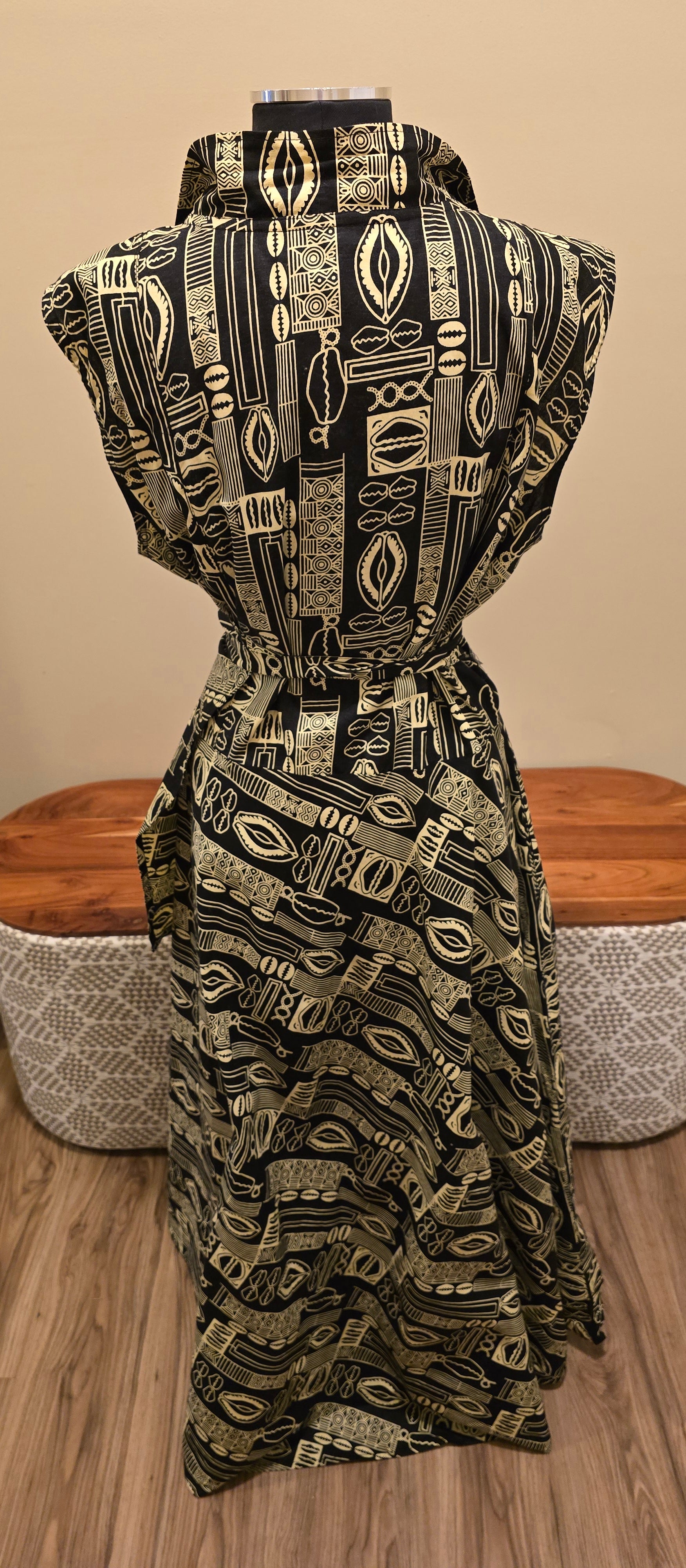 The Cowrie Shell Wrap Dress/Tunic, crafted from vibrant Ankara fabric, offers a graceful cascading design that flatters all body types, fitting up to size XXL. Made from comfortable cotton, it’s perfect for both casual outings and special occasions, providing versatility and style in one stunning piece. Fabric cotton.