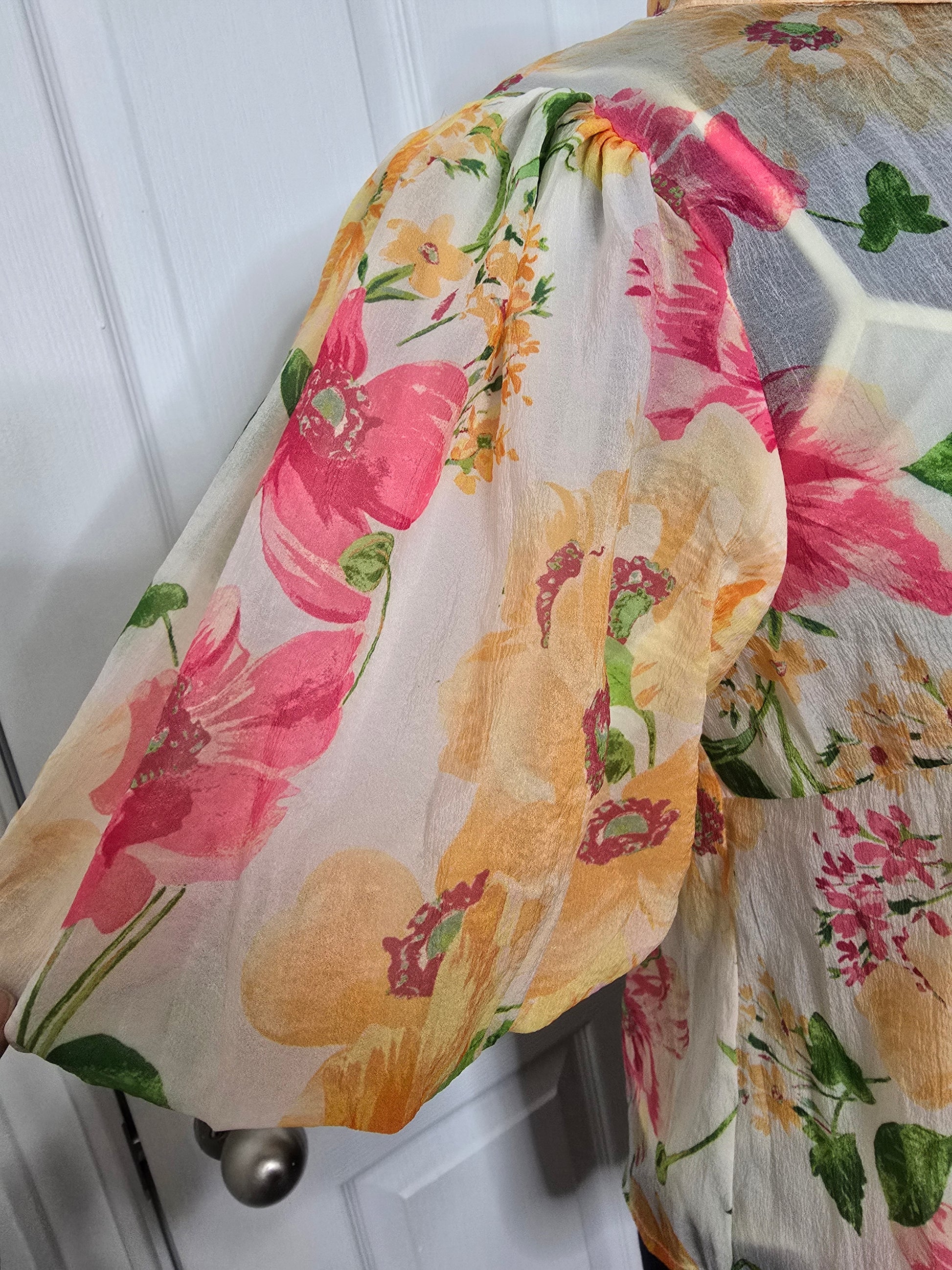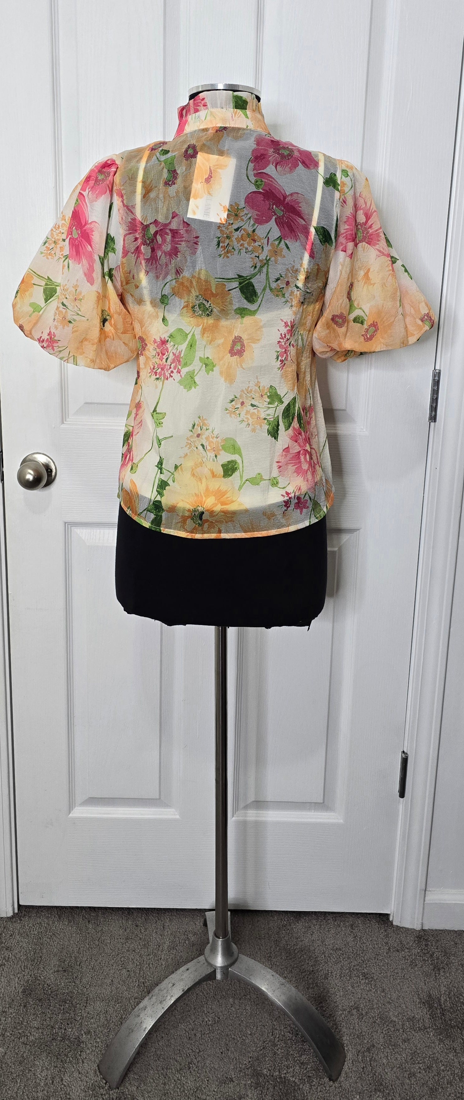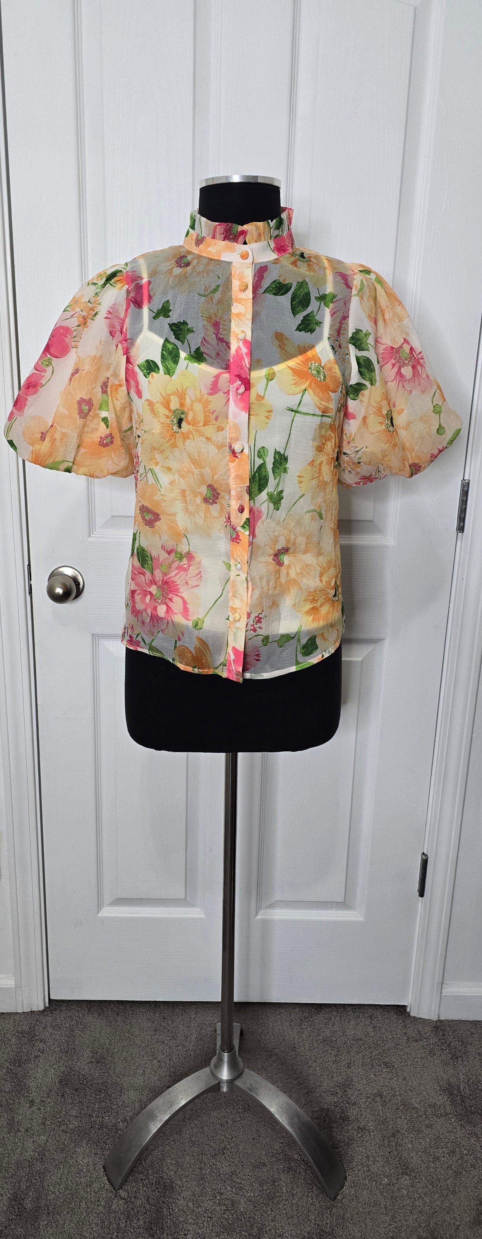 Indulge in elegance with the Fiona Puff-Sleeve Blouse. This sheer blouse is a sophisticated statement piece, complete with a ruffled collar and inner stretch camisole for added comfort. Perfect for day or night, this NWT blouse exudes luxury and fun.