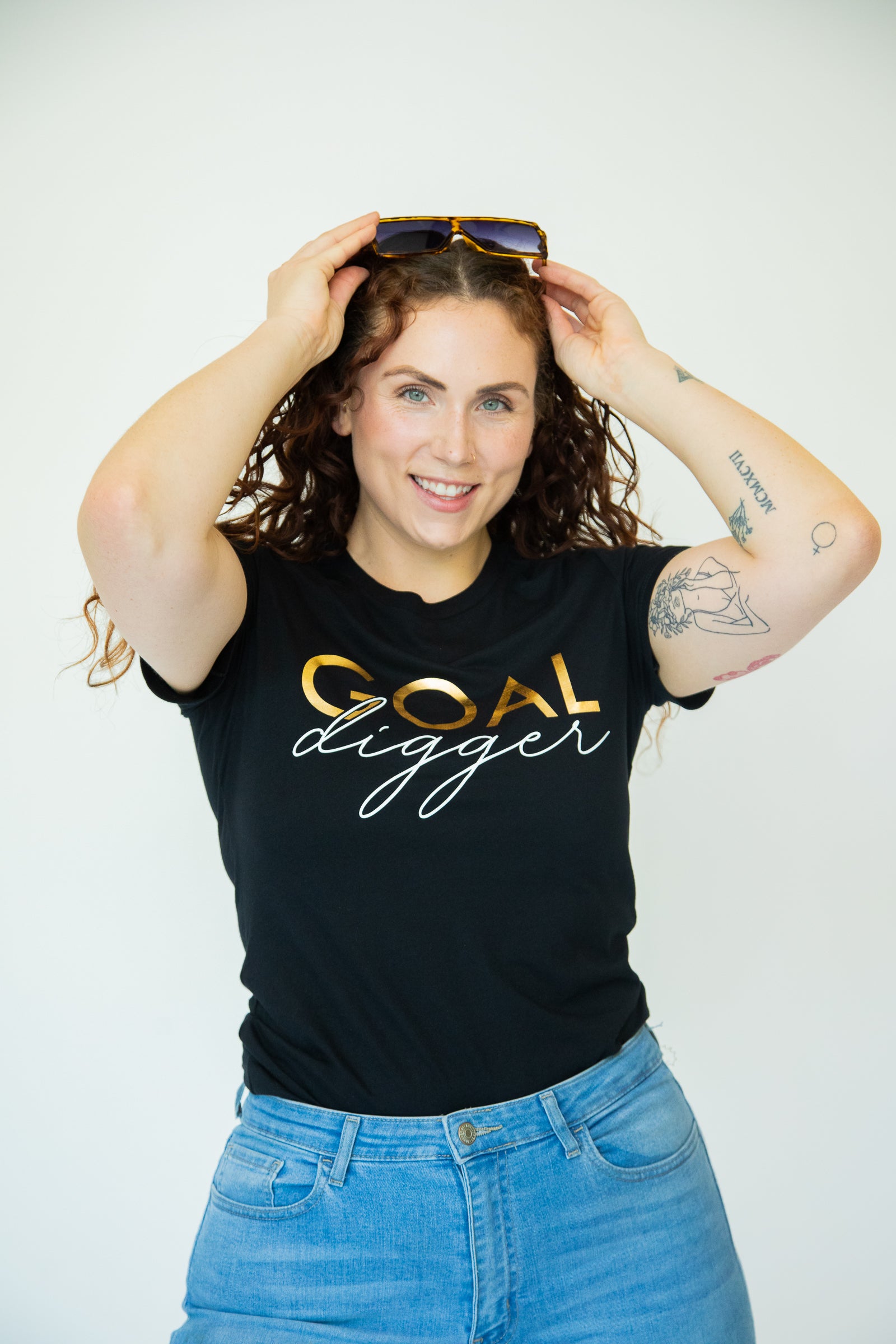 Are you about setting goals and achieving them? Rock the Goal Digger tee as a positive affirmation that you are on a mission and about business. Cotton tee with stretch. Available in 2 fits: Fitted - fitted women’s tee and relaxed - roomier at bust and mid-section.