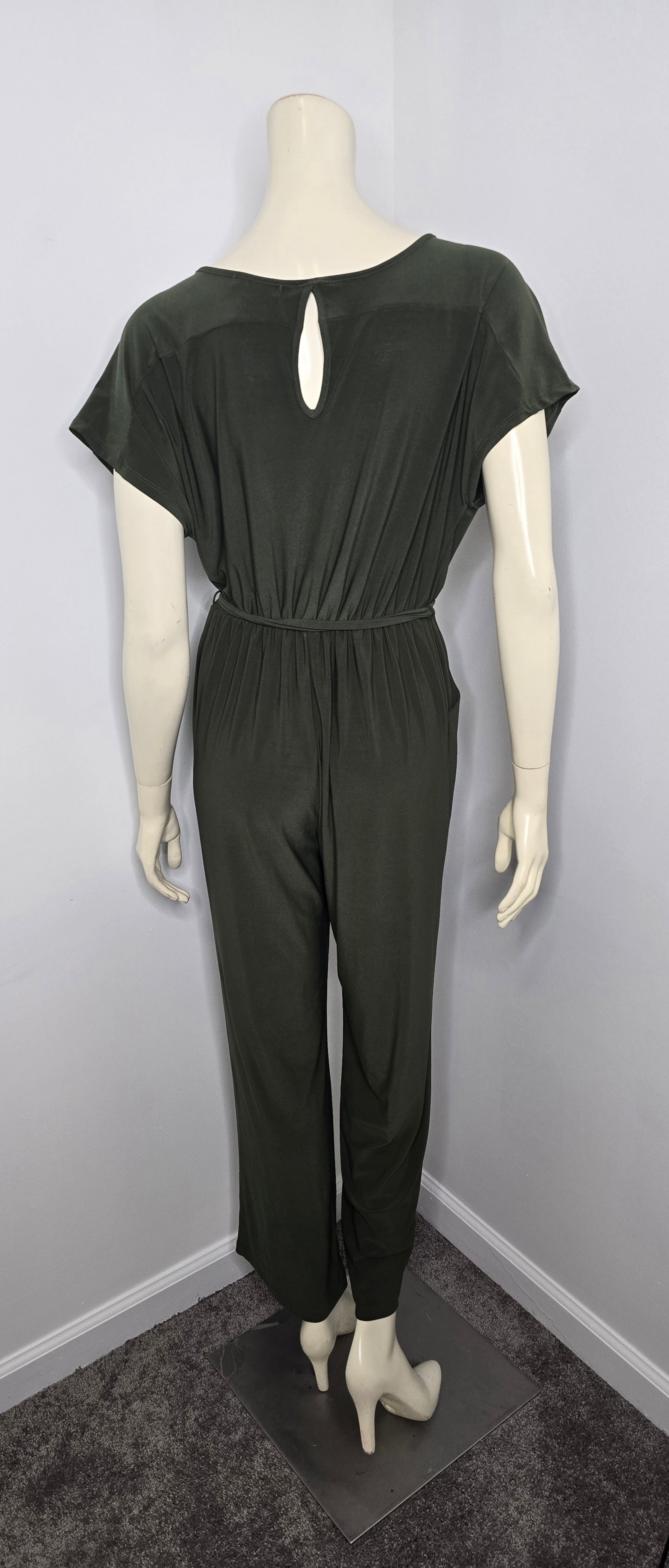 Effortlessly transition from day to night in our Green Faux Wrap Jumpsuit. The stretch fabric offers comfort and versatility, while the dolman sleeves and key hole closure add a touch of elegance. The elastic waist, pockets, and removable belt provide functionality and style. Perfect for any occasion. Size M. Inseam 30". NWOT.