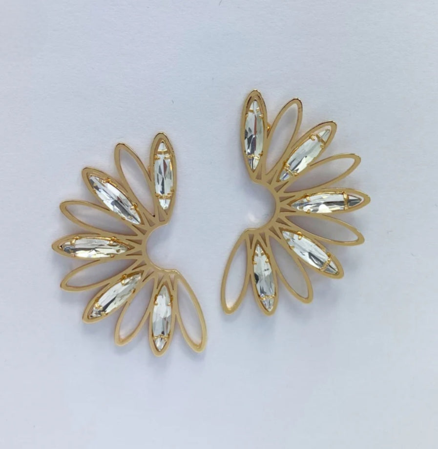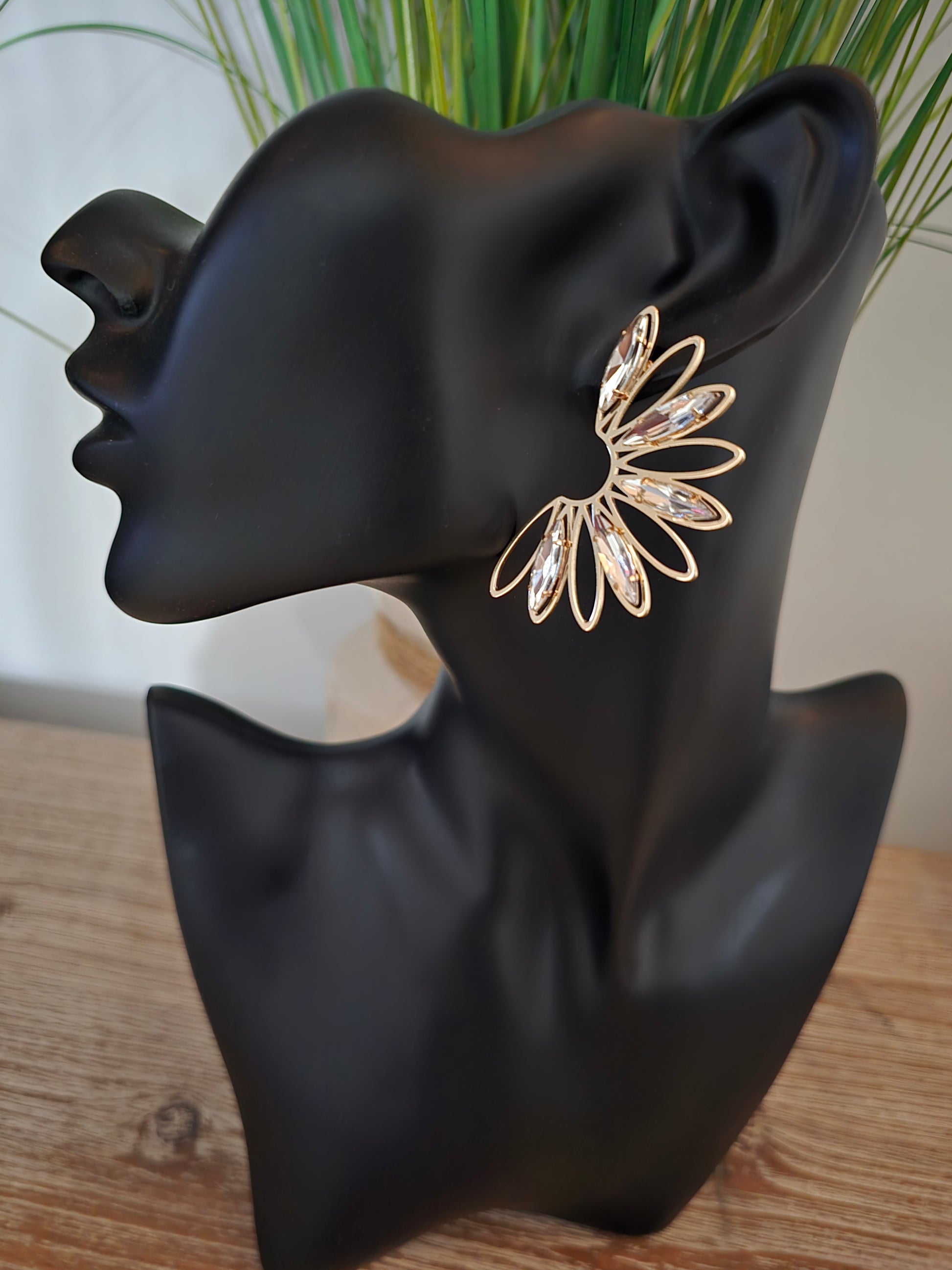 Lightweight. Approx 2" in length. Clear stone on alternating petals. Brighten up any outfit with the Half Flower Earring! These lightweight earrings feature a clear stone on alternating petals, adding a touch of sparkle and elegance. Measuring at approximately 2 inches in length, these earrings are the perfect accessory for any occasion. (Petal perfect!)