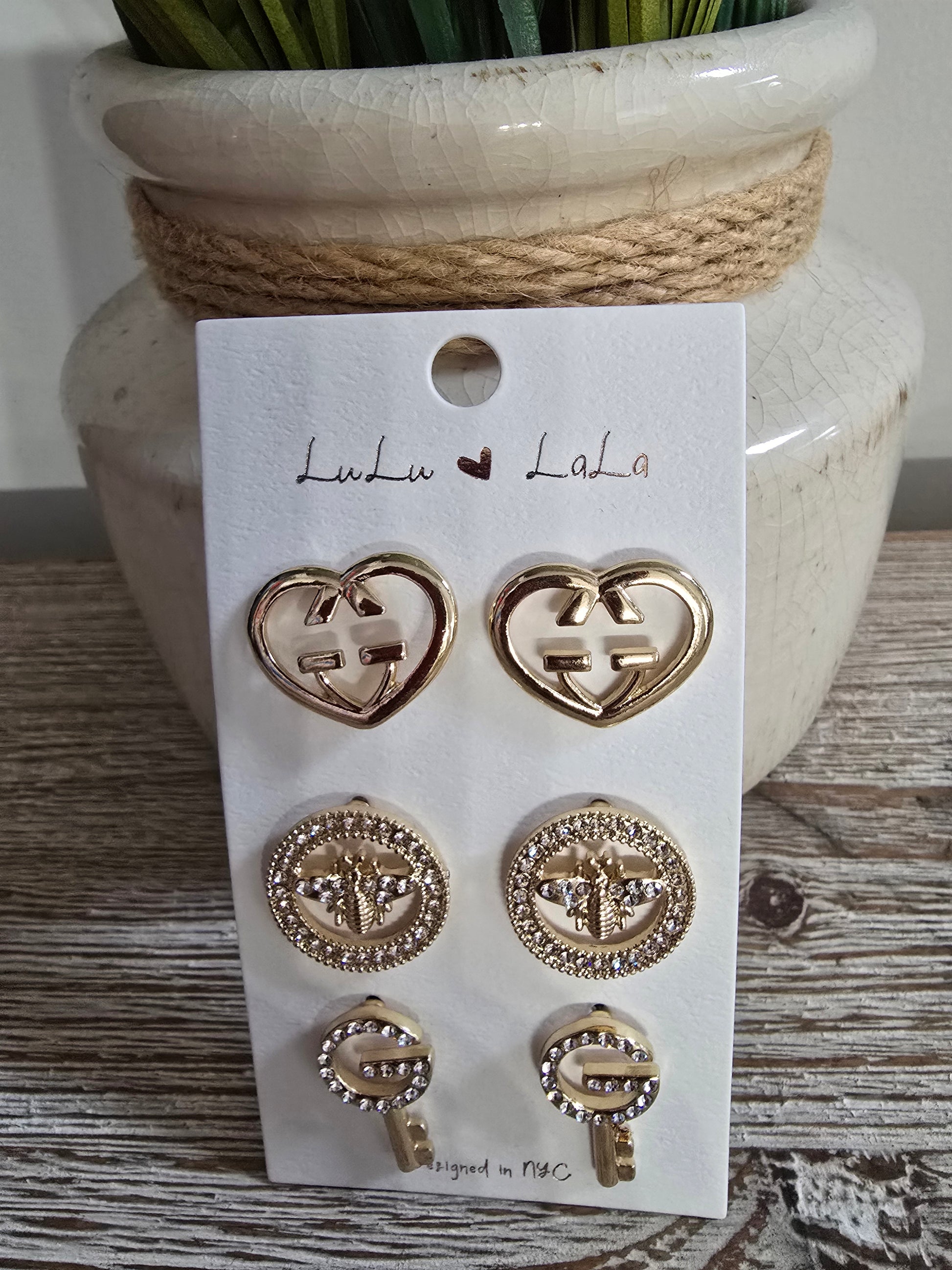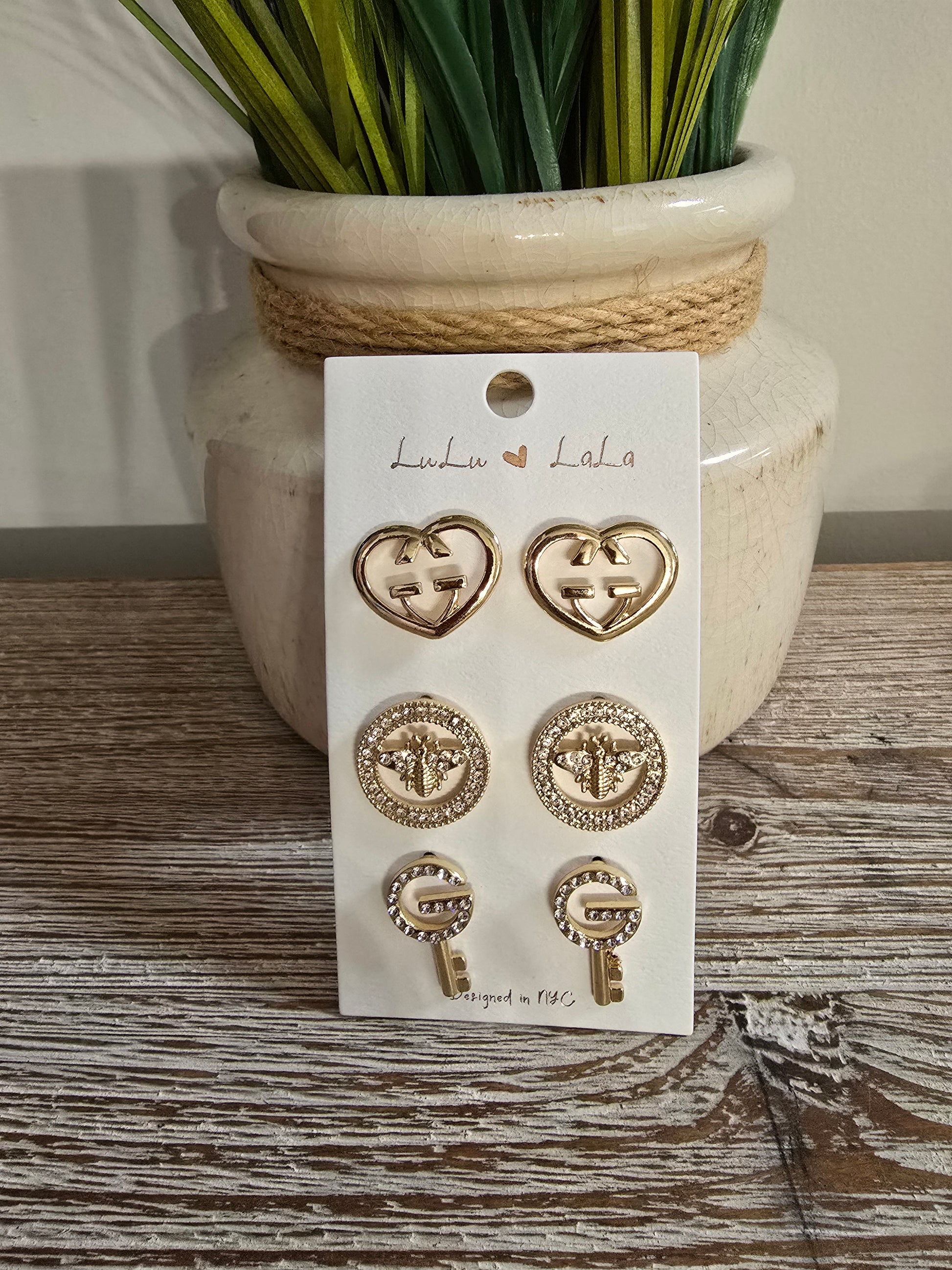 Introducing our Heart, Bee, & Key Trio Earring Pack. This NWT set includes 3 pairs of stud earrings in a classic silvertone finish. Make a statement with these sophisticated and elegant pieces that will add a touch of luxury to any outfit. Also available in silver.