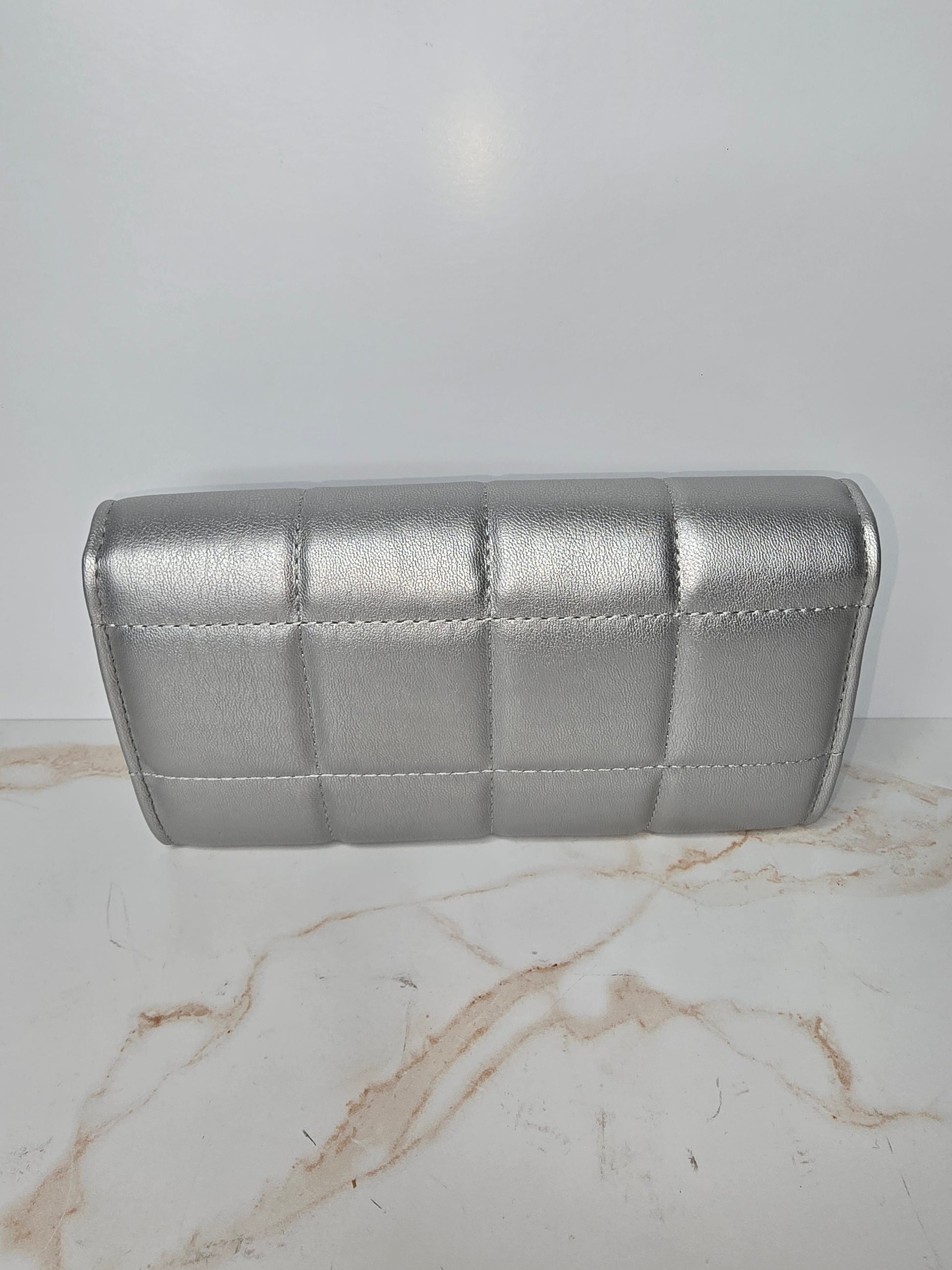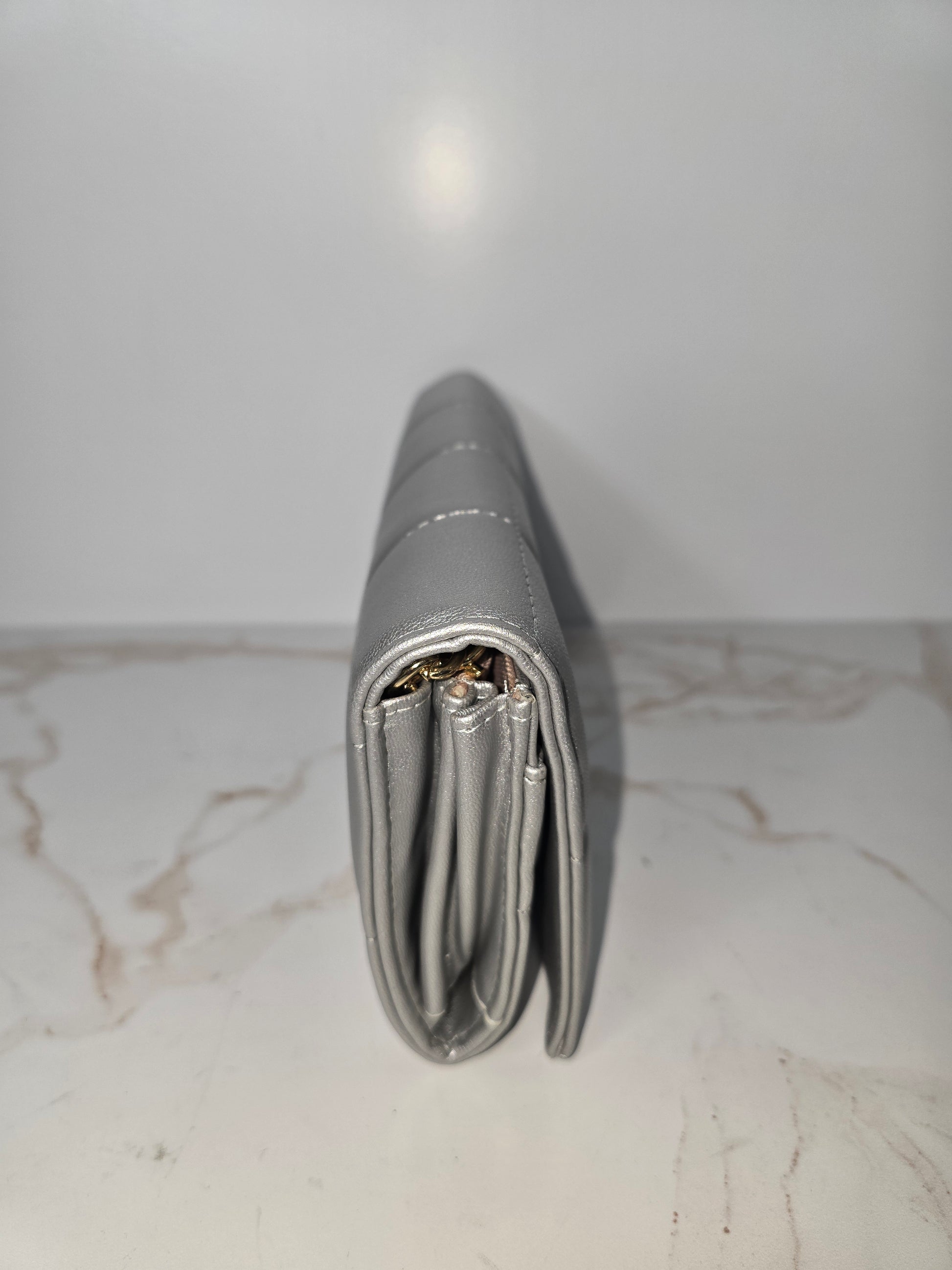Introducing our House of Want Silver Vegan Chain Crossbody - a luxurious accessory that combines style and sustainability. Expertly crafted from vegan leather, this chic bag features a detachable gold chain strap, 6 interior credit card slots, and a magnetic snap closure. With an elegant shoulder strap, it's perfect for any occasion. NWT.