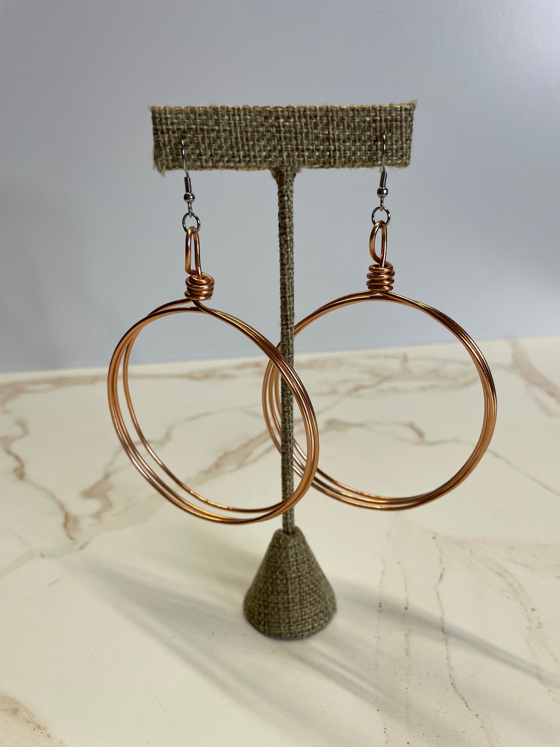 Exclusive multi-wire large-sized hoops, handmade. Lightweight. Made of aluminum wire. Tarnish-free. Hooks are brass. Approx 3.5" in length. Also available in silver.