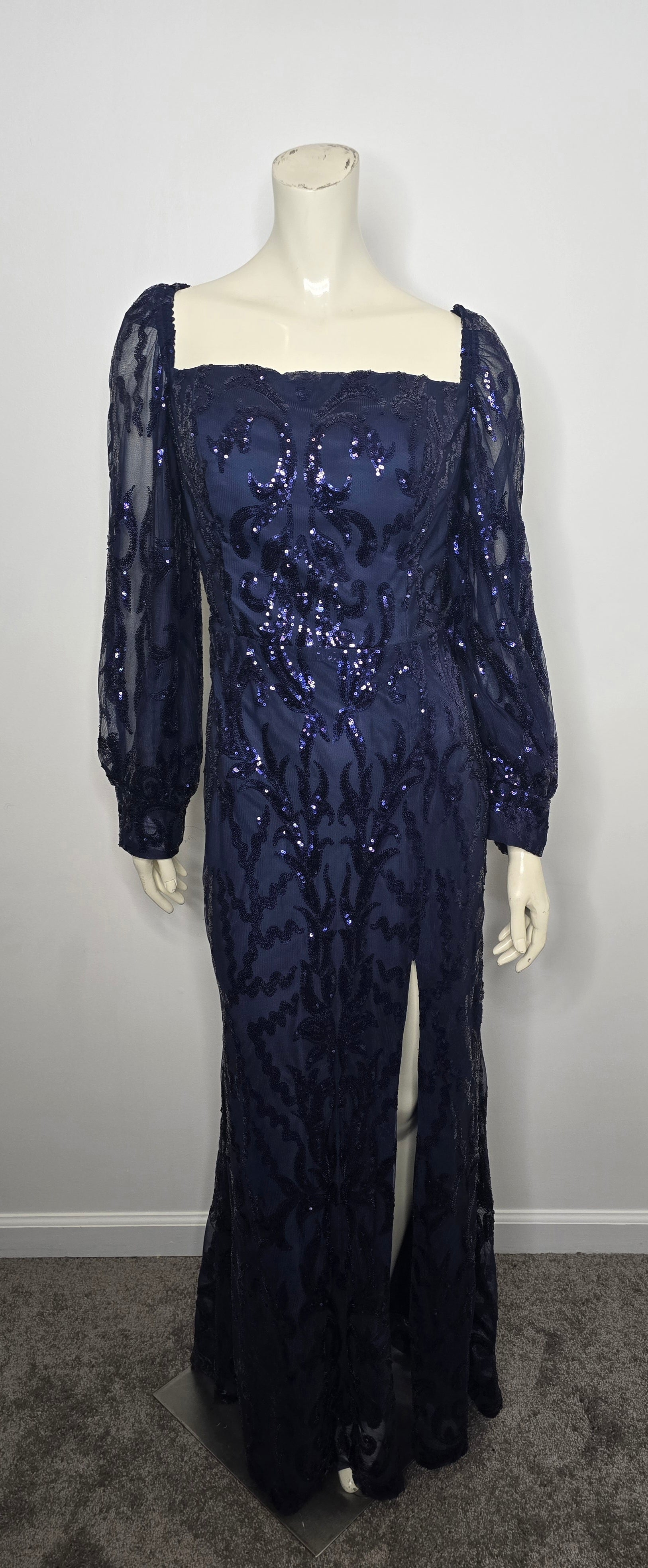 Elevate your elegance with our Imcactor Blue Sequin Gown. The stunning gown features a dramatic split and balloon sheer sleeves...stunning! The padded bust with elastic trim ensures a comfortable and flattering fit, while the stretch lining and back zipper add ease to this maxi length piece. NWT. PTP 19".
