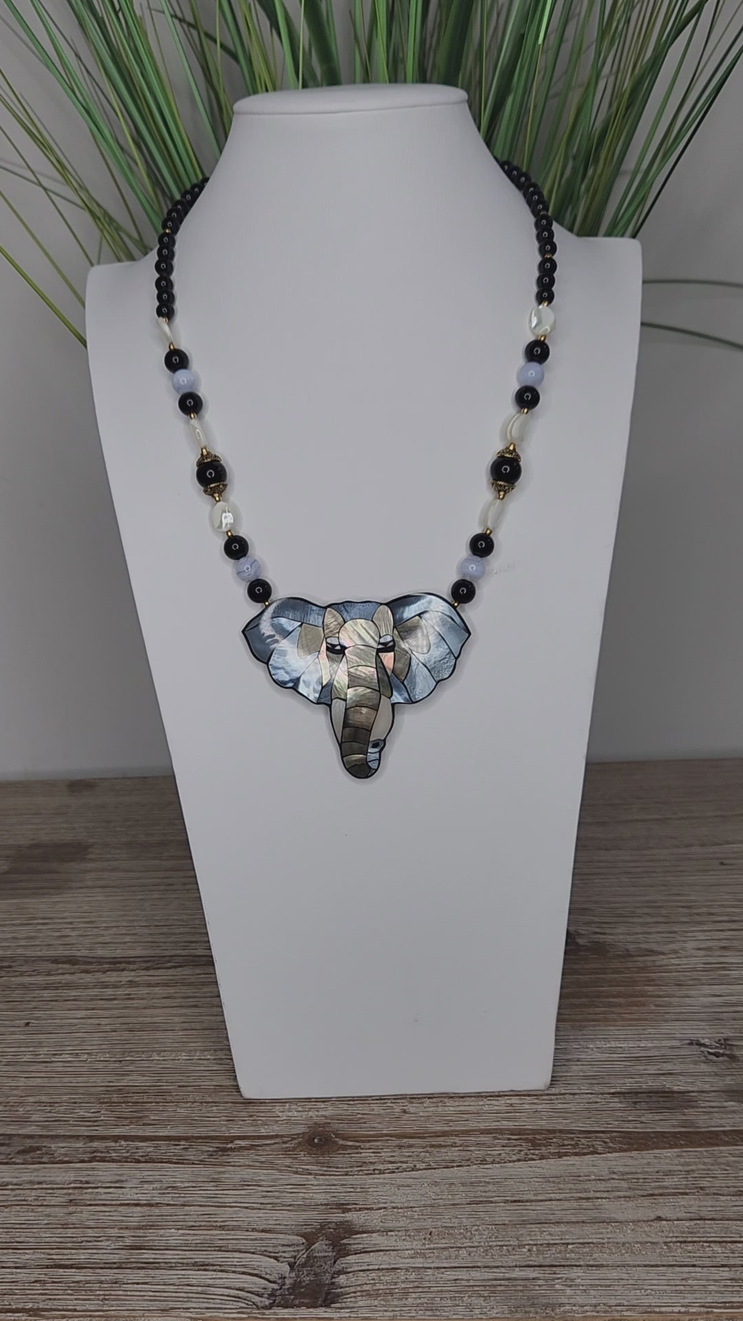 Gorgeous Mother of Pearl Inlay Elephant head necklace. Vintage piece. Length is approx 22". In excellent condition.