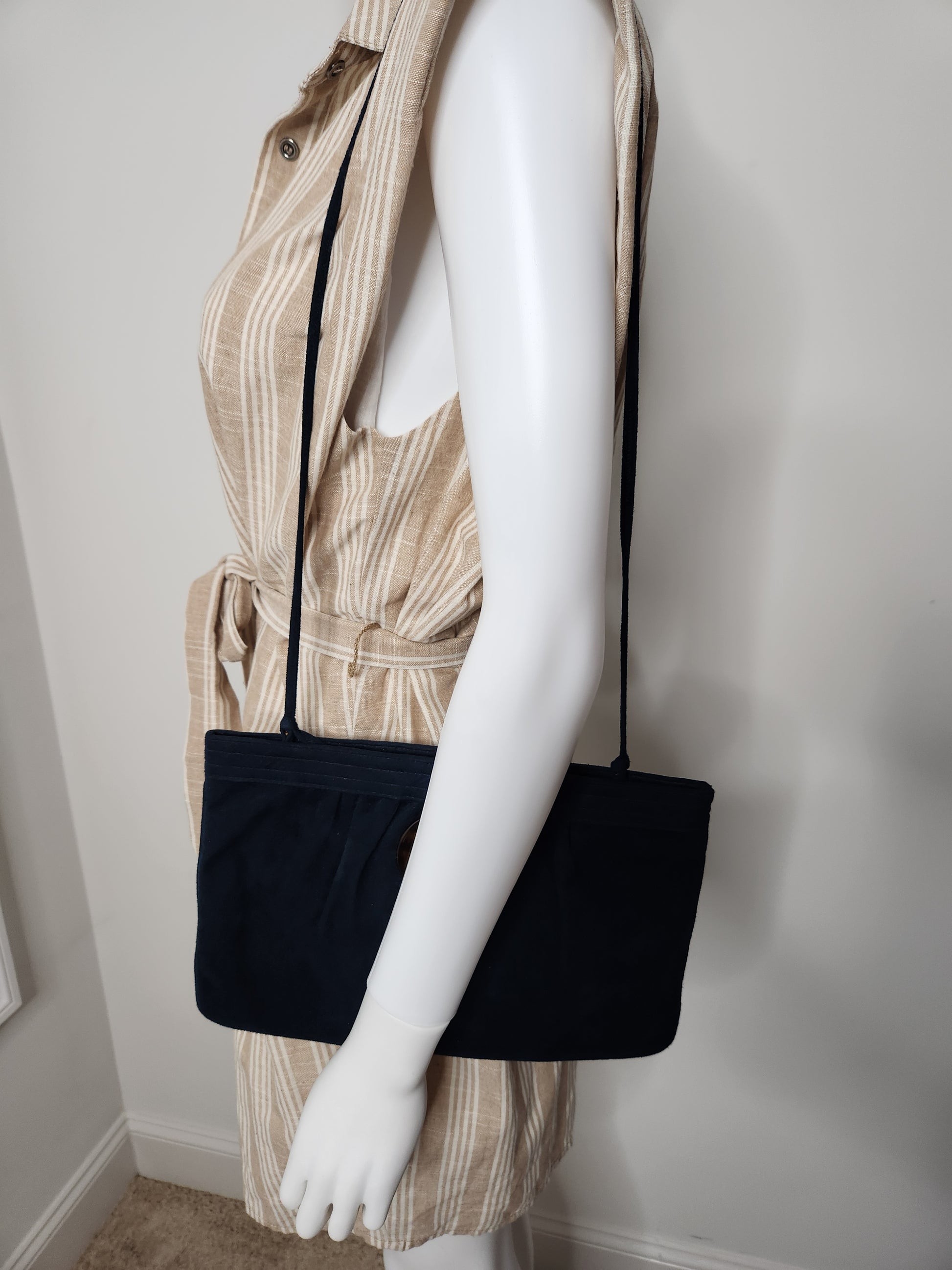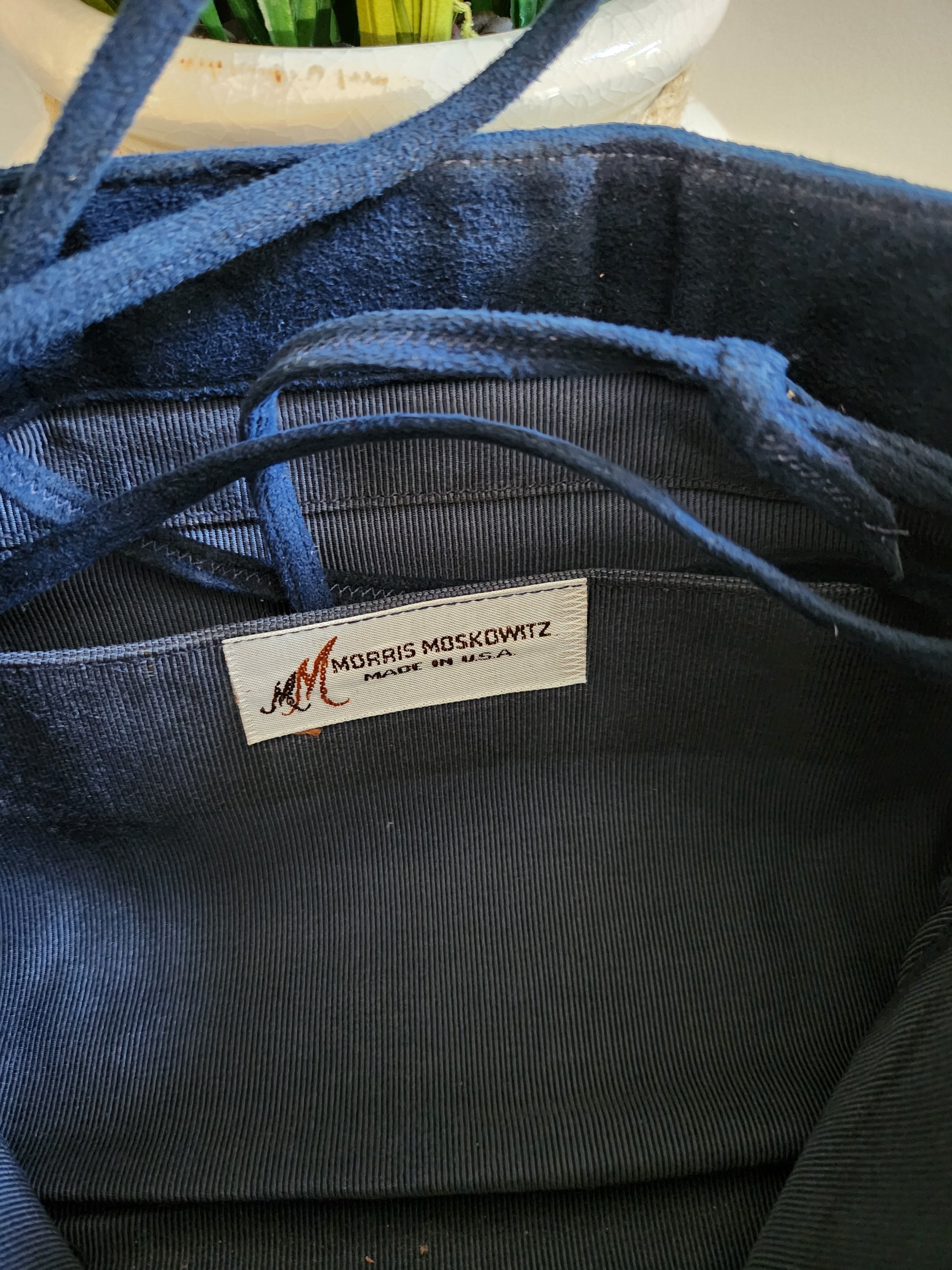 The Morris Moskowitz Vintage Clutch is crafted from luxurious blue velvet, this designer clutch features a convenient magnetic snap closure and an inner pocket for organization. Wear it on your shoulder or carry it as a chic clutch for a sophisticated and exclusive look. Measures 12" x 8"