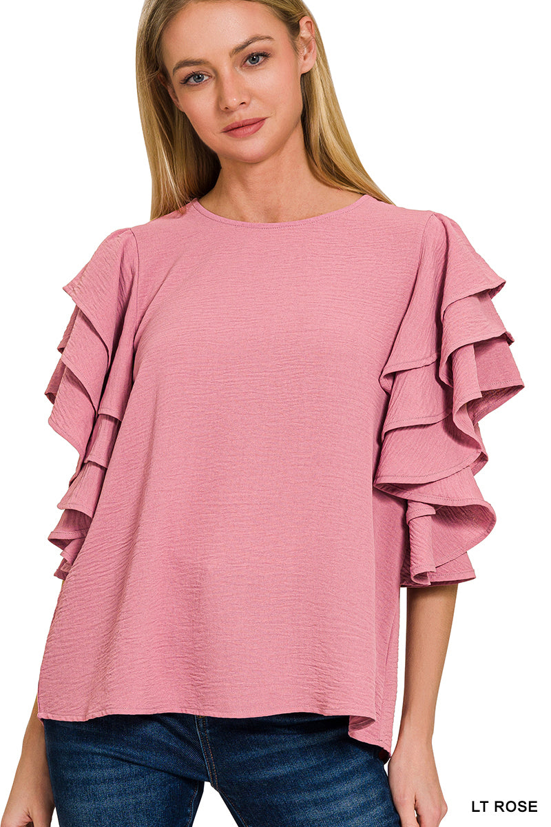 Introducing our Amara woven airflow multi-tiered ruffle sleeve blouse, crafted from lightweight polyester. Stay cool and chic with its breathable design and stylish multi-tiered ruffle sleeves. Perfect for a sophisticated and stylish look.