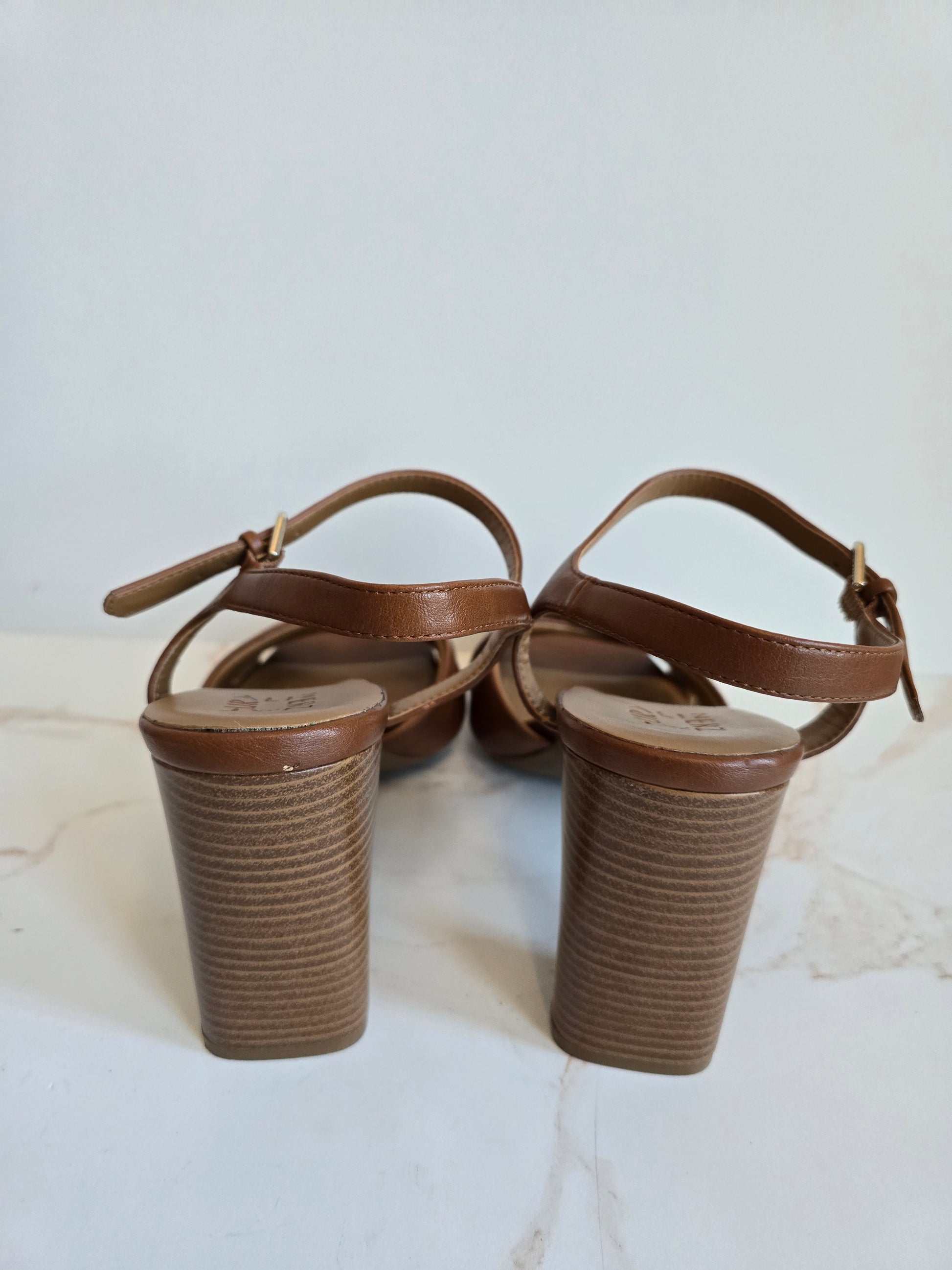 Indulge in pure comfort and sophistication with our Naturalizer Morgan Ankle Strap Platform Brown Sandal. With a strappy design and a comfortable heel height of approximately 4 inches, this pre-owned sandal exudes elegance and luxury. Made with faux leather, it's the perfect addition to your wardrobe.