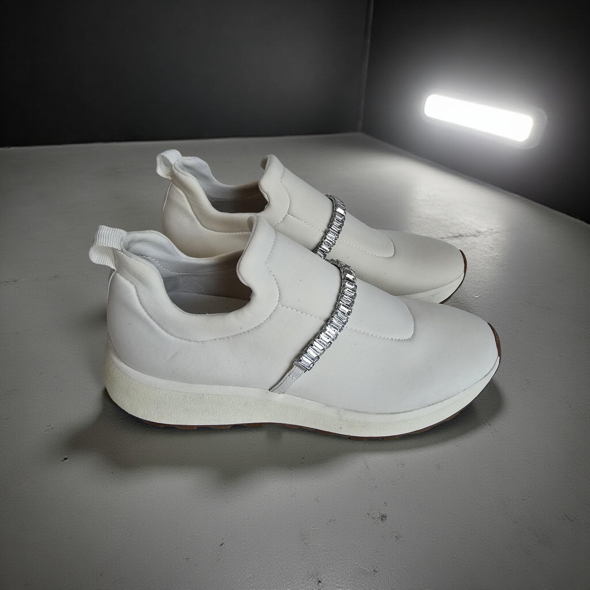Add some sparkle to your wardrobe with these Nordstrom Rack Embellished White Slip-On Sneakers in size 8. Featuring an eye-catching embellished strap, these sneakers are perfect for both style and comfort. Dress them up or down for any occasion. NWOB.