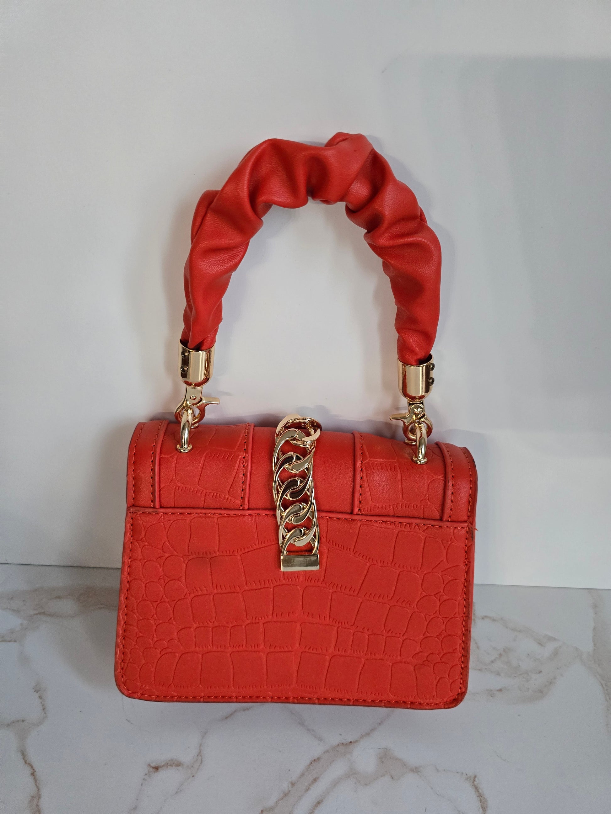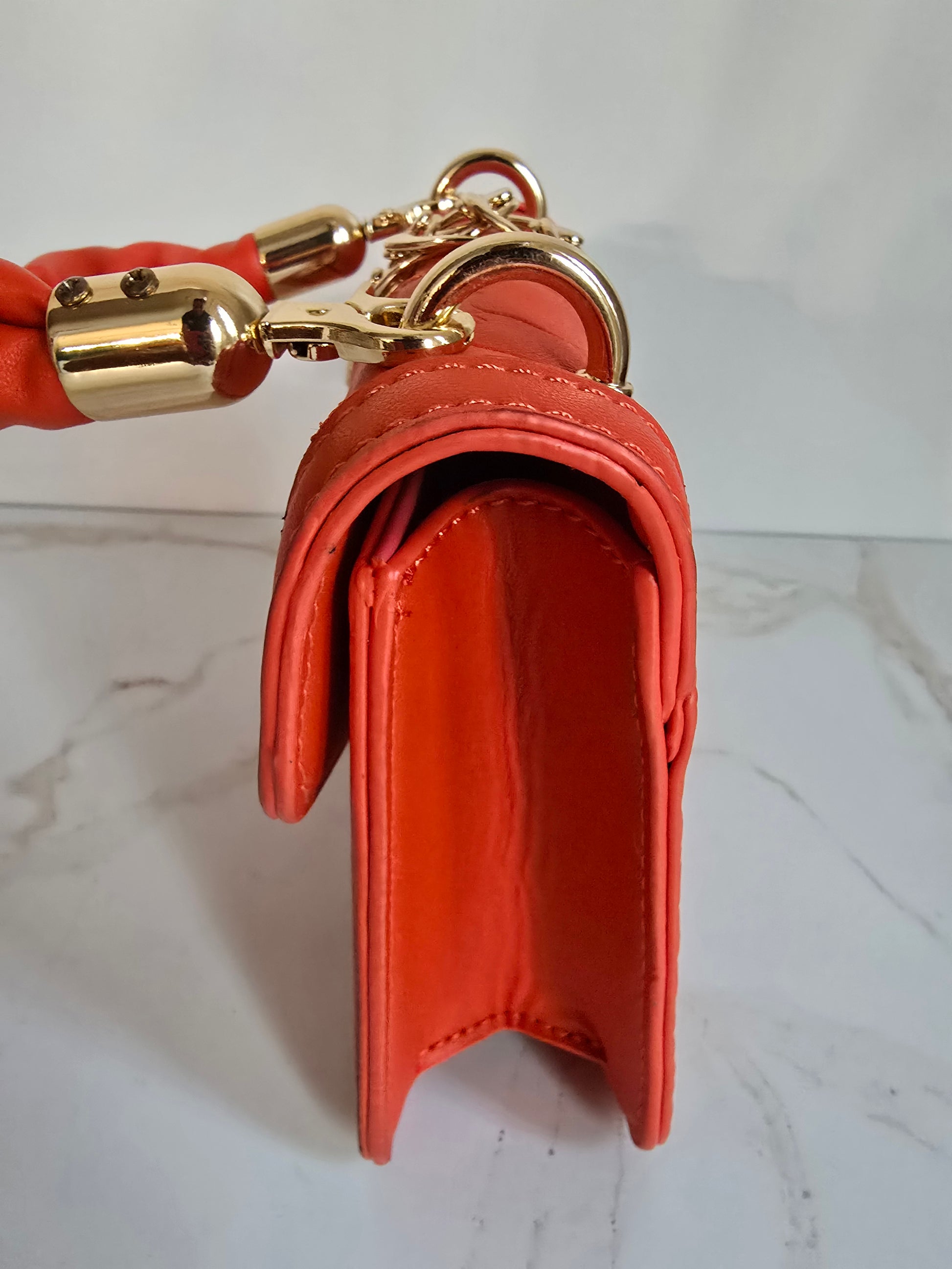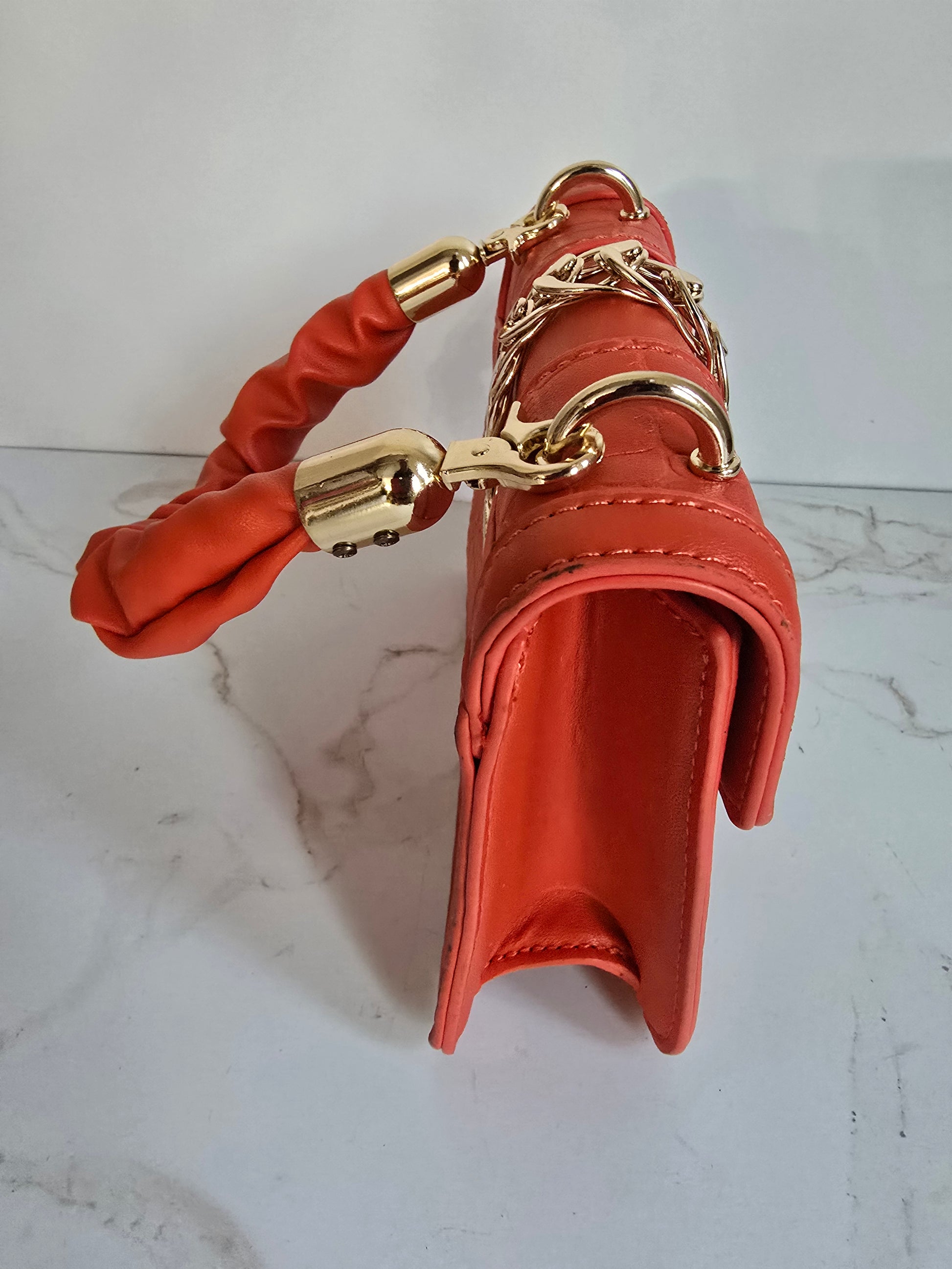 Unleash your playful side with our Orange Faux Skin Mini Handbag! This NWOT bag features a burst of vibrant color, perfect for adding a pop of fun to any outfit. The gold chain hardware and snap closure add a touch of glamour, while the compact measurements of 7" x 5.5" x 2" make it perfect for on-the-go adventures. Will fit your essentials...phone, hippie, keys, and small wallet.