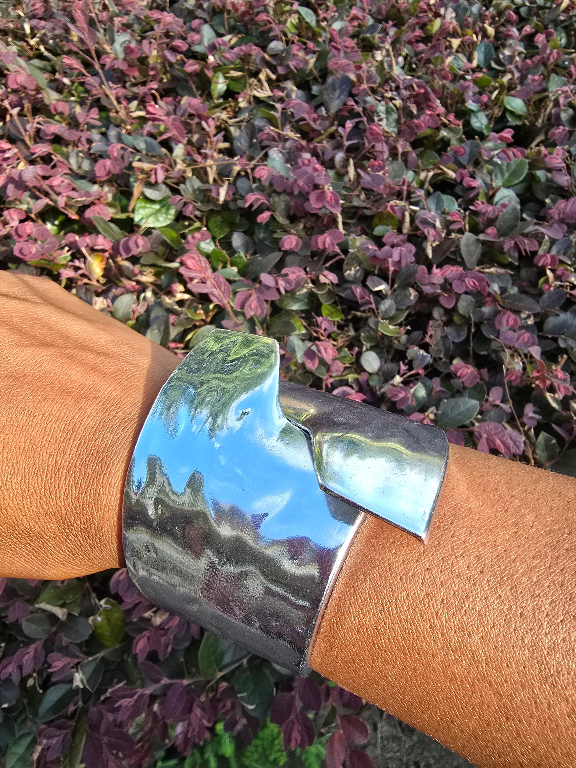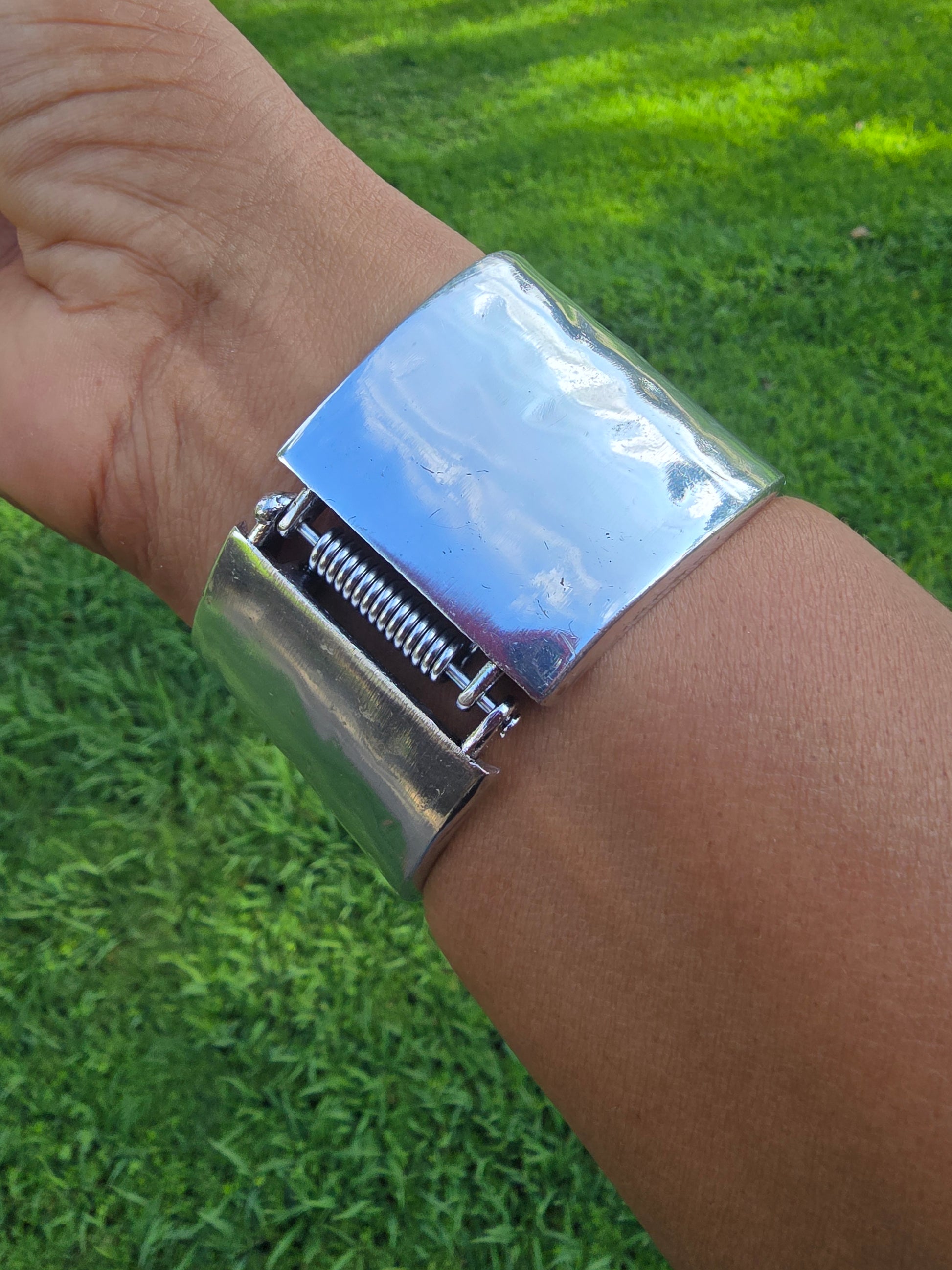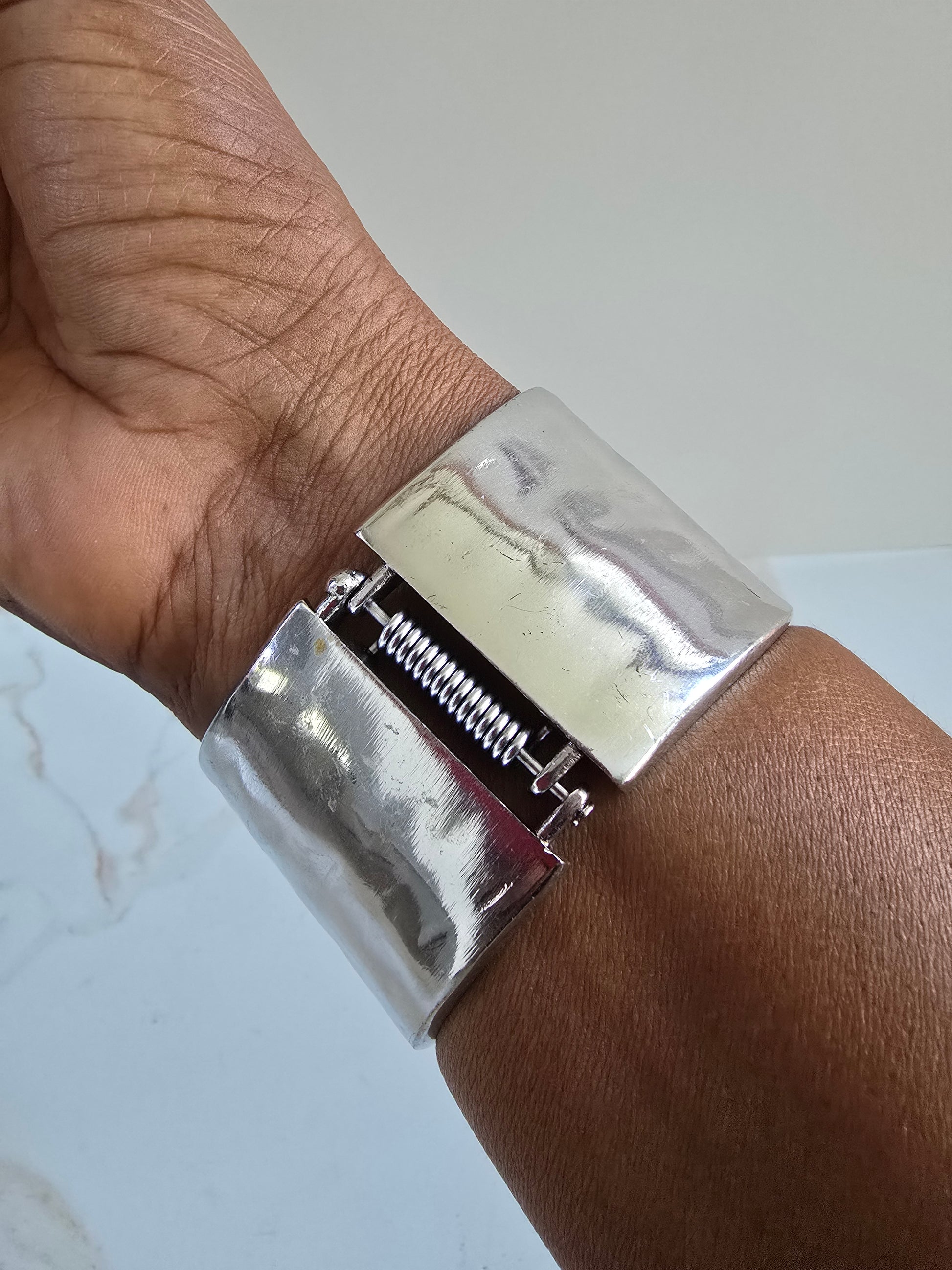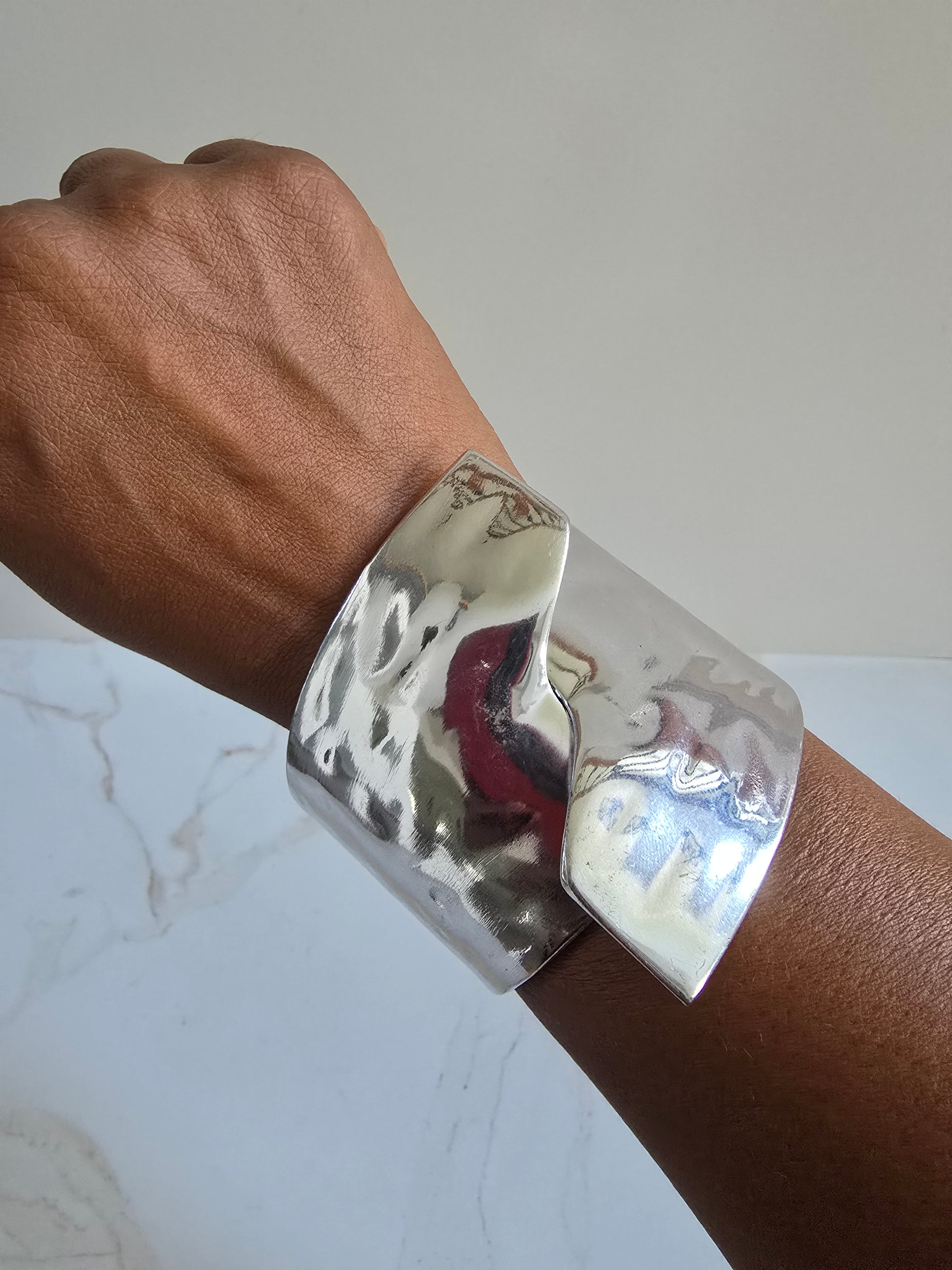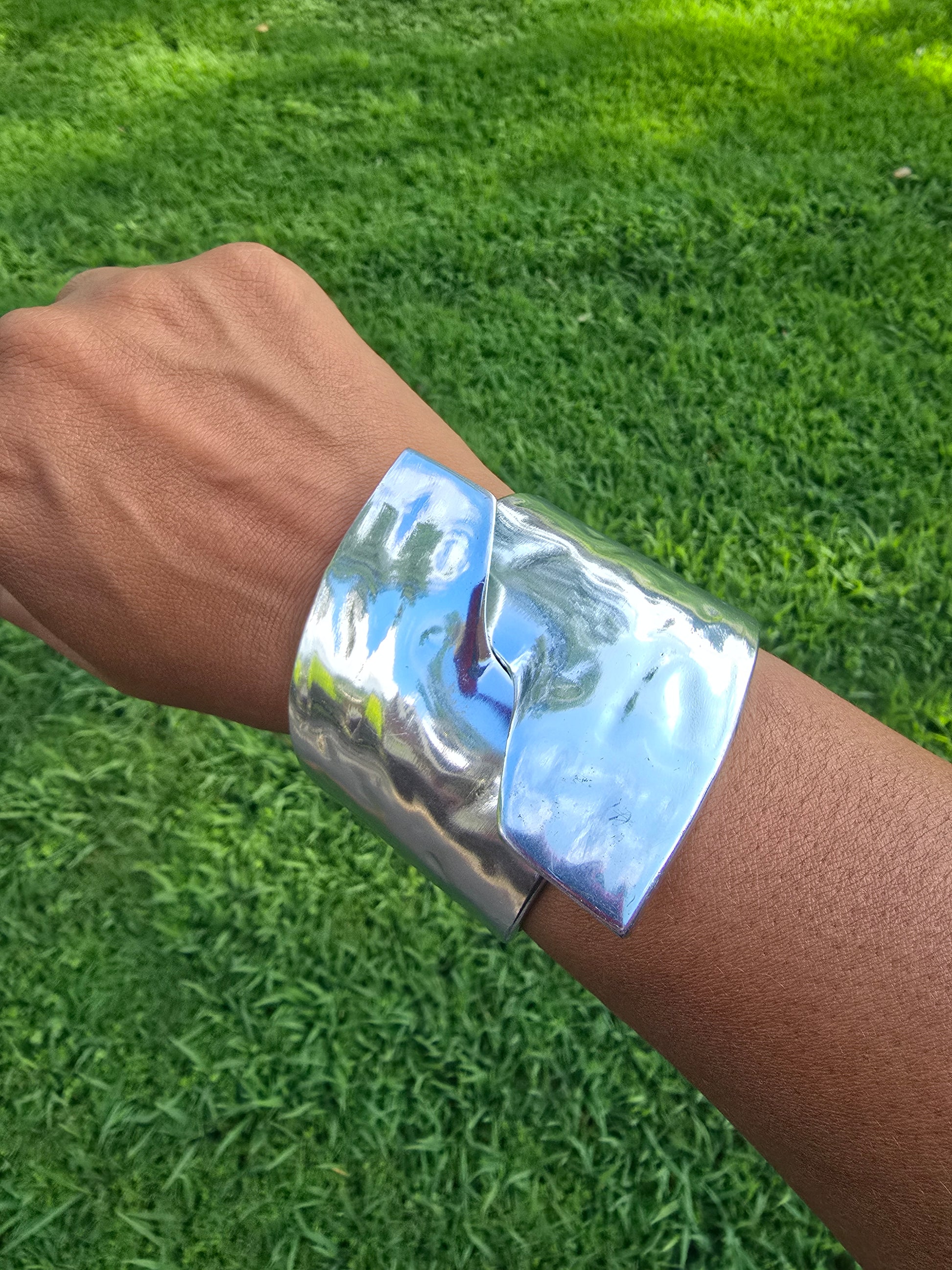 Make a bold fashion statement with our luxurious Overlapping Silver Hammered Cuff. Crafted with a sophisticated silvertone finish, this cuff is perfect for larger wrists, measuring at least 7". Elevate your style and showcase your unique taste with this elegant accessory. Heavier piece.