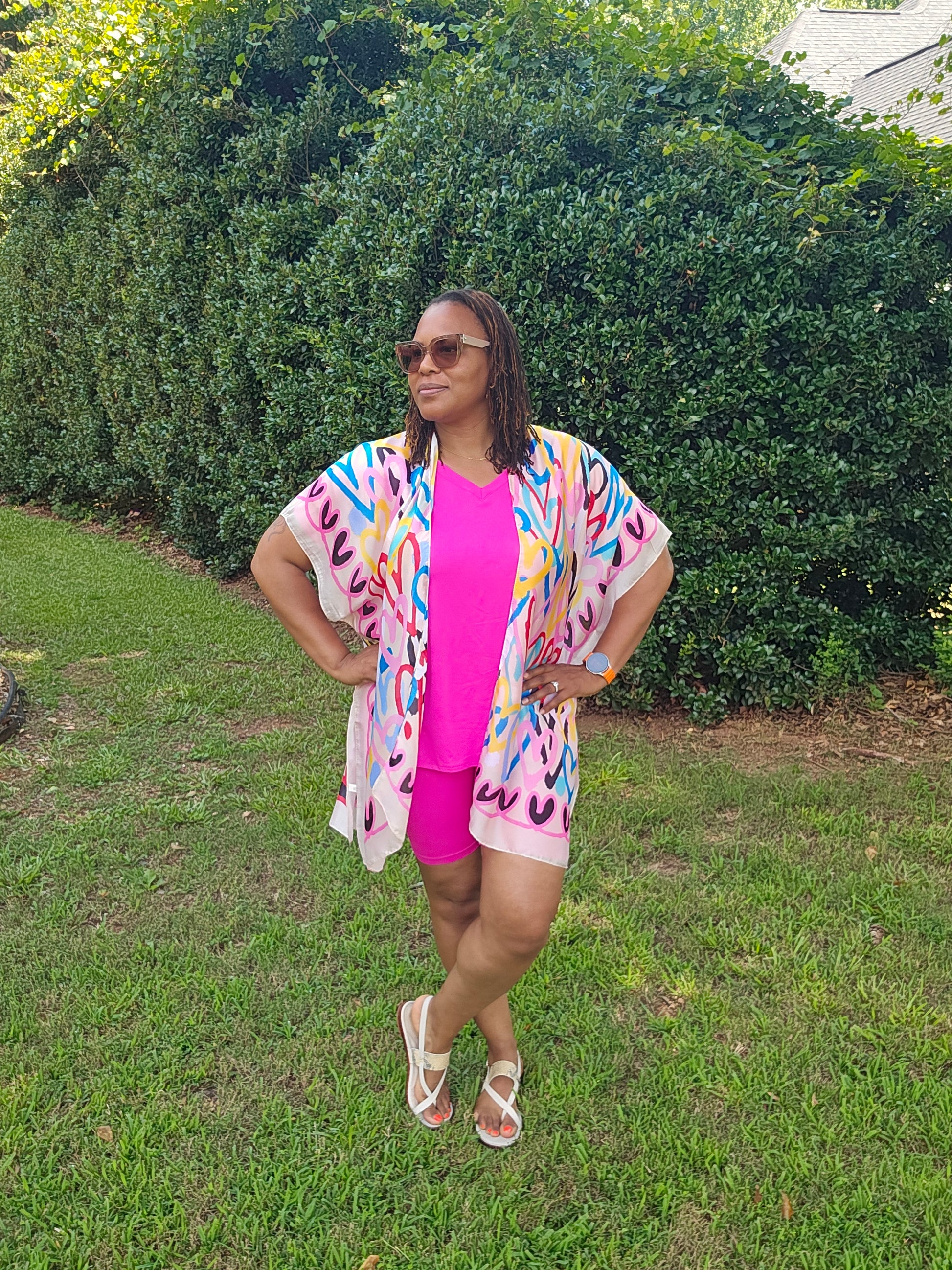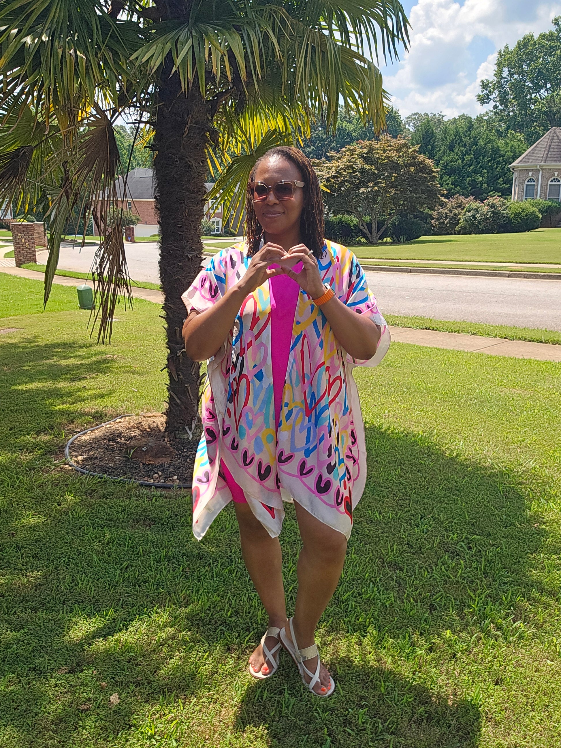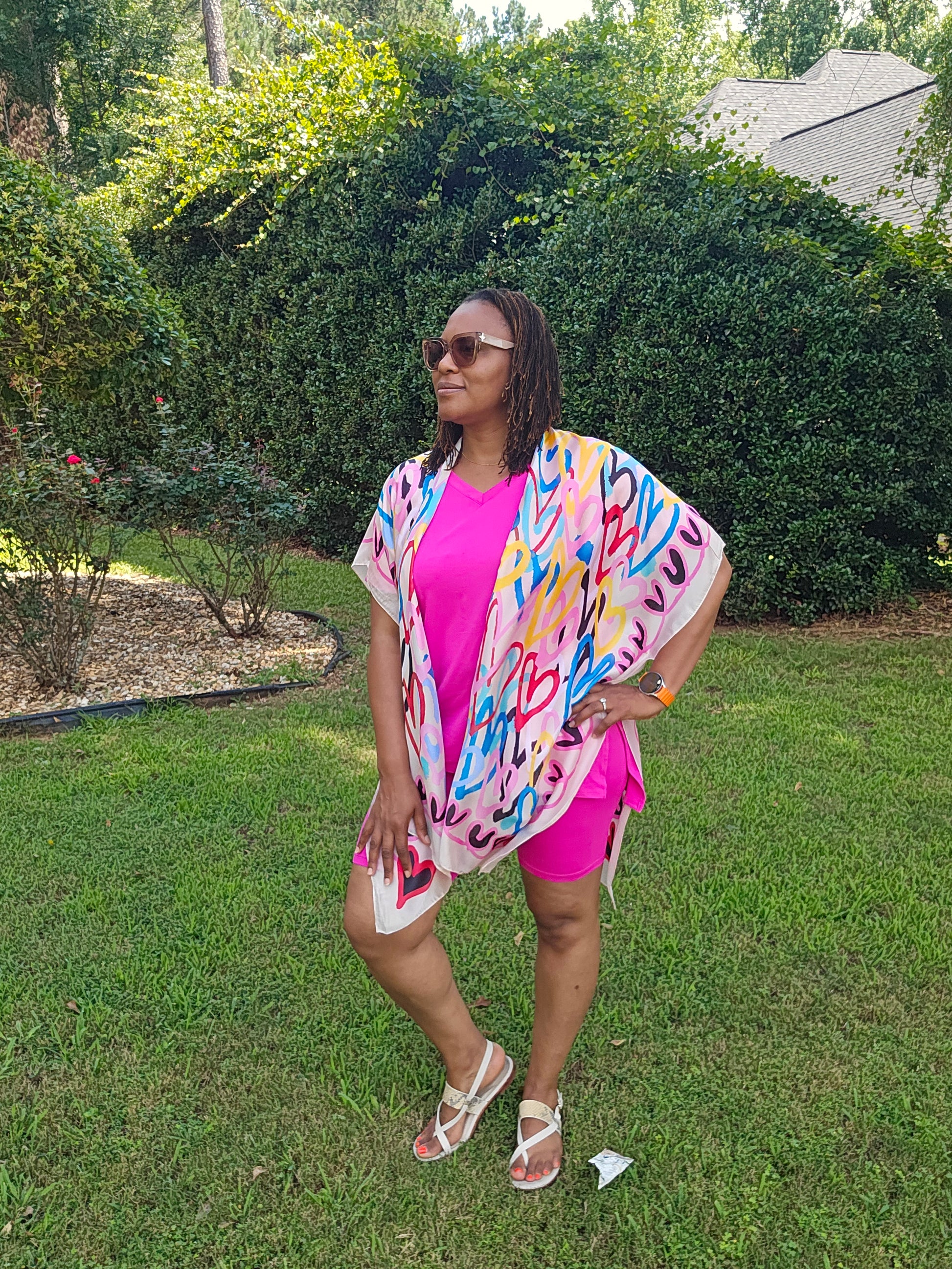 Get ready to rule in the Queen of Hearts Biege Kimono! This one size kimono features a soft and silky polyester material adorned with multicolored heart embellishments. Perfect for adding a touch of playful quirkiness to any outfit, measuring at 38" x 36". (Off with boring fashion!)