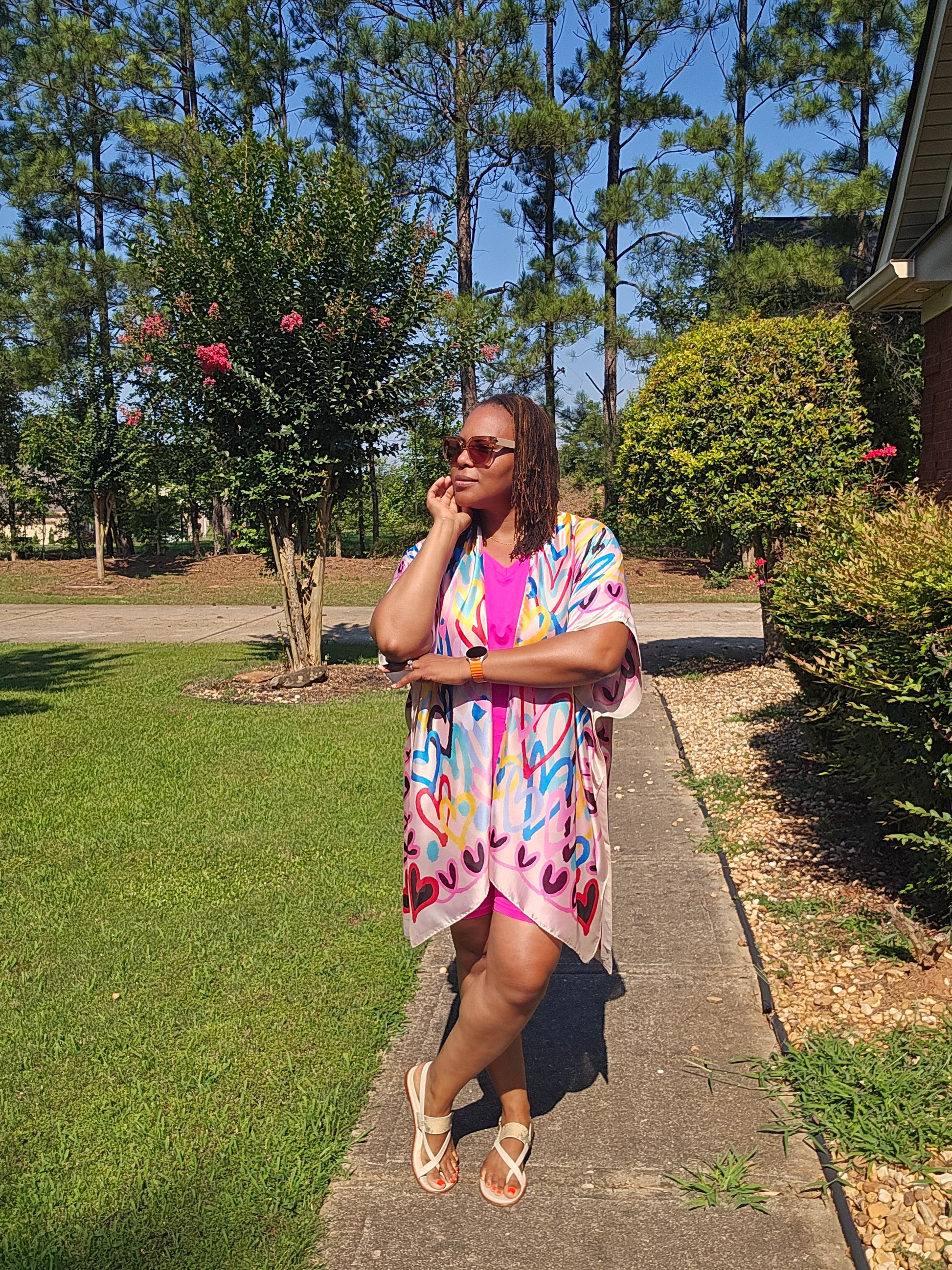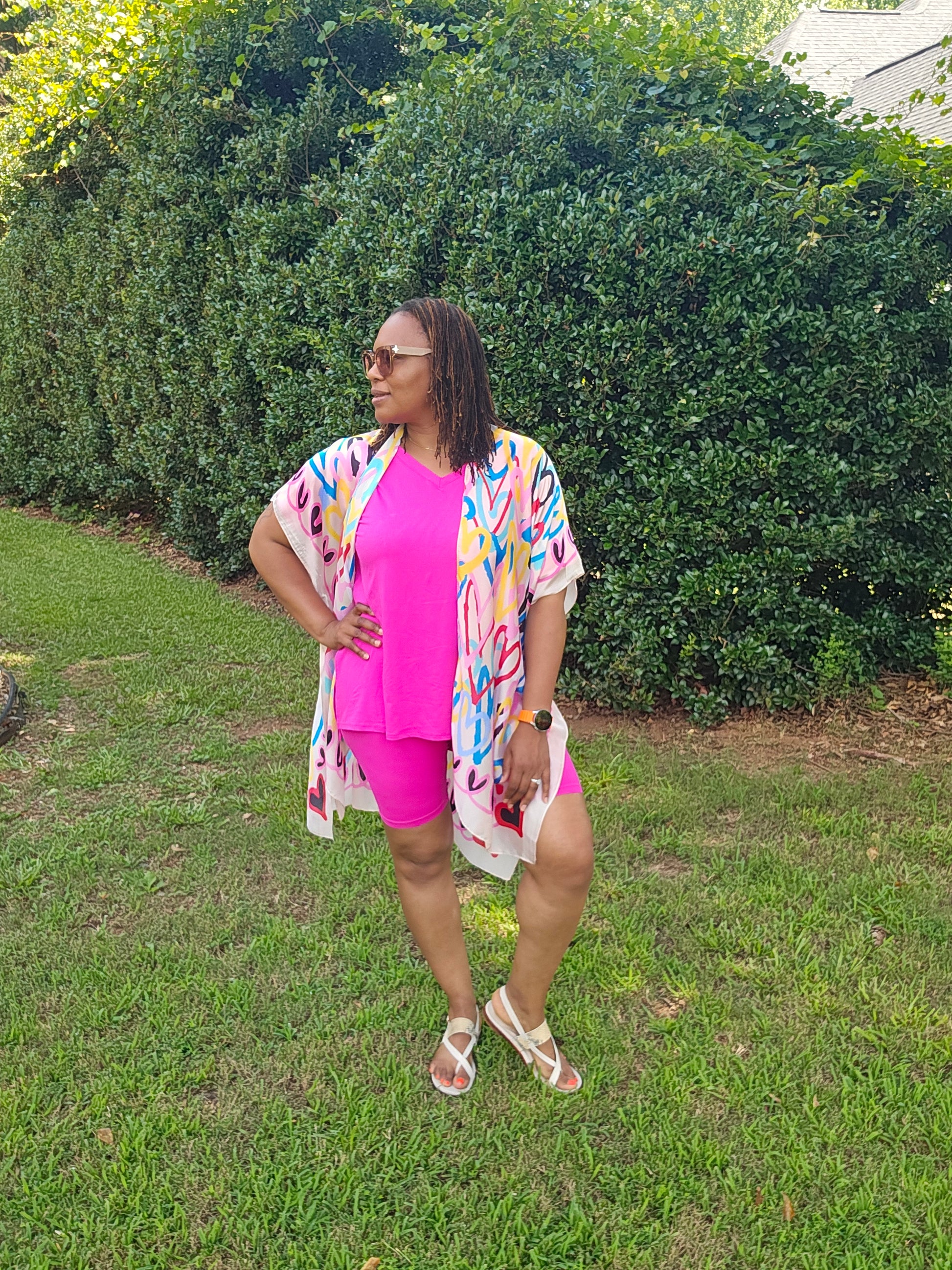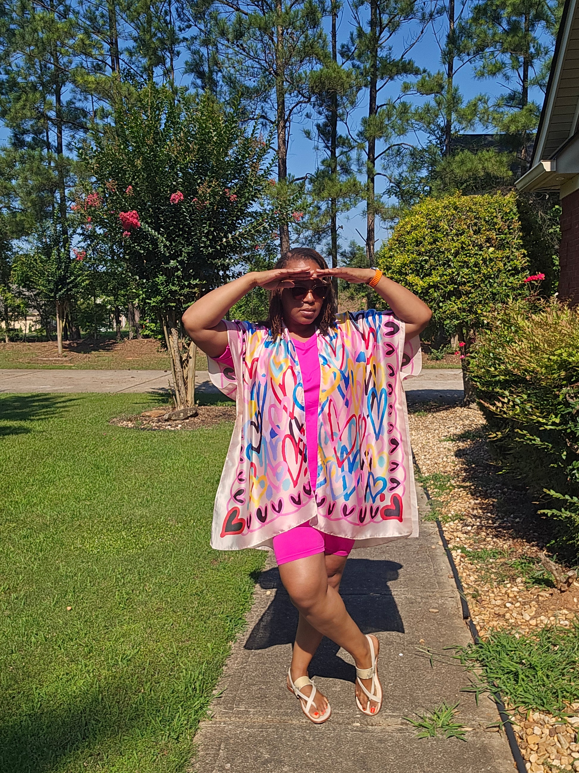 Get ready to rule in the Queen of Hearts Biege Kimono! This one size kimono features a soft and silky polyester material adorned with multicolored heart embellishments. Perfect for adding a touch of playful quirkiness to any outfit, measuring at 38" x 36". (Off with boring fashion!)