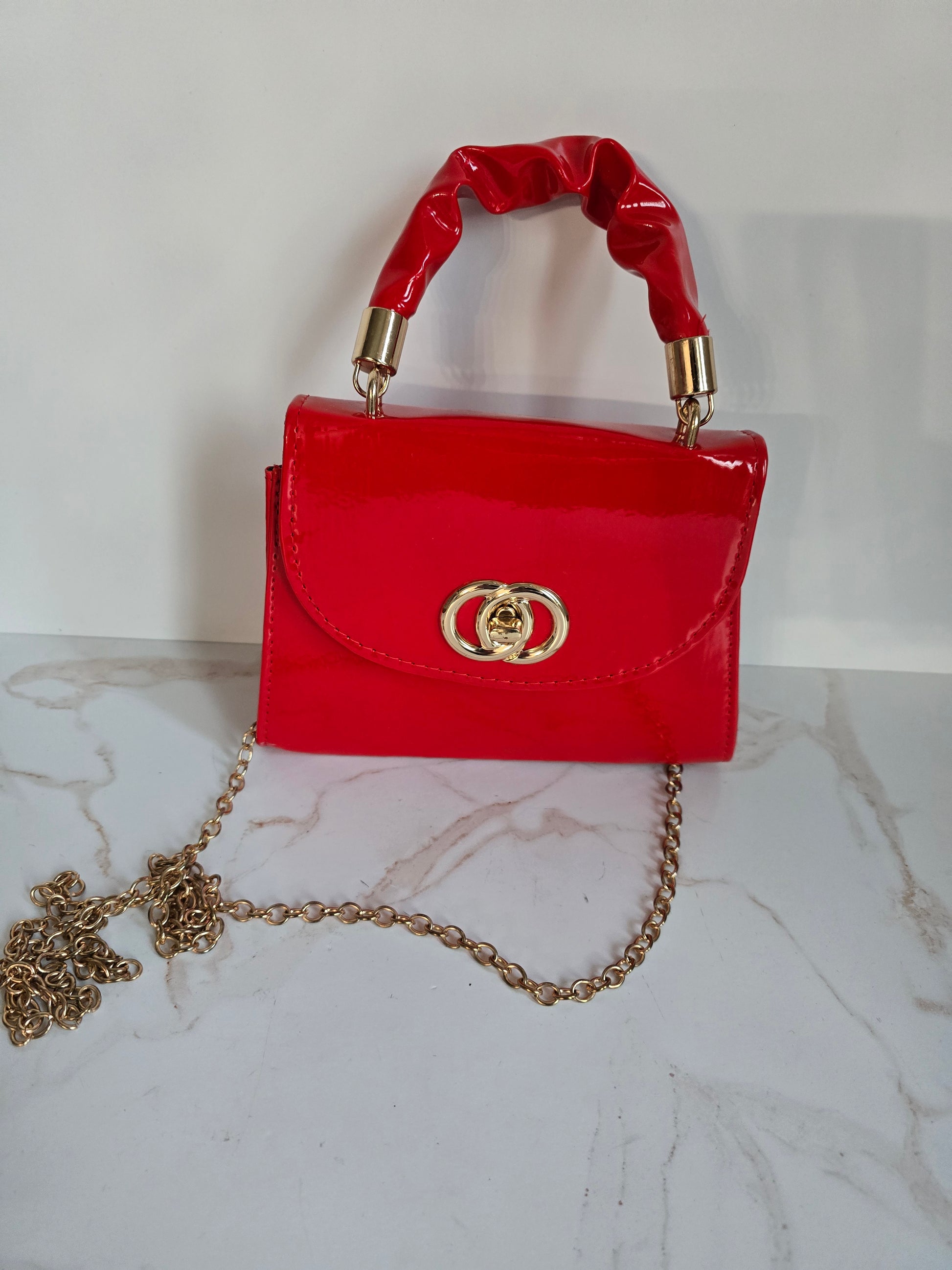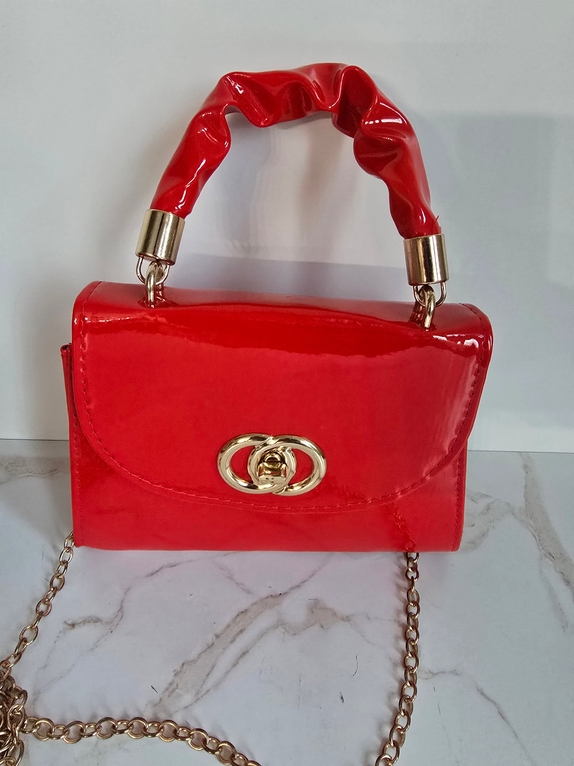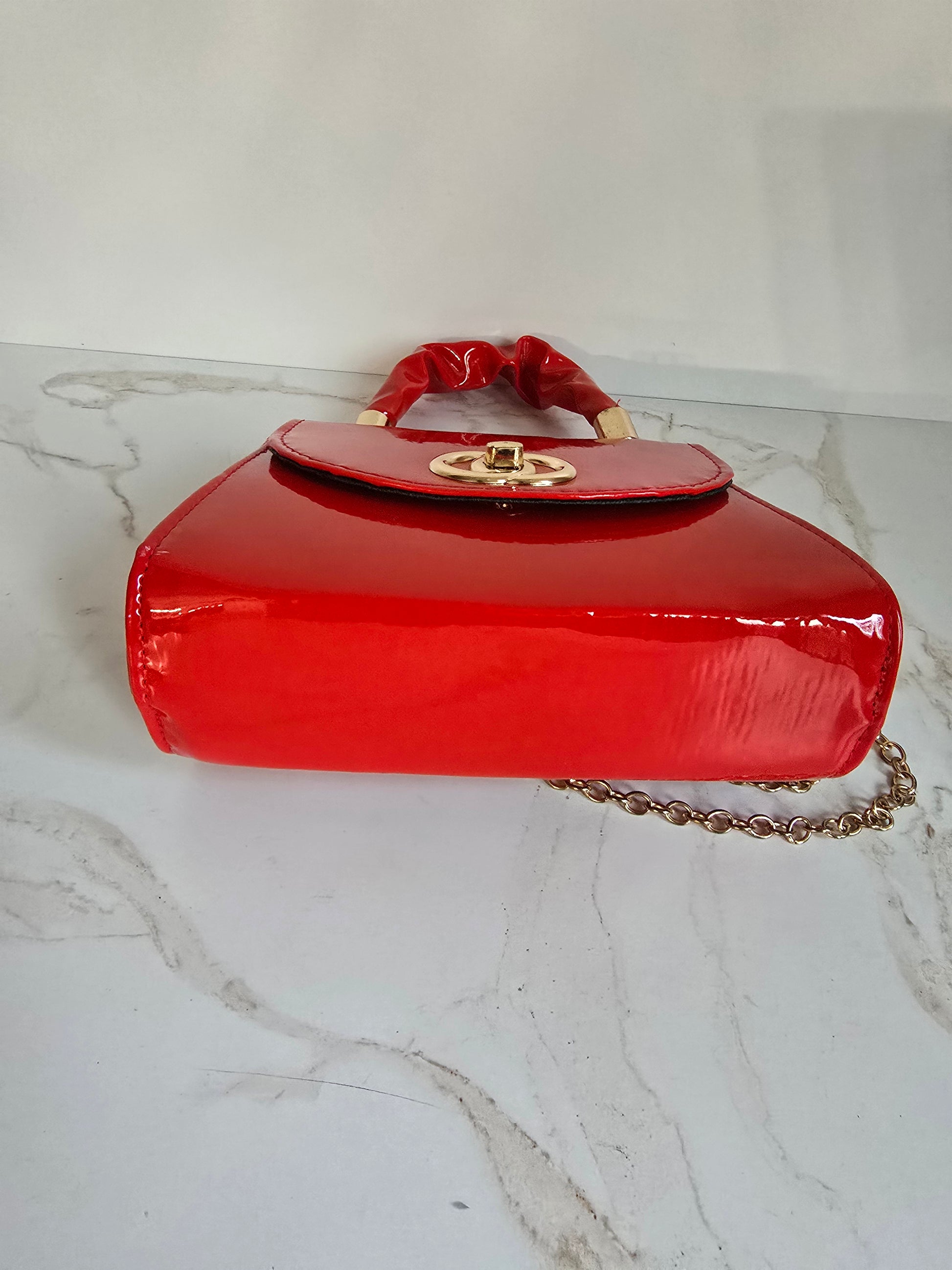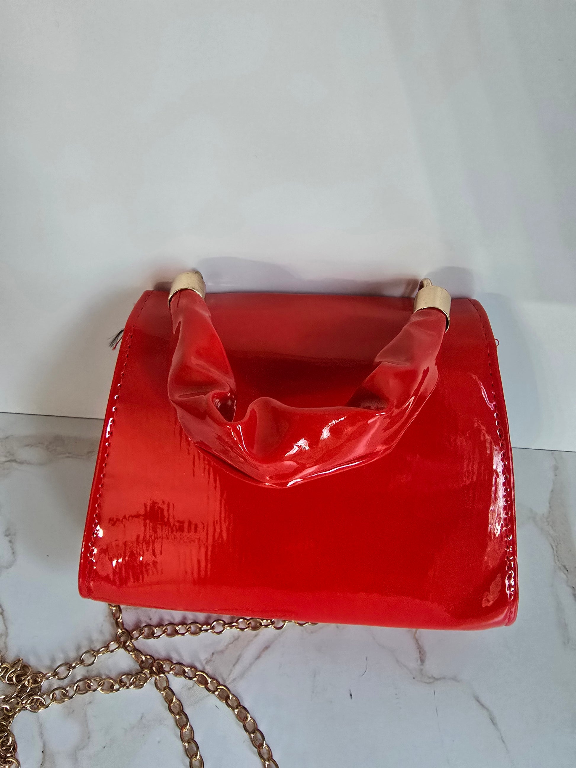 Get ready to turn heads with this stylish Red Faux Patent Mini Handbag! Its cute and compact design is perfect for carrying your essentials, while the gold hardware adds a touch of elegance. Whether you wear it on your wrist or shoulder, this versatile bag will make a statement wherever you go. (And it measures a convenient 8" x 7" x 3"!) NWOT.