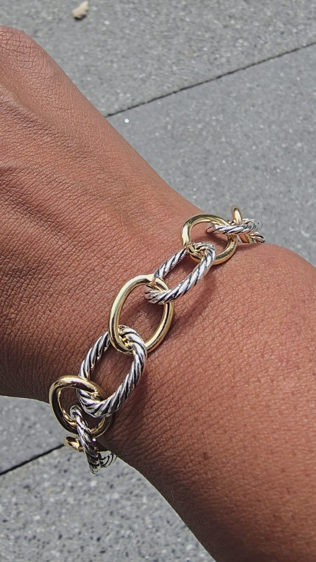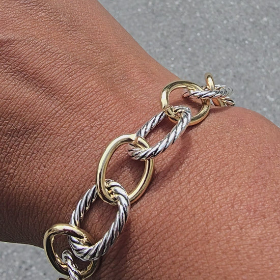 Indulge in sophistication with our Regina Stainless Steel Bracelet. The twisted stainless steel links with alternating silver cable and faux gold links exudes elegance and luxury. The 8.66" length allows for a comfortable fit, secured with a toggle closure. Elevate any outfit with this exclusive piece.