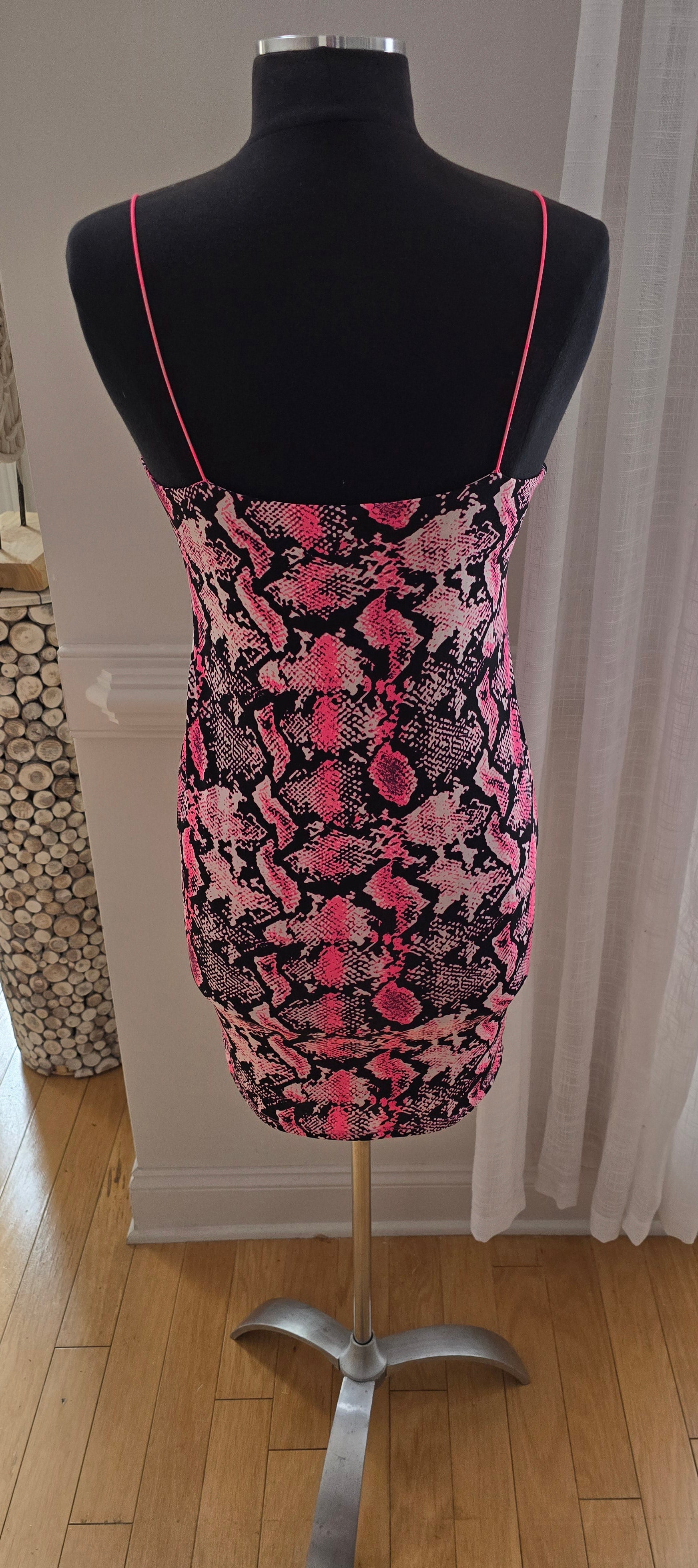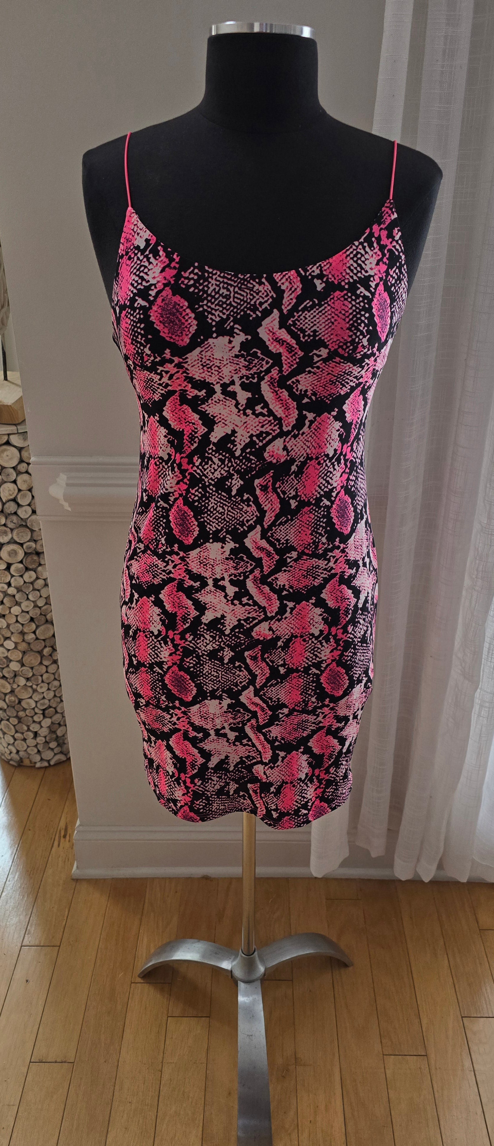 Unleash your wild side with our ReVamped Snakeprint Pink Dress! This fitted dress features a bold and daring pink snakeprint, perfect for those who love to take risks and make a statement. Lined for comfort, this fun dress is a must-have for any fashion-forward individual. PTP 17".