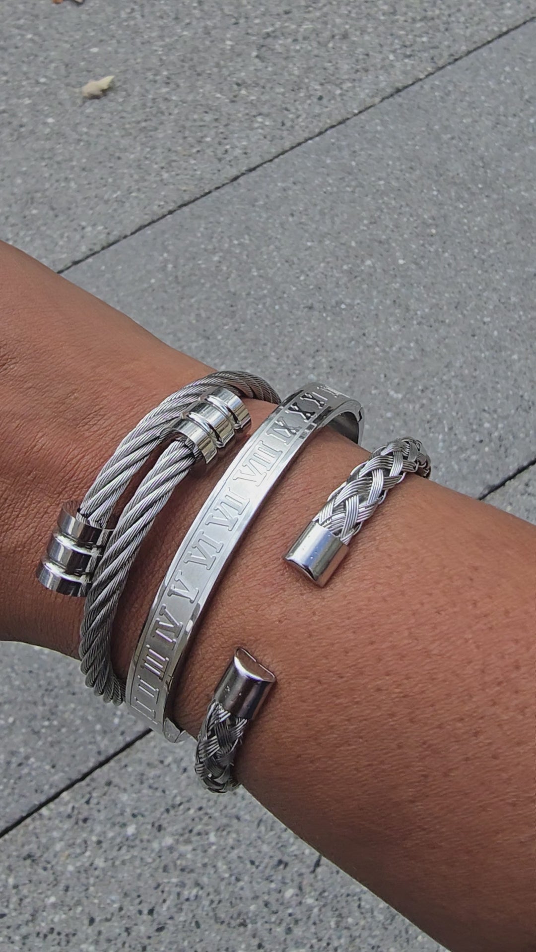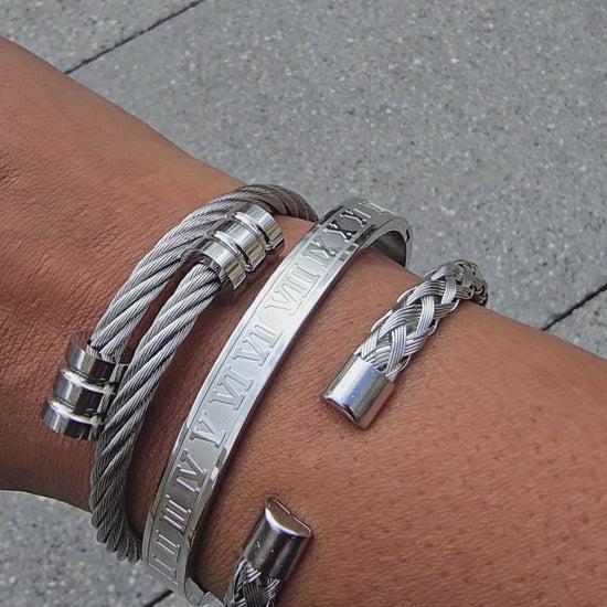 Enhance your wrist style with the Roma Luxe Trio. This stainless steel set includes a braided cuff, twisted cable cuff, and engraved bangle, representing strength, confidence, and enduring fashion. Perfect for daily wear or dressing up, these pieces resist tarnishing and can be worn individually or together. Fits a medium to large wrist best.