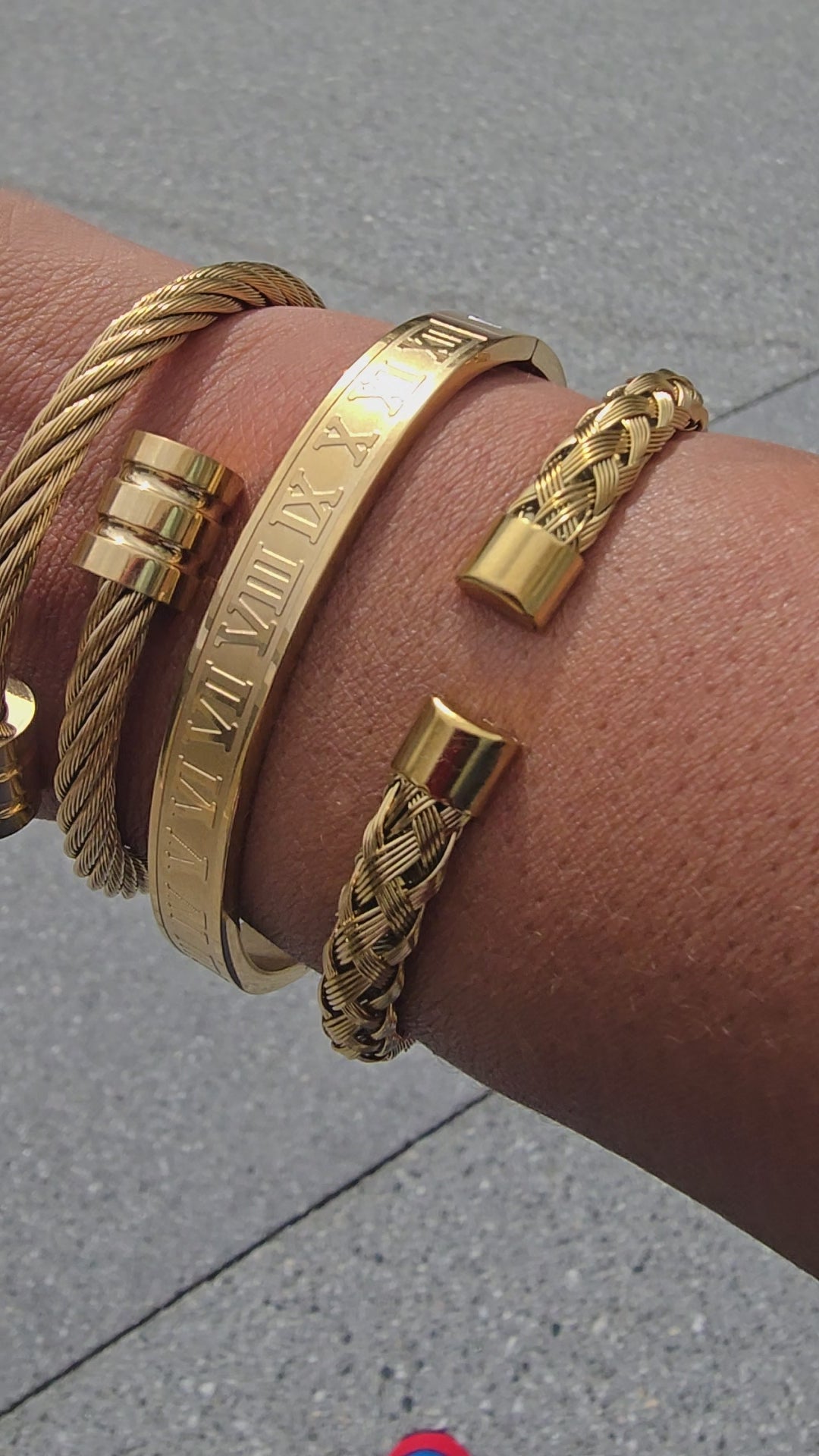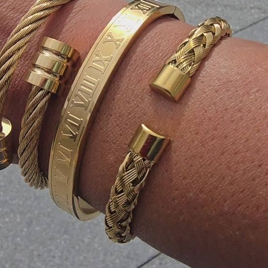 Enhance your wrist style with the Roma Luxe Trio. This stainless steel gold set includes a braided cuff, twisted cable cuff, and engraved bangle, representing strength, confidence, and enduring fashion. Perfect for daily wear or dressing up, these pieces resist tarnishing and can be worn individually or together. Fits a medium to large wrist best.