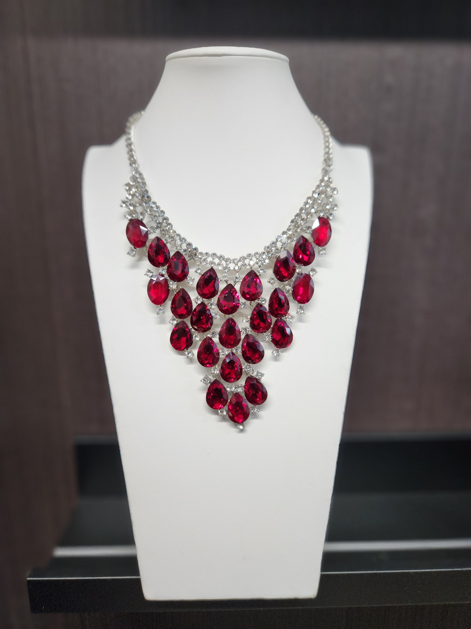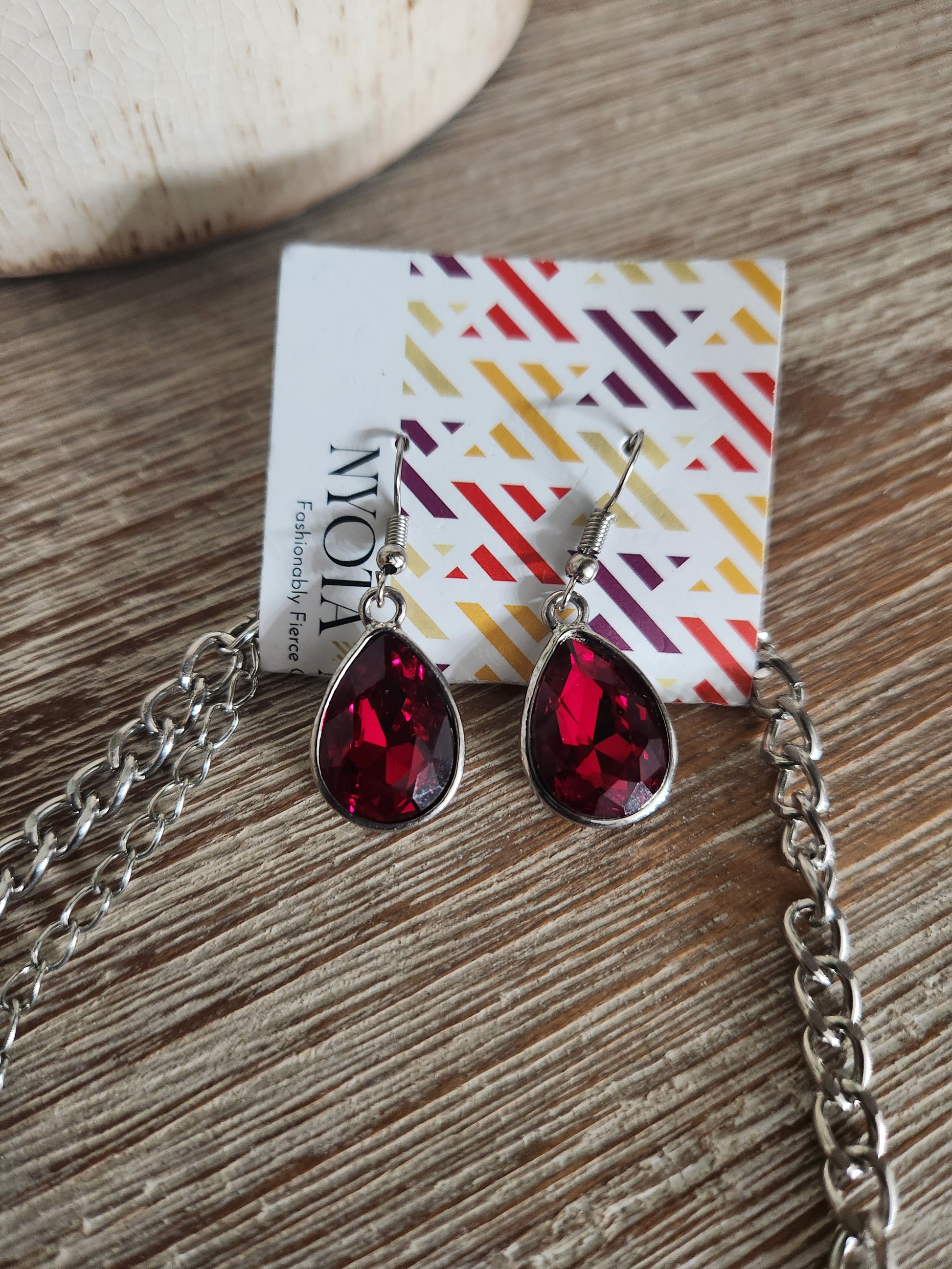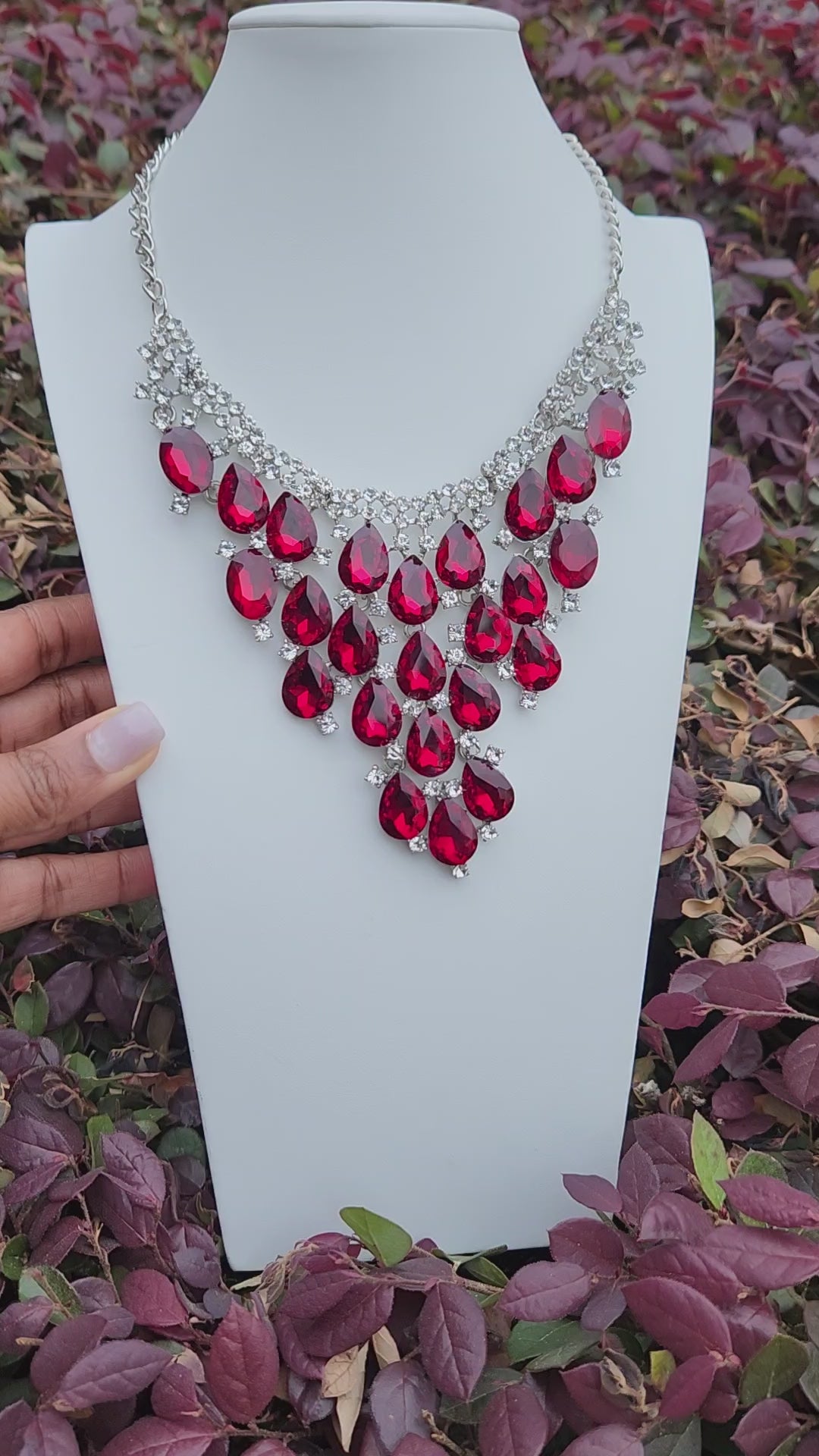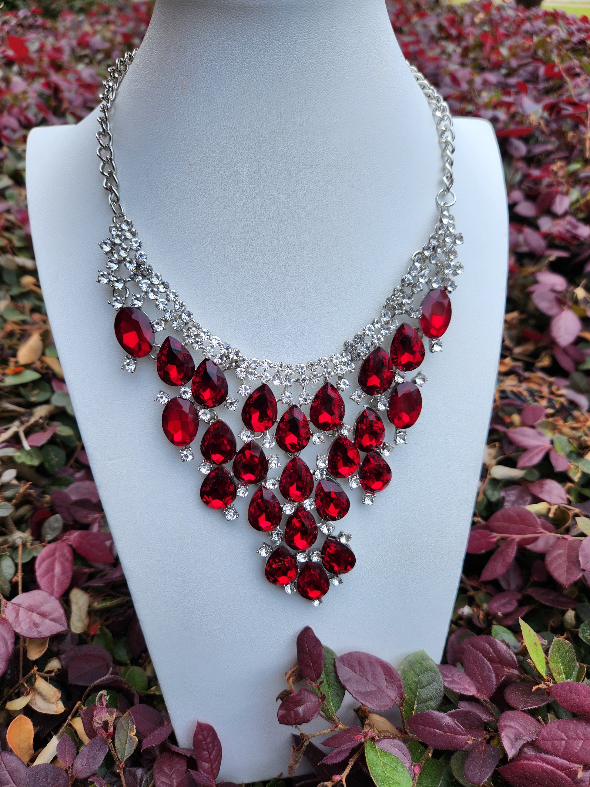 Elegant and bold red and clear stone cascading necklace set. Silvertone hardware. Necklace is 16" long with 3" extender. Includes earrings.