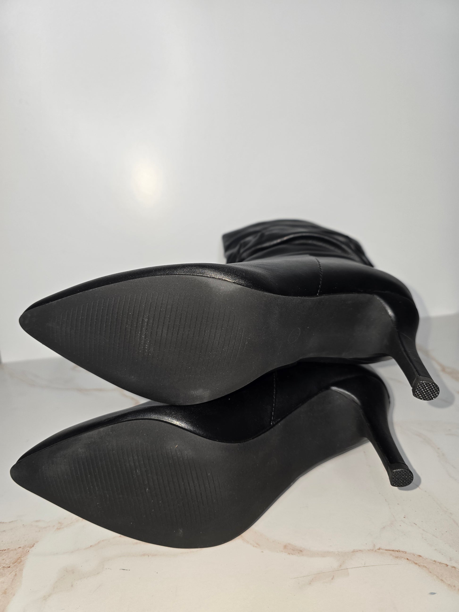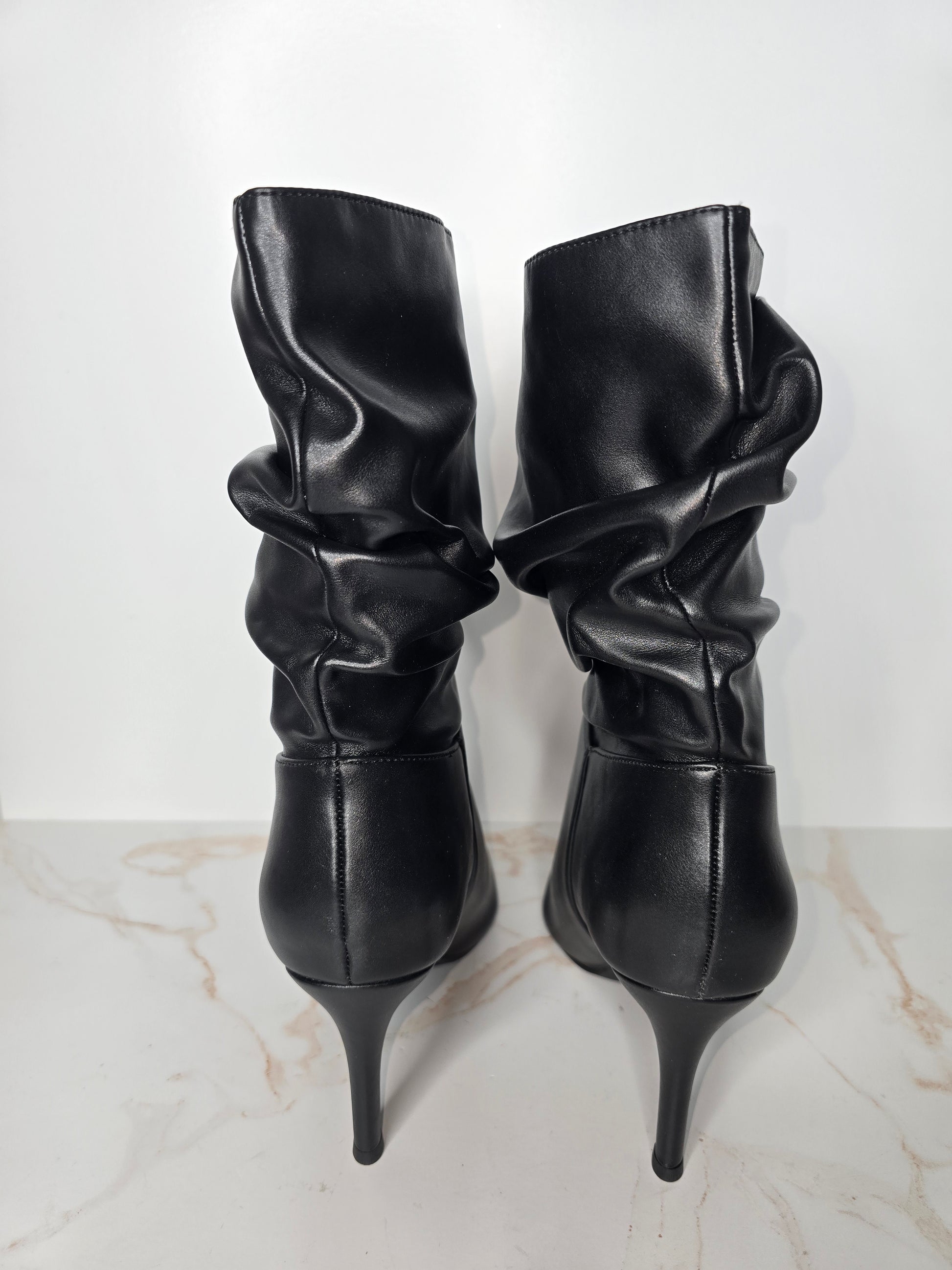 Ruched Faux Leather Black Pointy Toe Boot Sz 6.5