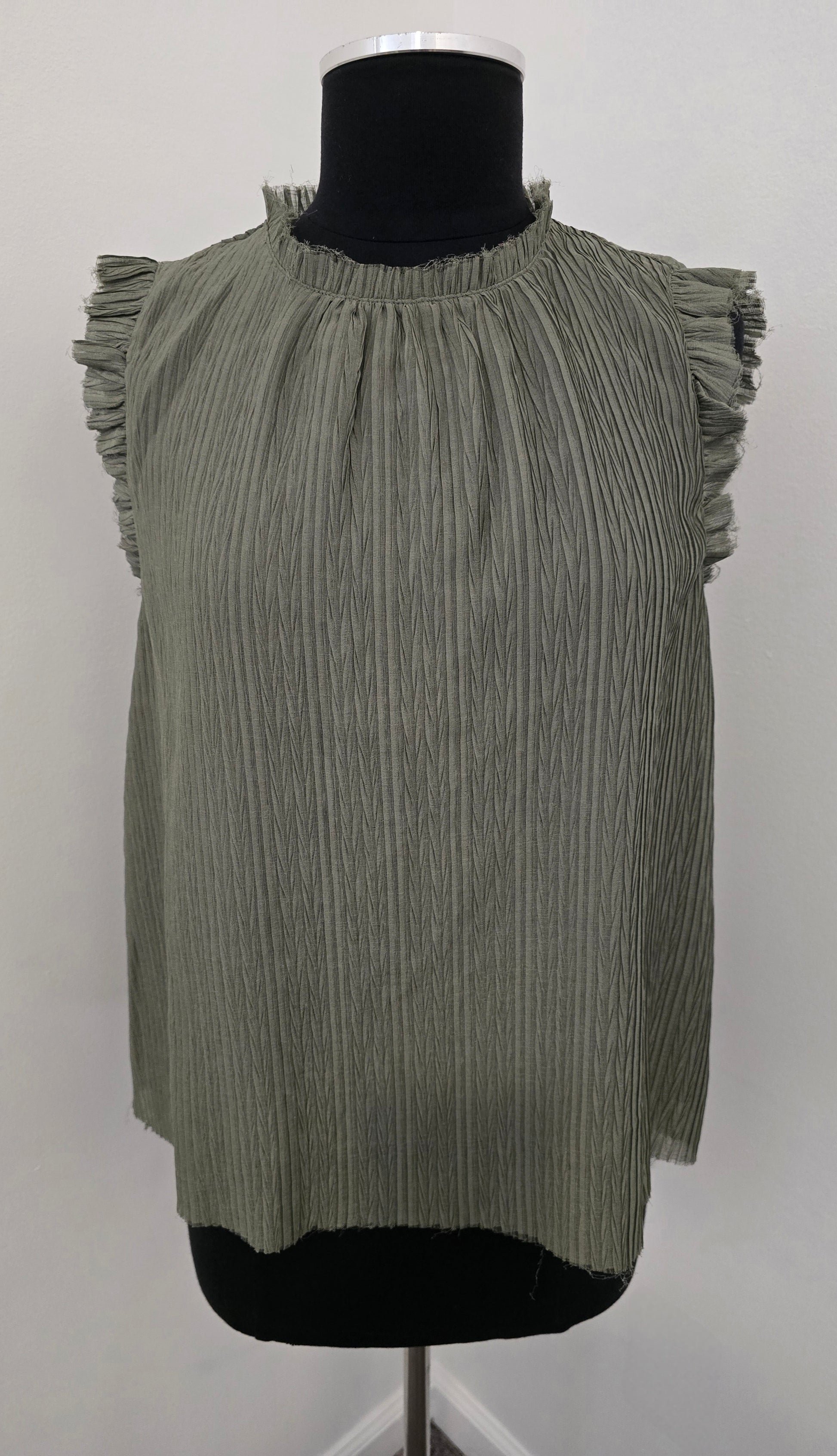 Feel fabulous in this Semi Sheer Olive Ruffled Blouse! With cute frayed hems and textured fabric, this NWOT top will make you stand out from the crowd. The front is lined for coverage while the back remains sheer for a flirty touch. Made with stretchy polyester, it will fit sizes S-L (PTP 20" flat).