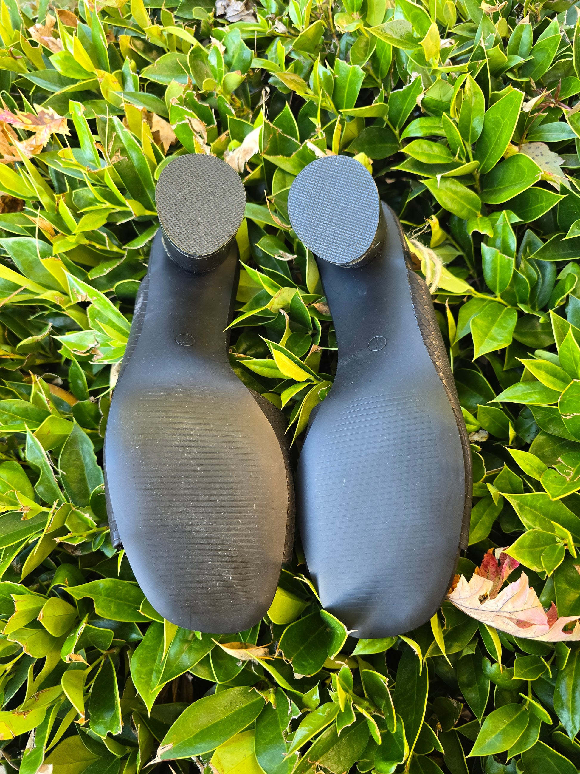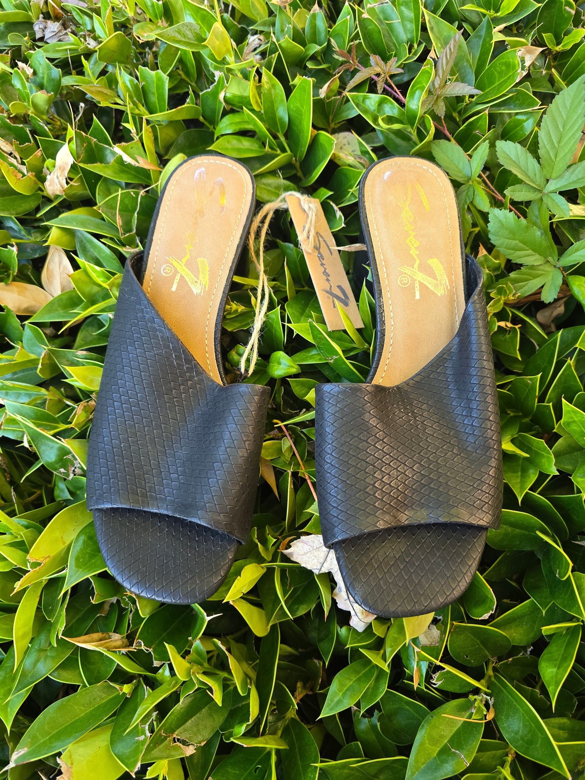 Enjoy style and comfort with these Seven7 Vera mules in black faux leather. Easy to slip on and with a mid-heel height, they provide all-day support. The animal print and snake theme add fashionable flair to any casual outfit. Breathable outsole and cone heel complete the perfect look. Heel height 2 1/2". NWOB.