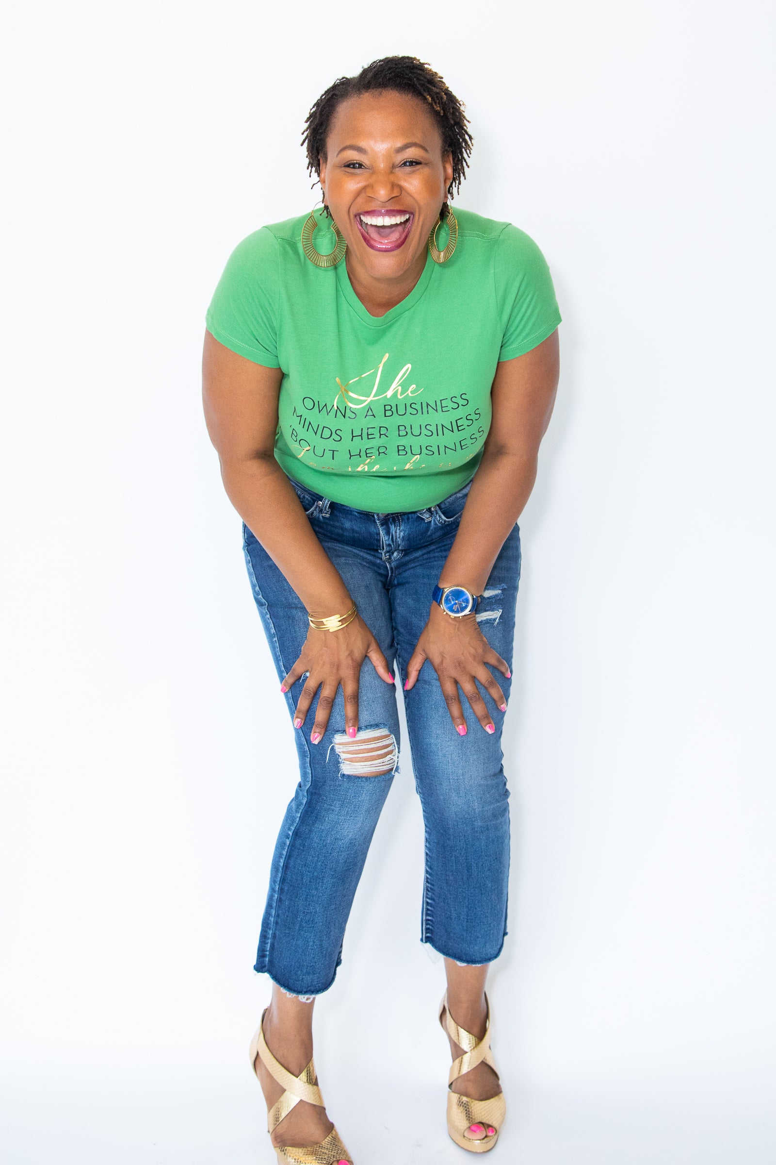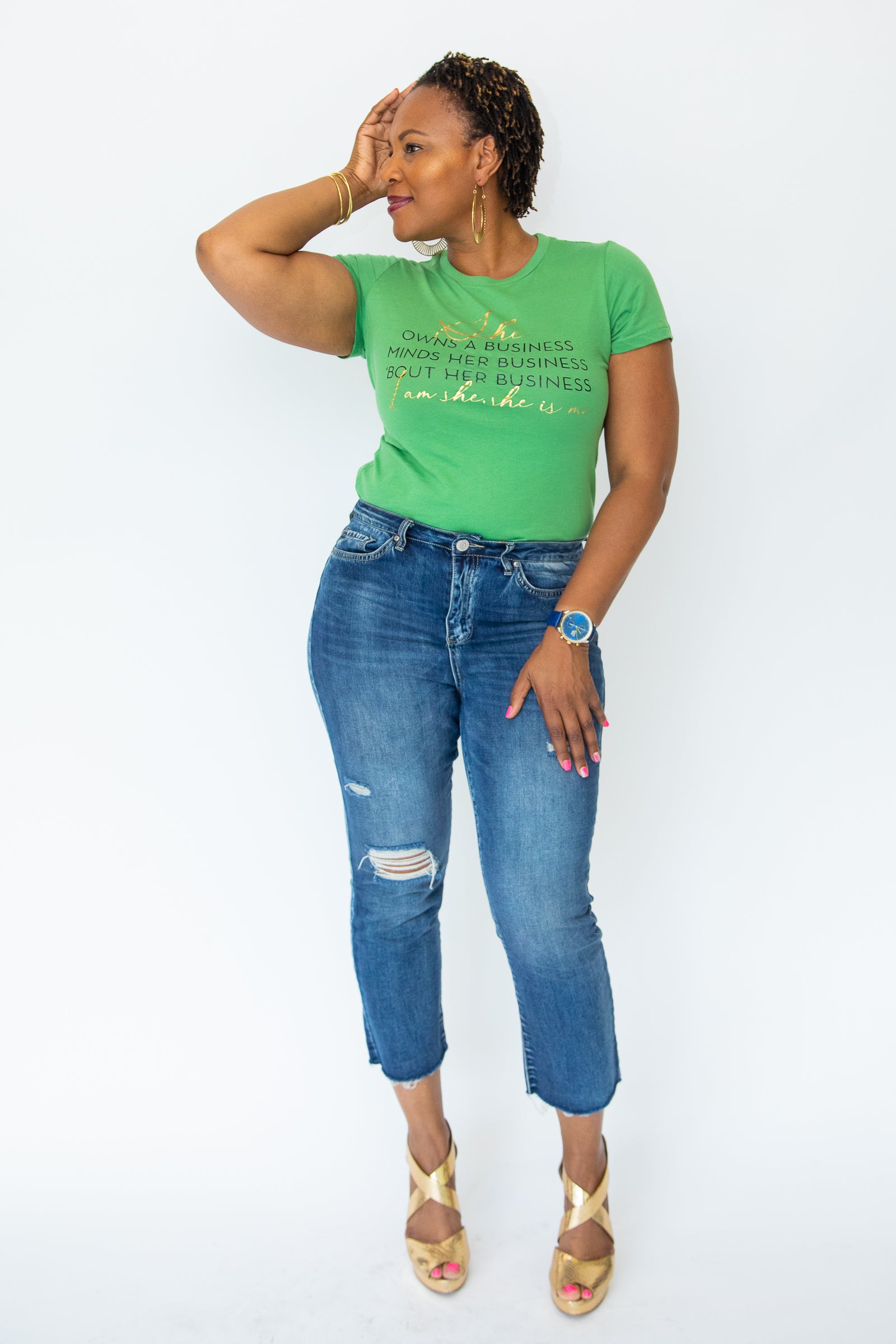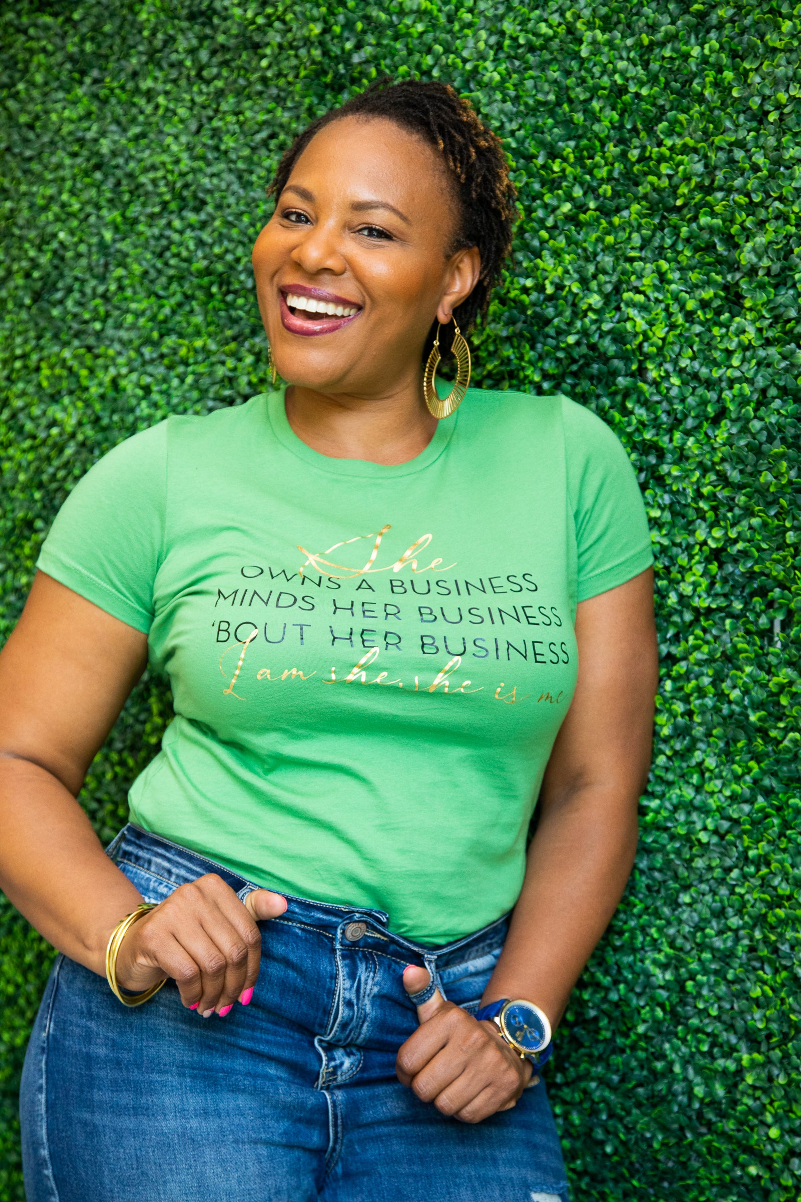 "She Owns A Business, She Minds Her Business, Bout Her Business, I Am She, She is Me" t-shirt. The perfect tee for women business owners. Fitted cut women's tee.