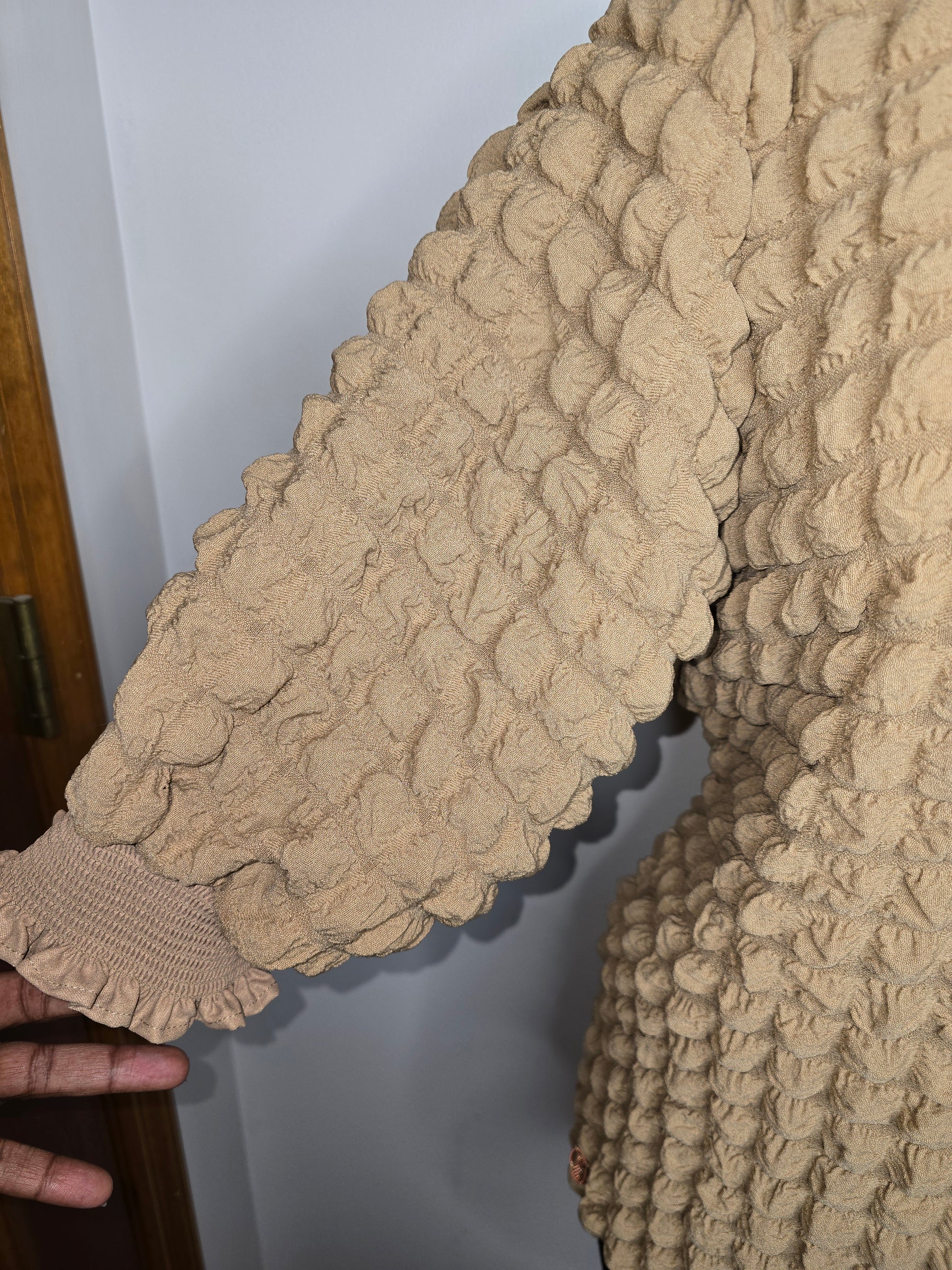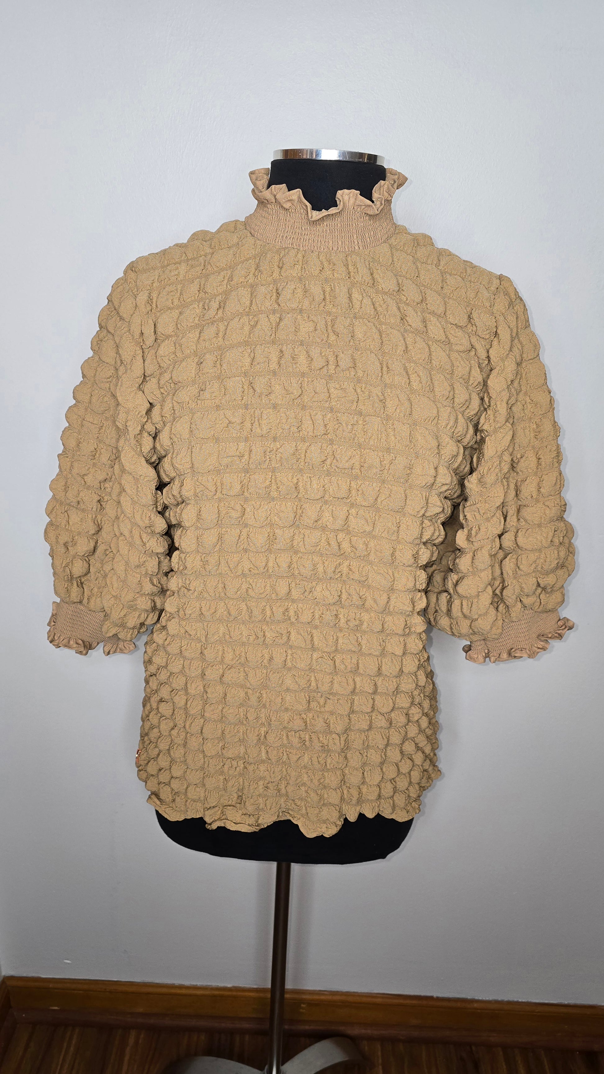 Indulge in luxury with our Simply Southern Bubble Top in Brown. This NWT top features a comfortable stretch fabric with elegant elastic details at the neck and cuffs. Effortlessly stylish and sophisticated, it's the perfect addition to your wardrobe. Roomy top.