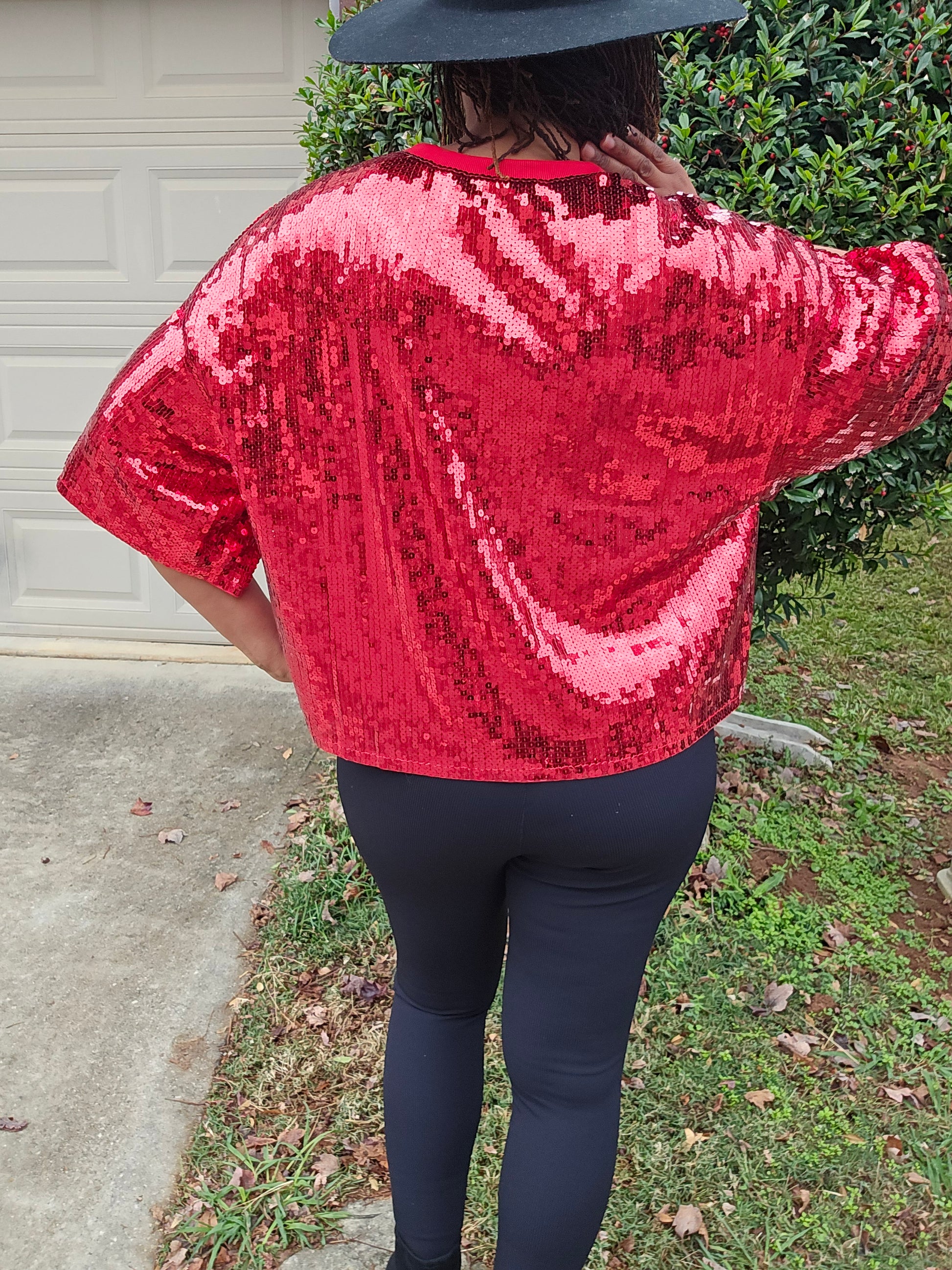 Add some sparkle to your holiday wardrobe with this sequined crop top featuring a stylish bow. Stay comfortable and festive with its lining, and pair it with any bottoms for a versatile festive look. Brand new with tags. Sequins on front and back.