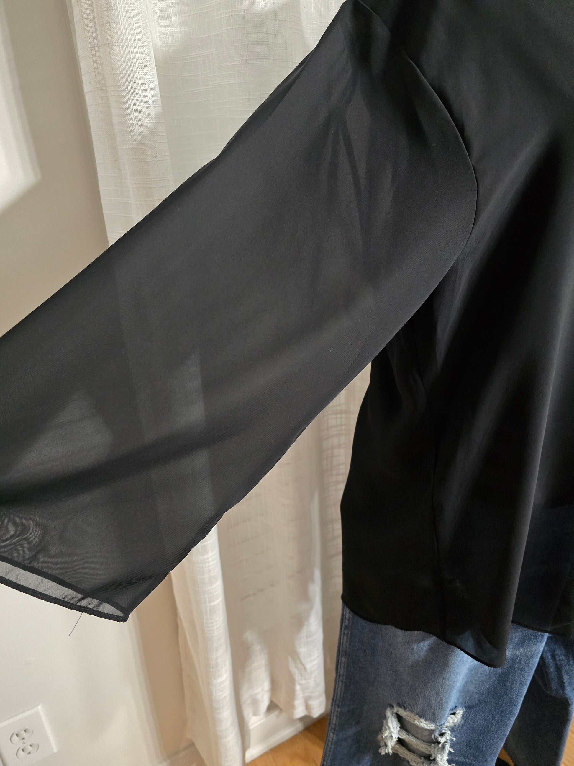 Elevate your boho style with our pre-loved black blouse from Soft Surroundings. Featuring a sheer design with t-shirt lining, this comfy blouse is perfect for any occasion. Button on the back adds a unique touch to this must-have piece.
