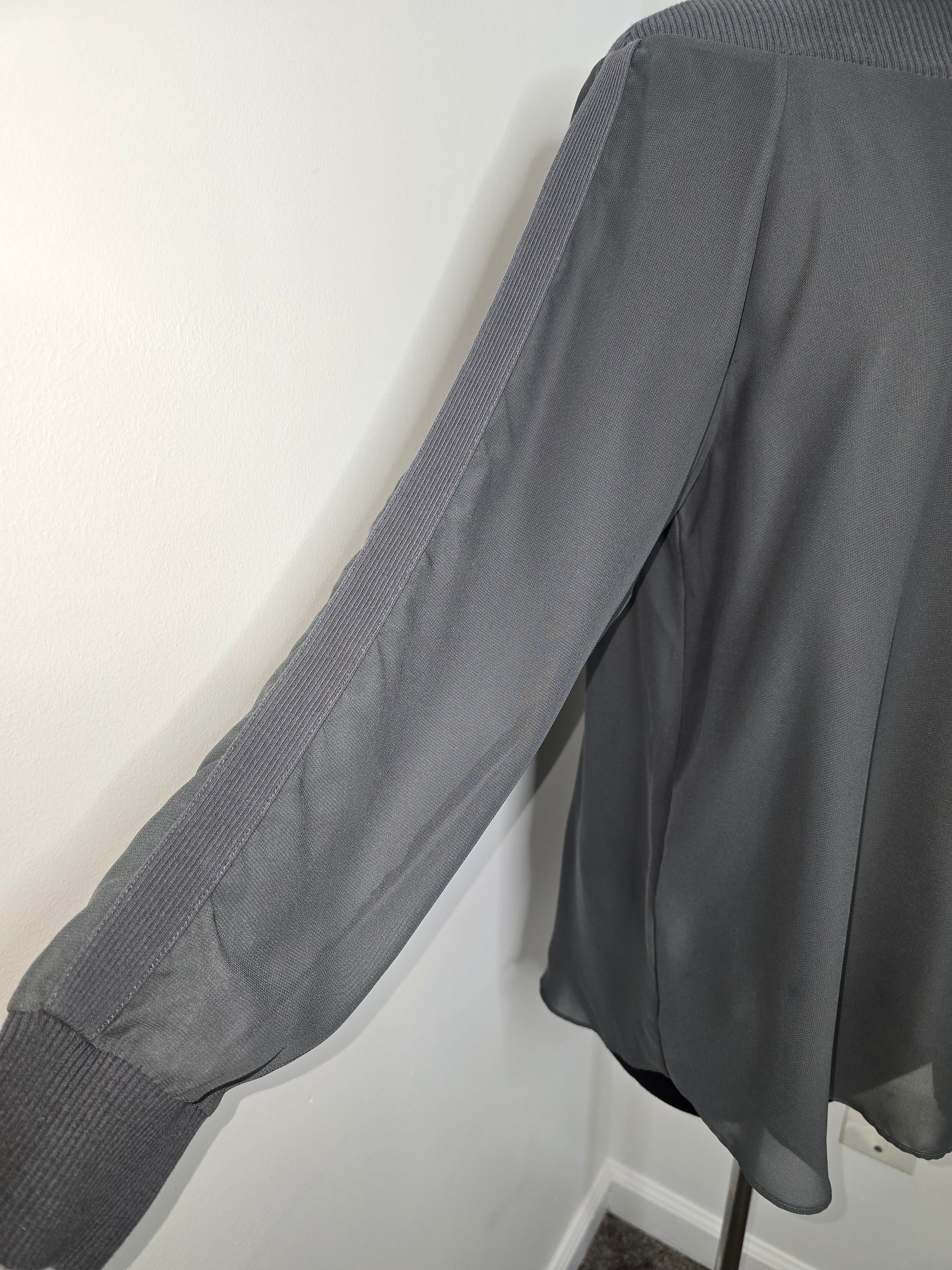 Elevate your wardrobe with our Soft Surroundings Grey Boat neck Blouse. The chiffon material exudes chic and sophistication while the knit accents add a touch of elegant detail. Lined with a blend of cotton, modal, and spandex, this blouse offers both style and comfort. In excellent pre-loved condition.