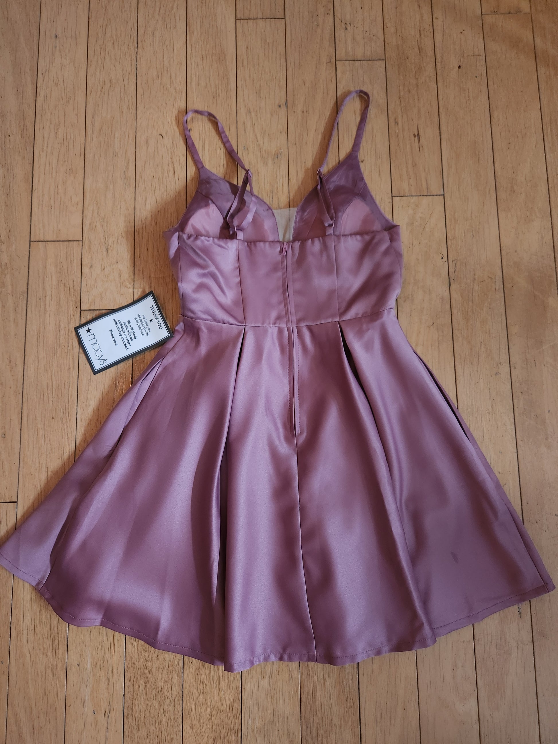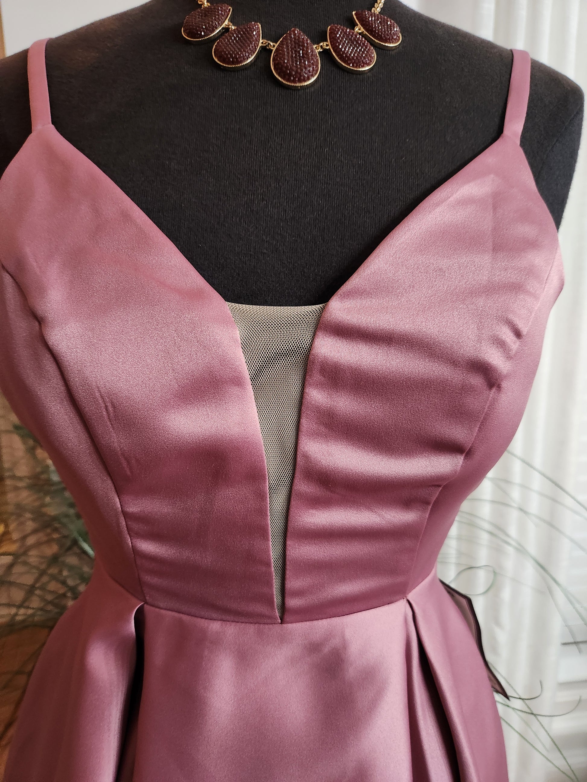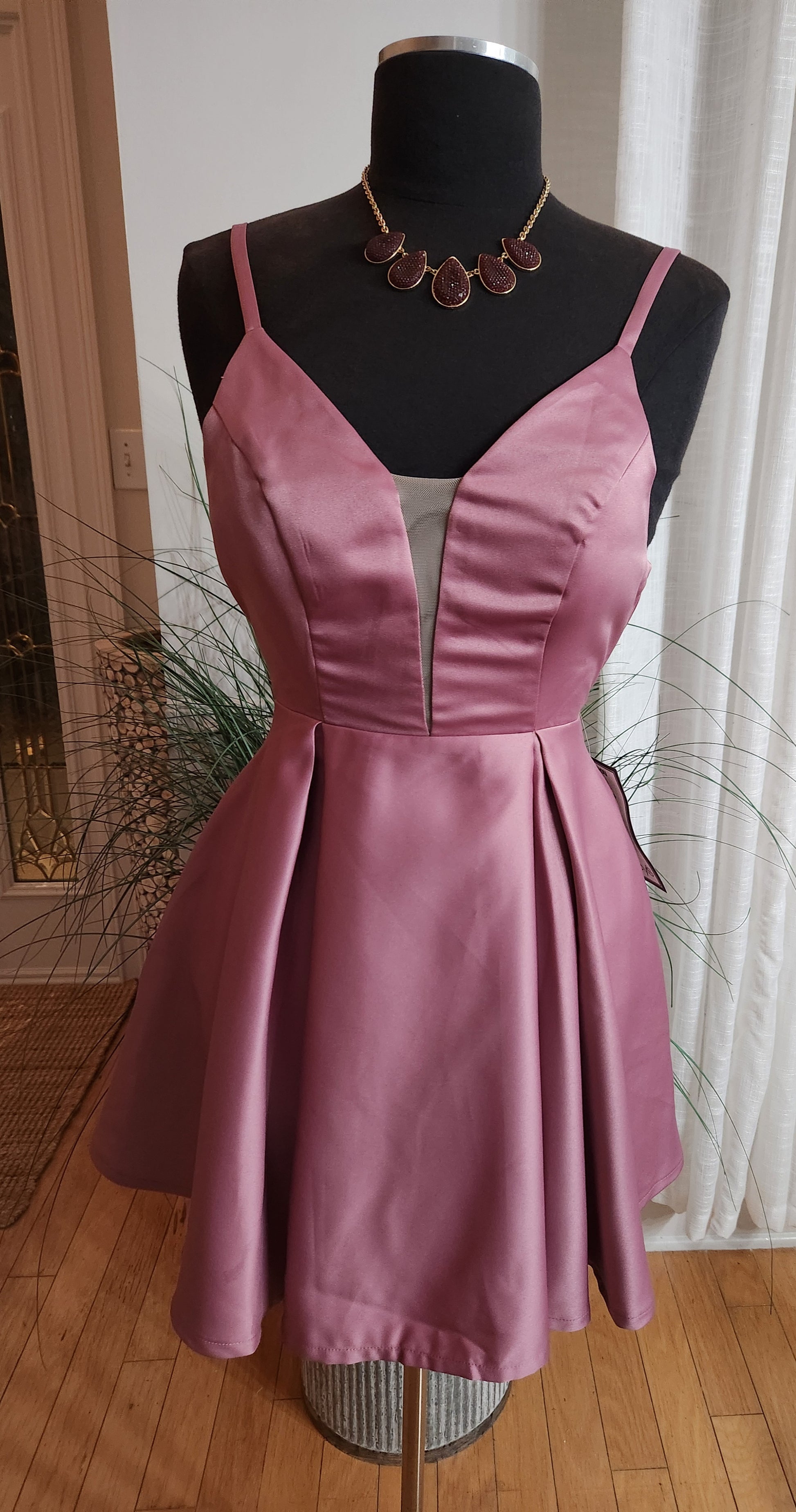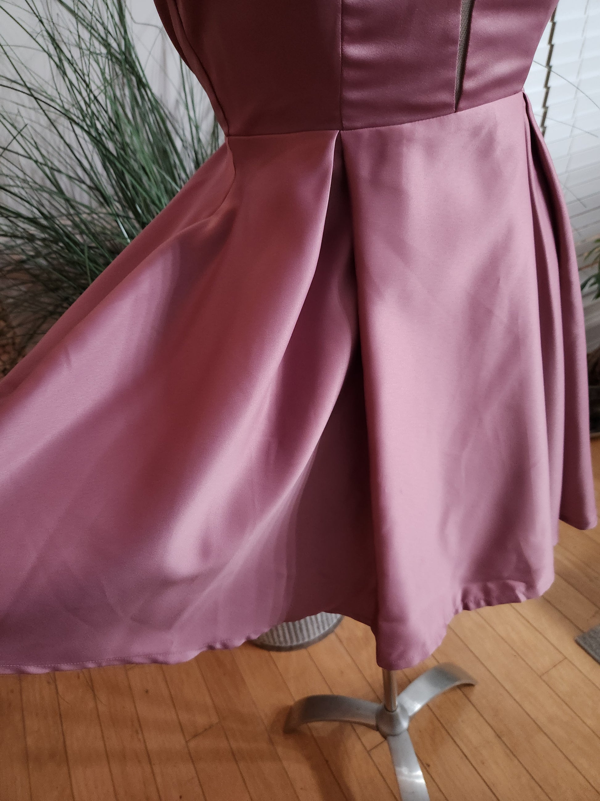 V-neck cocktail dress with pockets. A-line sleeveless and padded bust.