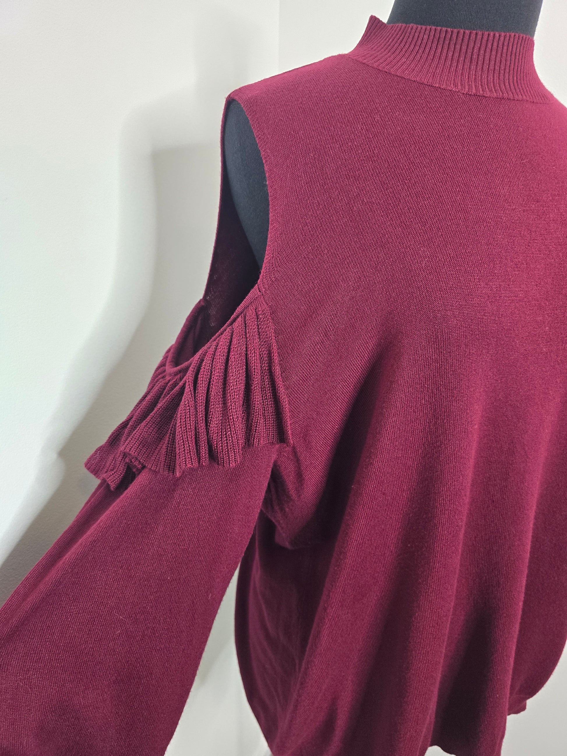 Luxurious Fashion To Figure Cold Shoulder Ruffle Sleeve Sweater in cranberry. This size 3X sweater features a mock turtle neck, stretch fabric of 70% rayon and 30% nylon, and elegant ruffle sleeves. Stay warm and fashionable in this sophisticated piece. Pre-loved on excellent condition.