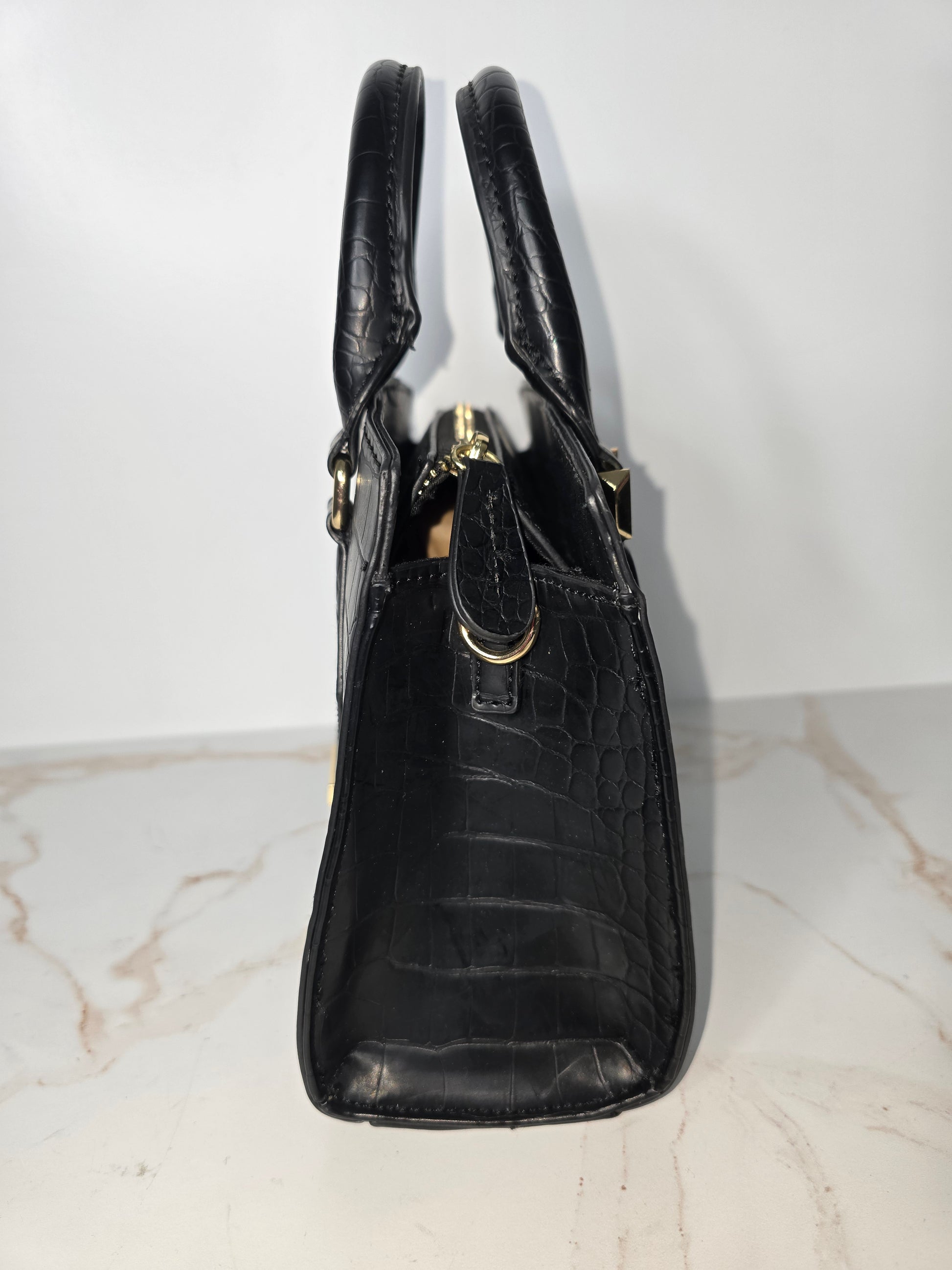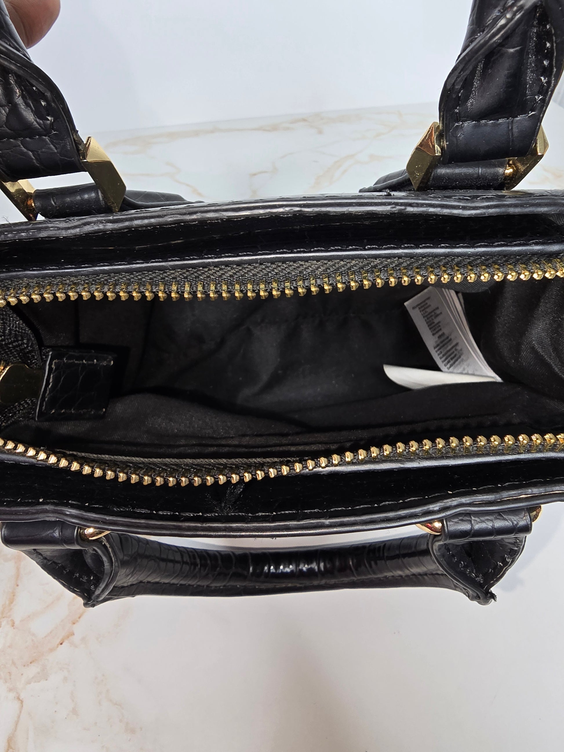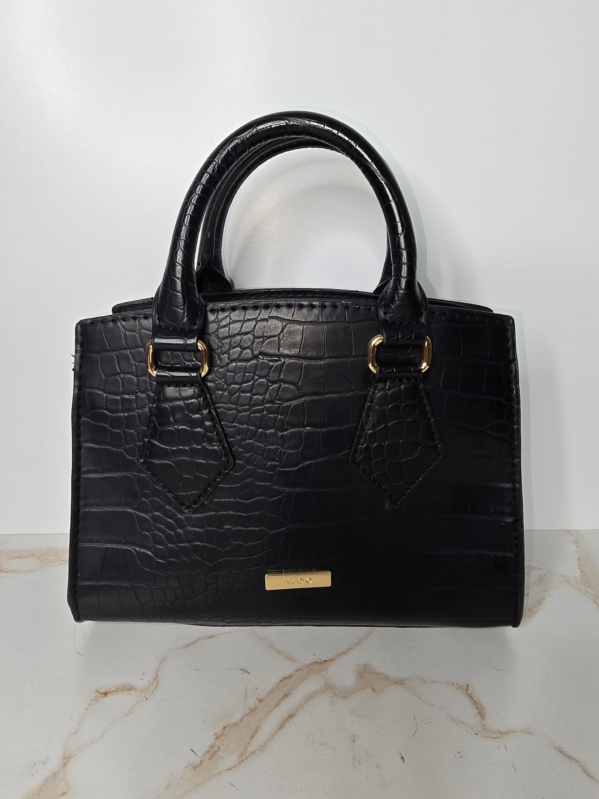 This Aldo Black Faux Skin Mini Handbag features stylish gold hardware and a darling mini size that adds a touch of cuteness to any outfit. A must-have accessory for any fashion-forward individual looking to make a statement.