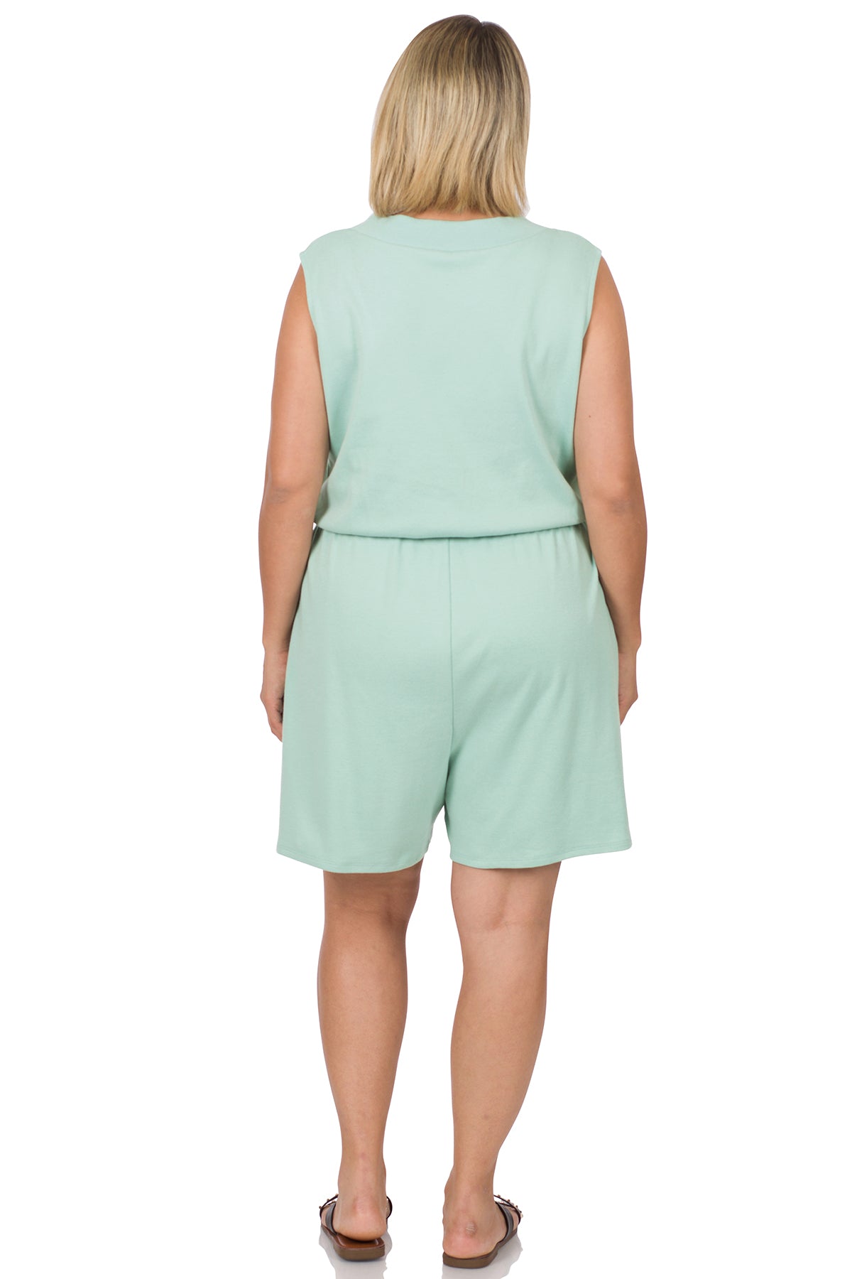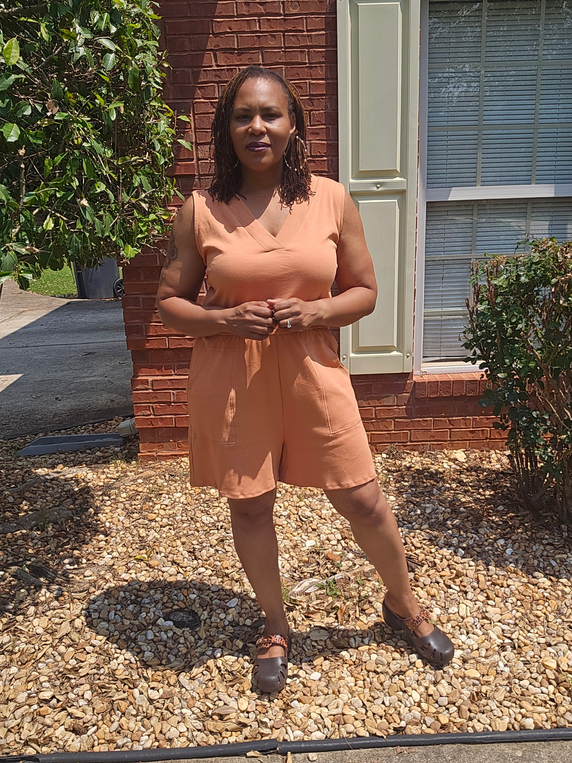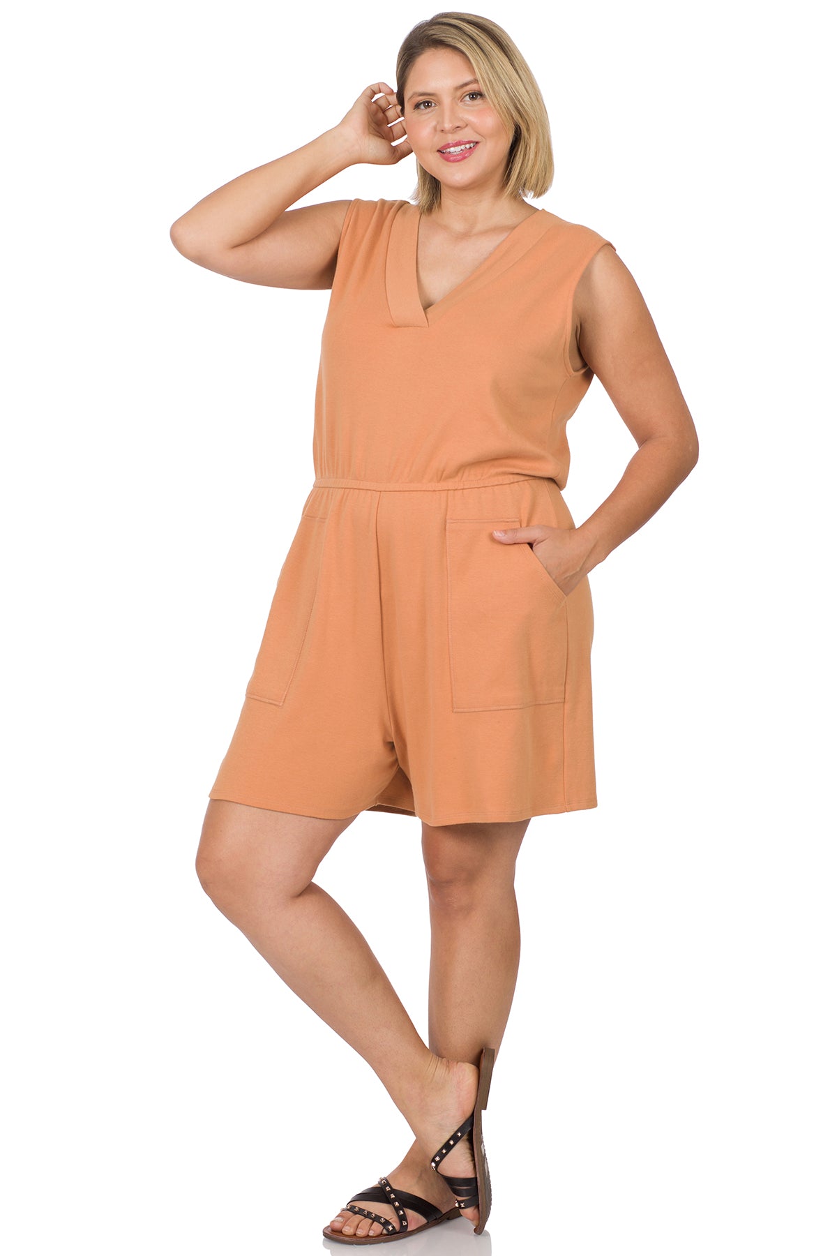 Stay comfortable all day in our V-Neck Butter Orange Romper. Made with soft, breathable cotton, this sleeveless romper features oversized pockets, an elastic waist, and a ribbed V-neck for a cozy fit. Perfect for any plus size fashionista looking for style and comfort.