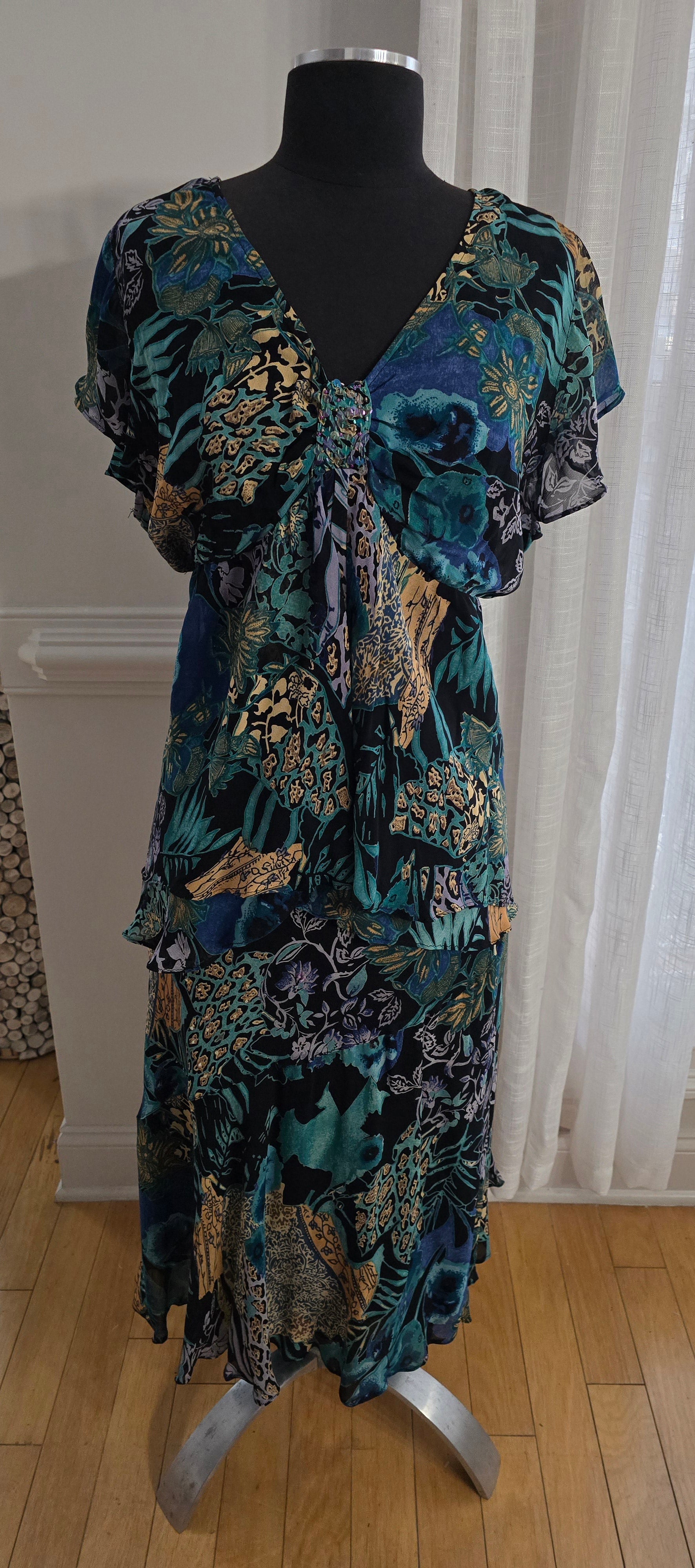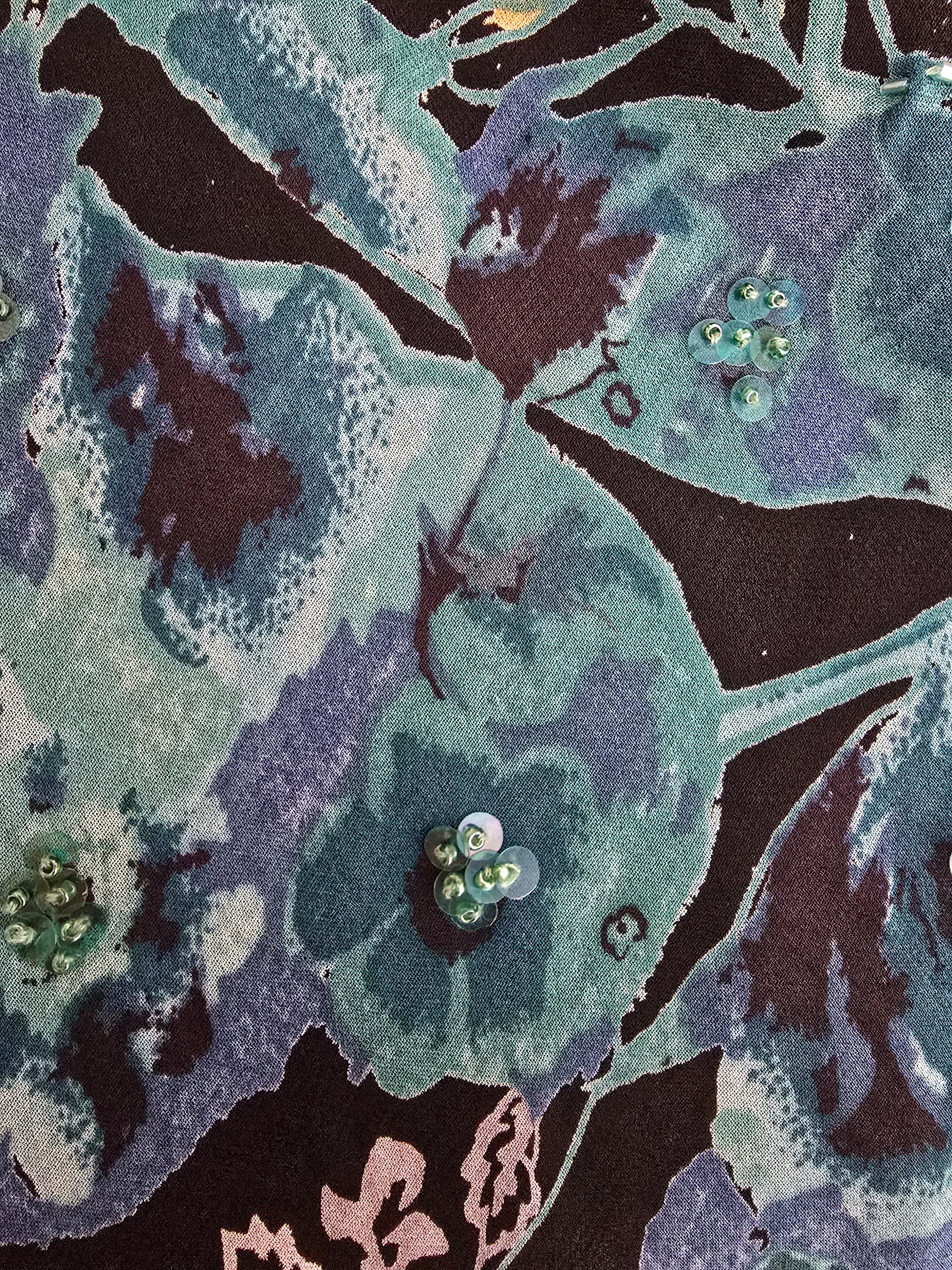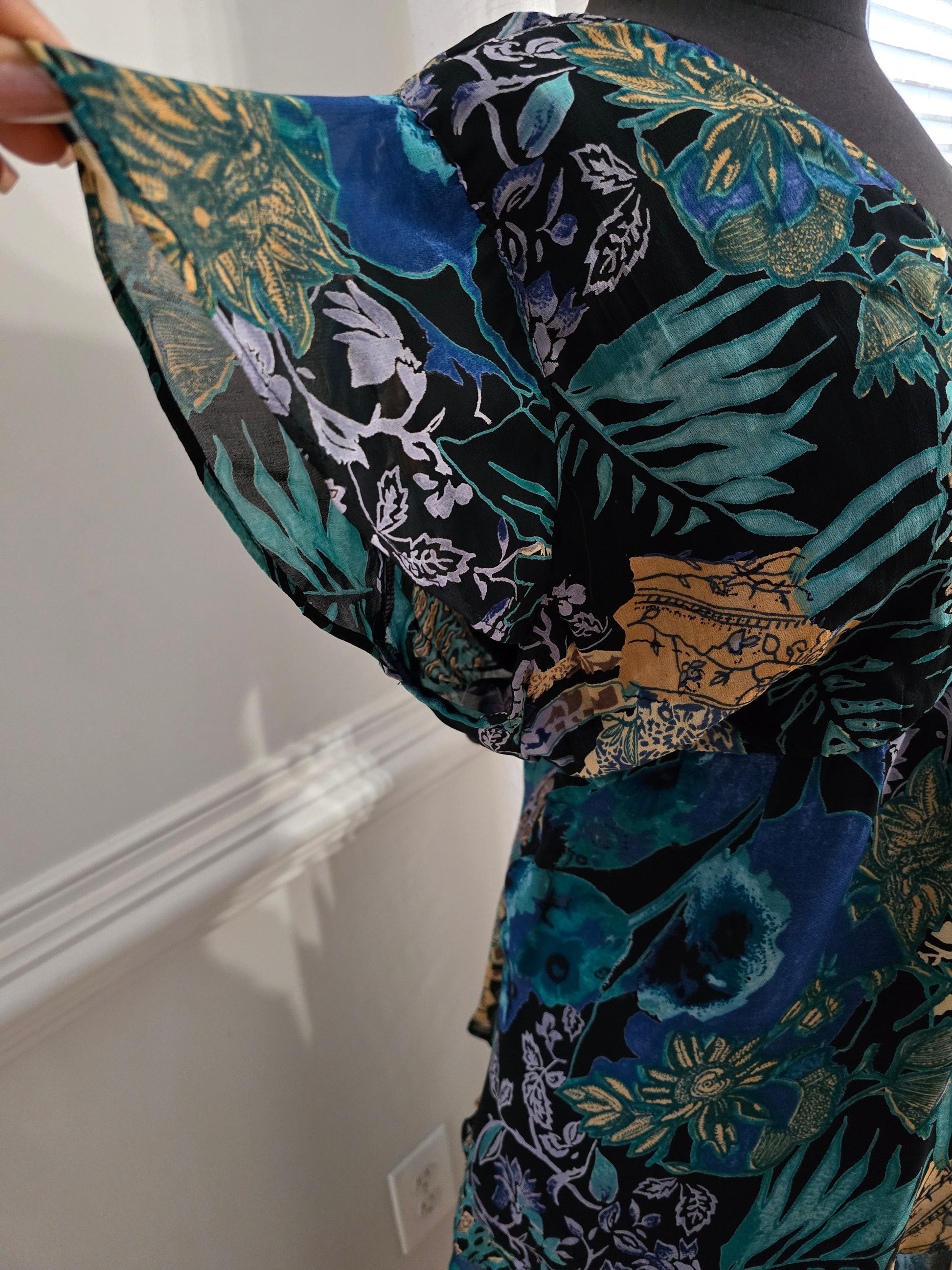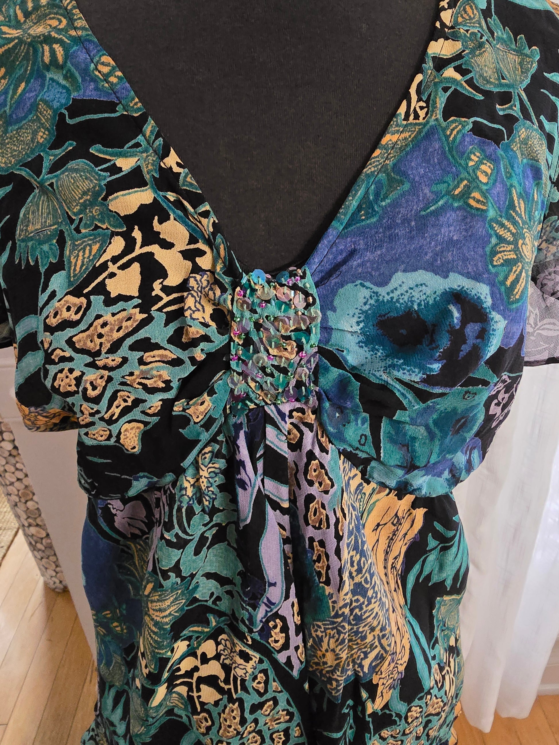 Vintage Rouge Two Piece Set Sz XXL. This pre-loved lined skirt set features a rayon blouse and skirt with a stunning sequin detail. Top has fluttered sleeves and layered design. Embrace sophistication and elevate your style.